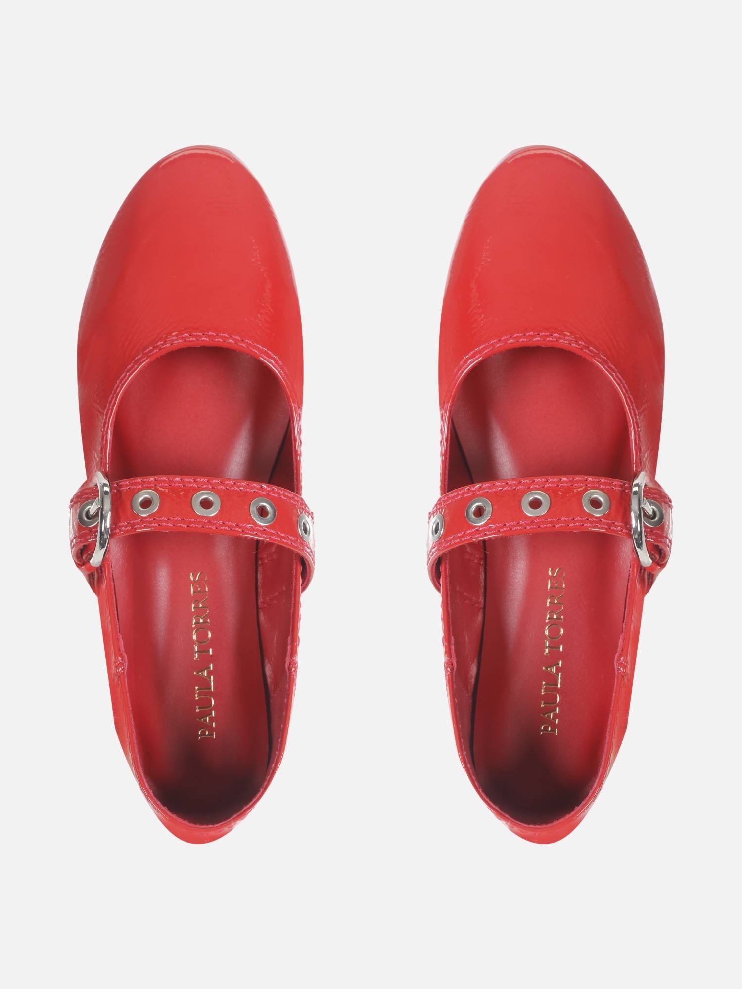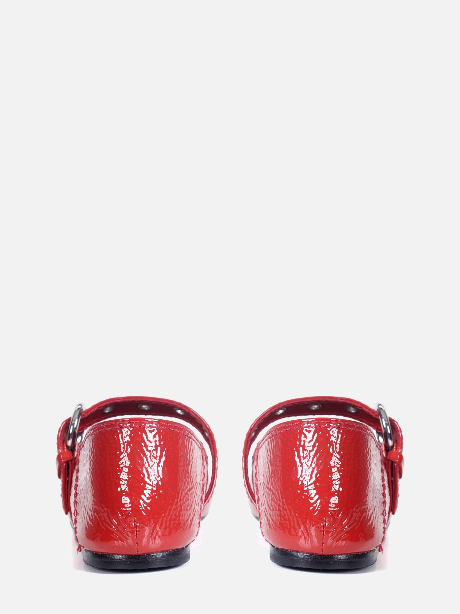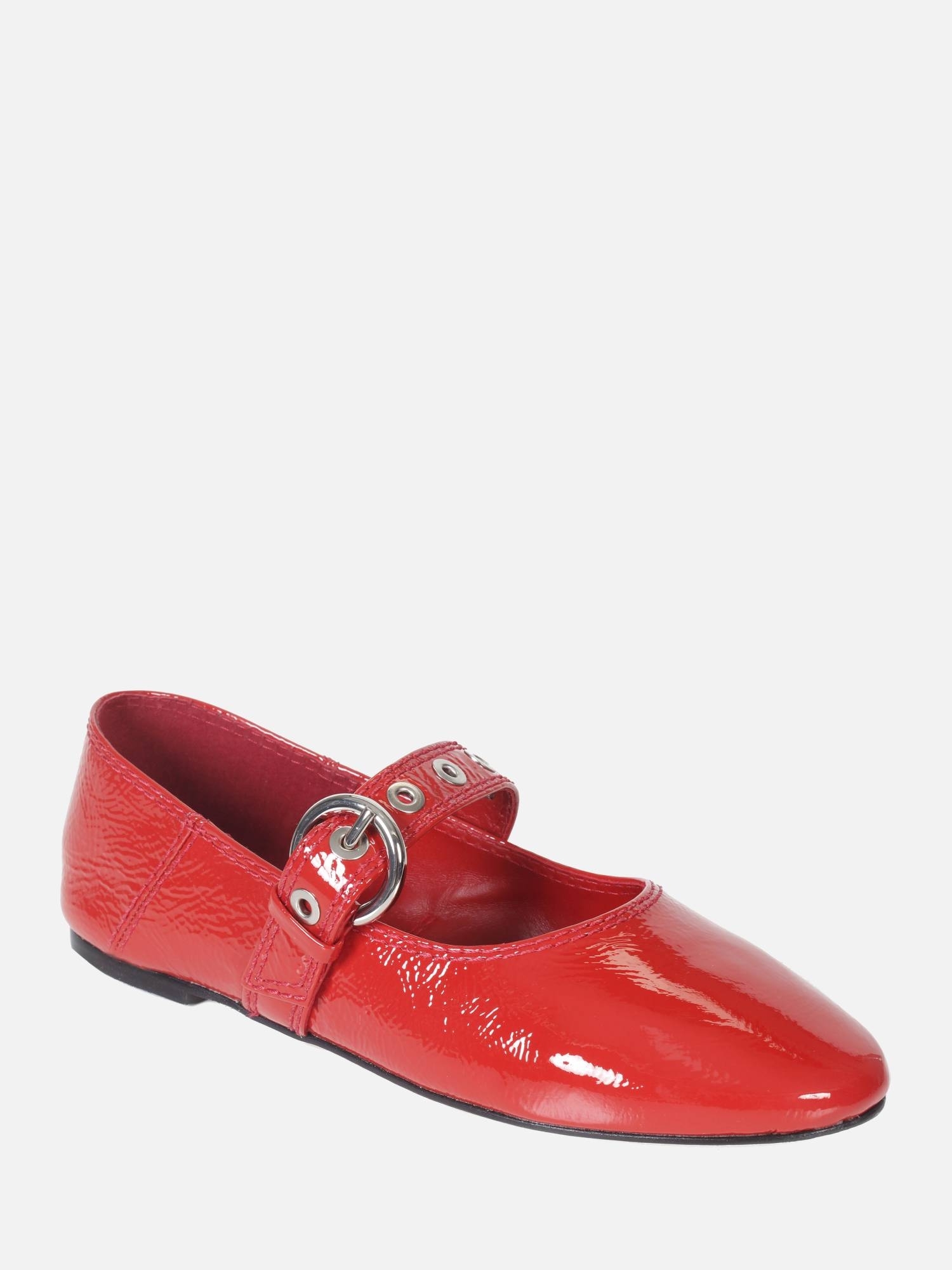 A Sapatilha Cloe é confeccionada em couro verniz show com acabamento amassado, que adiciona textura e estilo. O modelo de bico arredondado conta com uma tira ajustável sobre o peito do pé, decorada com ilhoses em níquel e uma sofisticada fivela lateral. O solado em couro reforça a qualidade e a durabilidade do design.