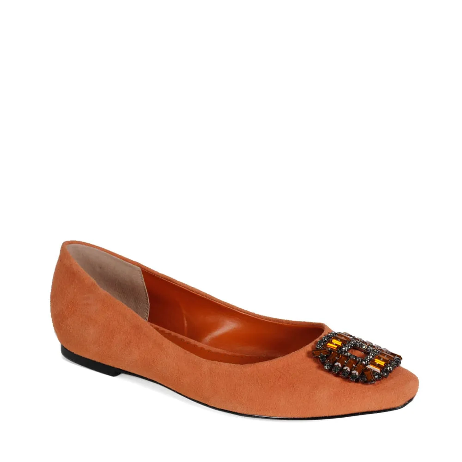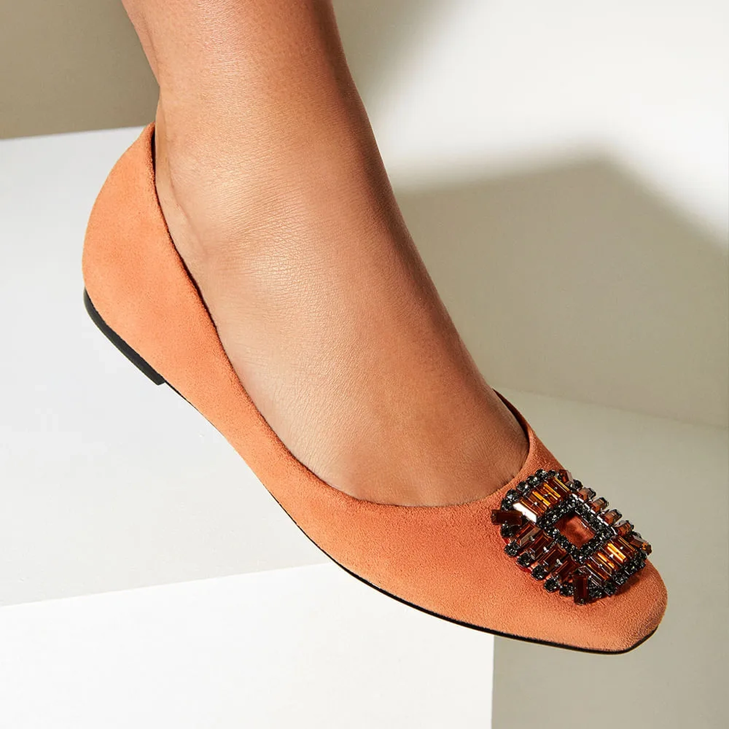 A Sapatilha Dulce é confeccionada em camurça. Modelagem em bico quadrado com o diferencial das pedras aplicadas manualmente, formando um quadrado, que harmoniza com o modelo exclusivo Paula Torres.