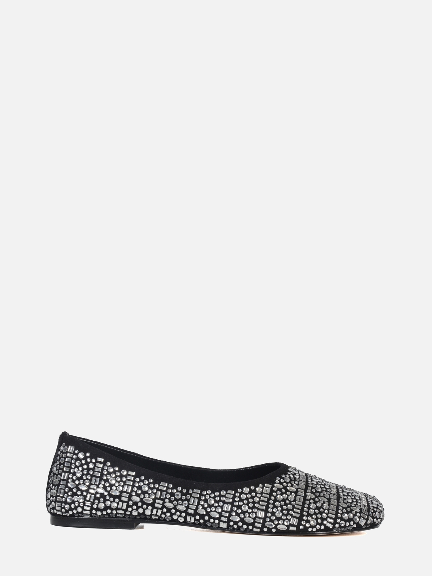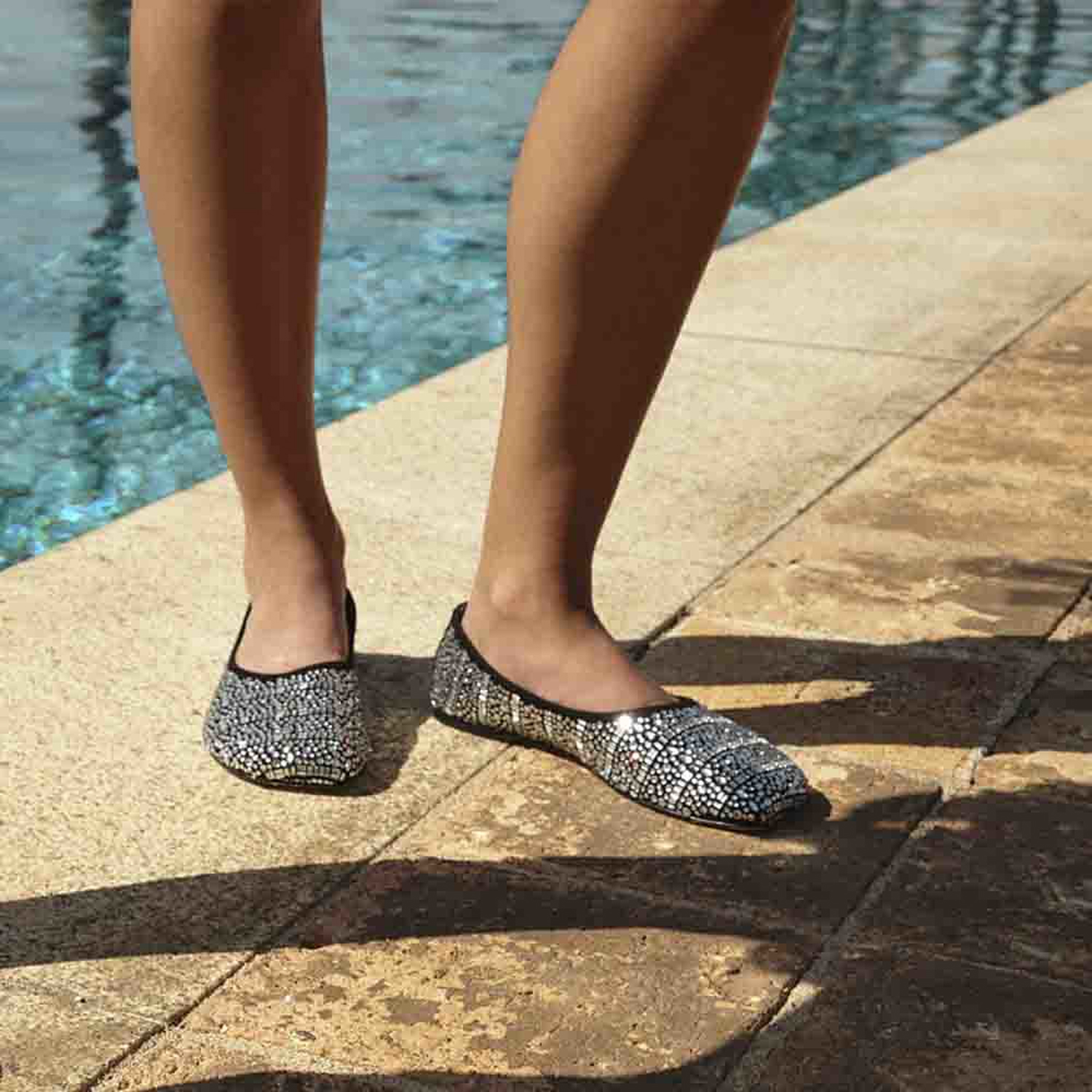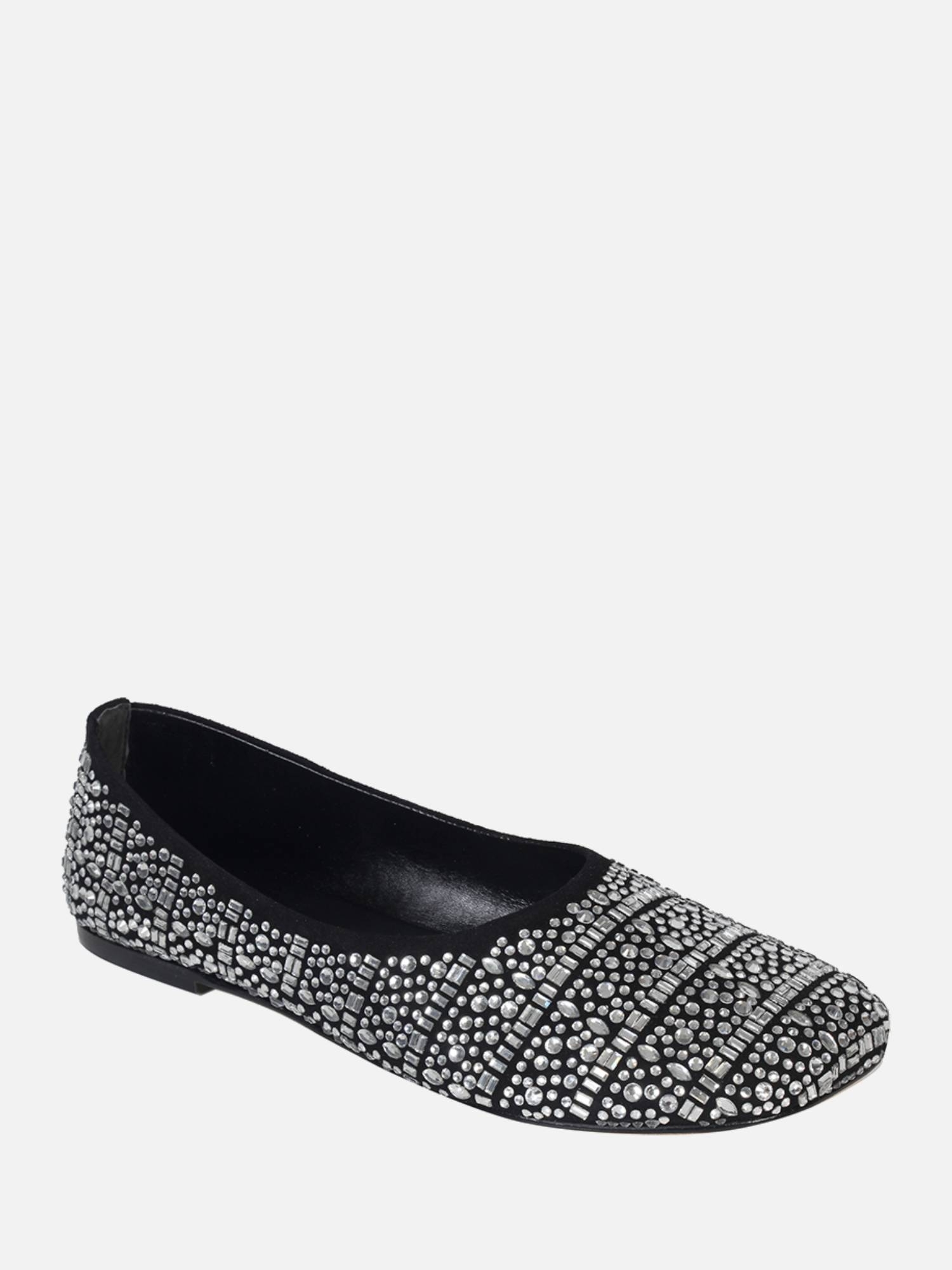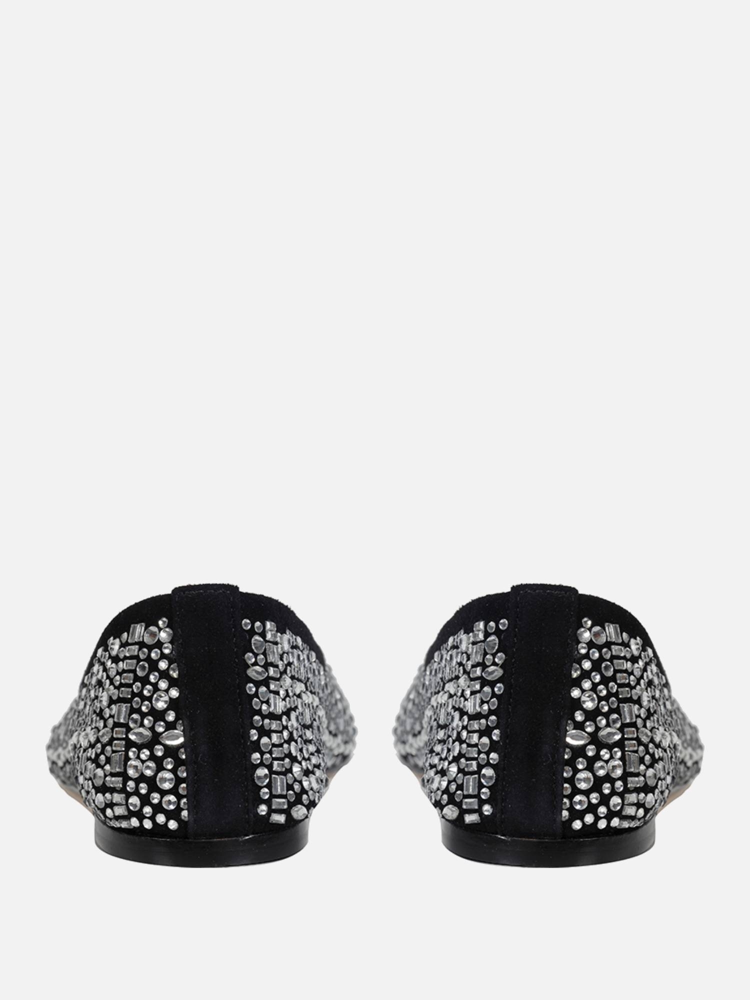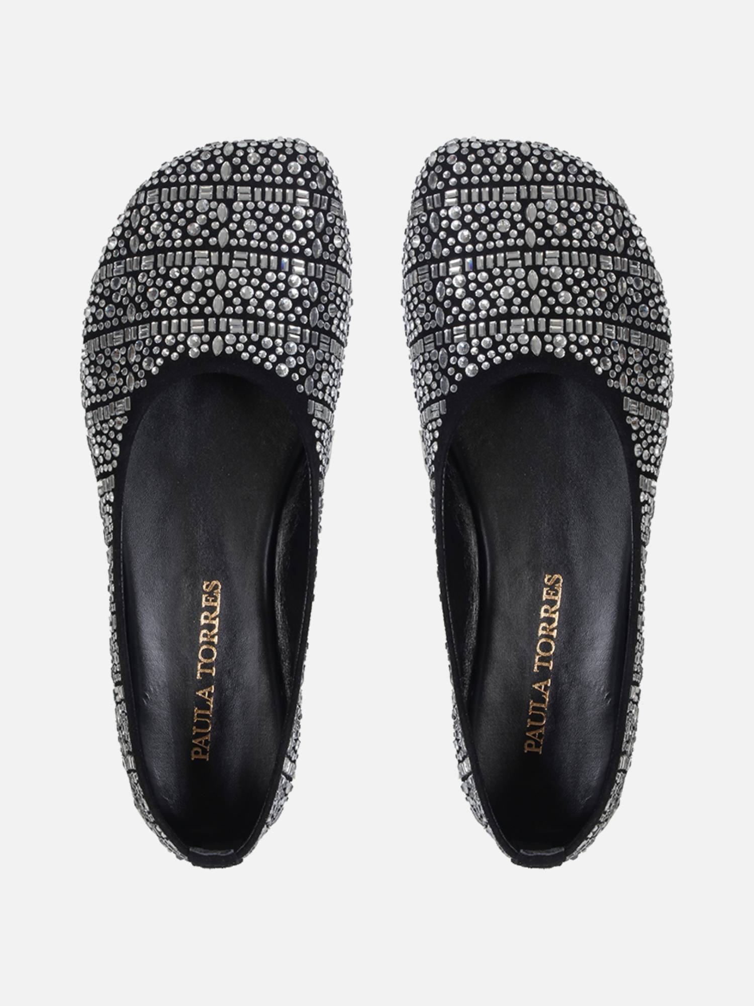 A Sapatilha Ella é produzida em camurça. O modelo possui bico abaloado e por todo o cabedal a aplicação de cristais em diferentes formatos, conferindo um brilho especial a peça. Solado em couro que traz maciez e flexibilidade, contribuindo para o conforto do calçado.