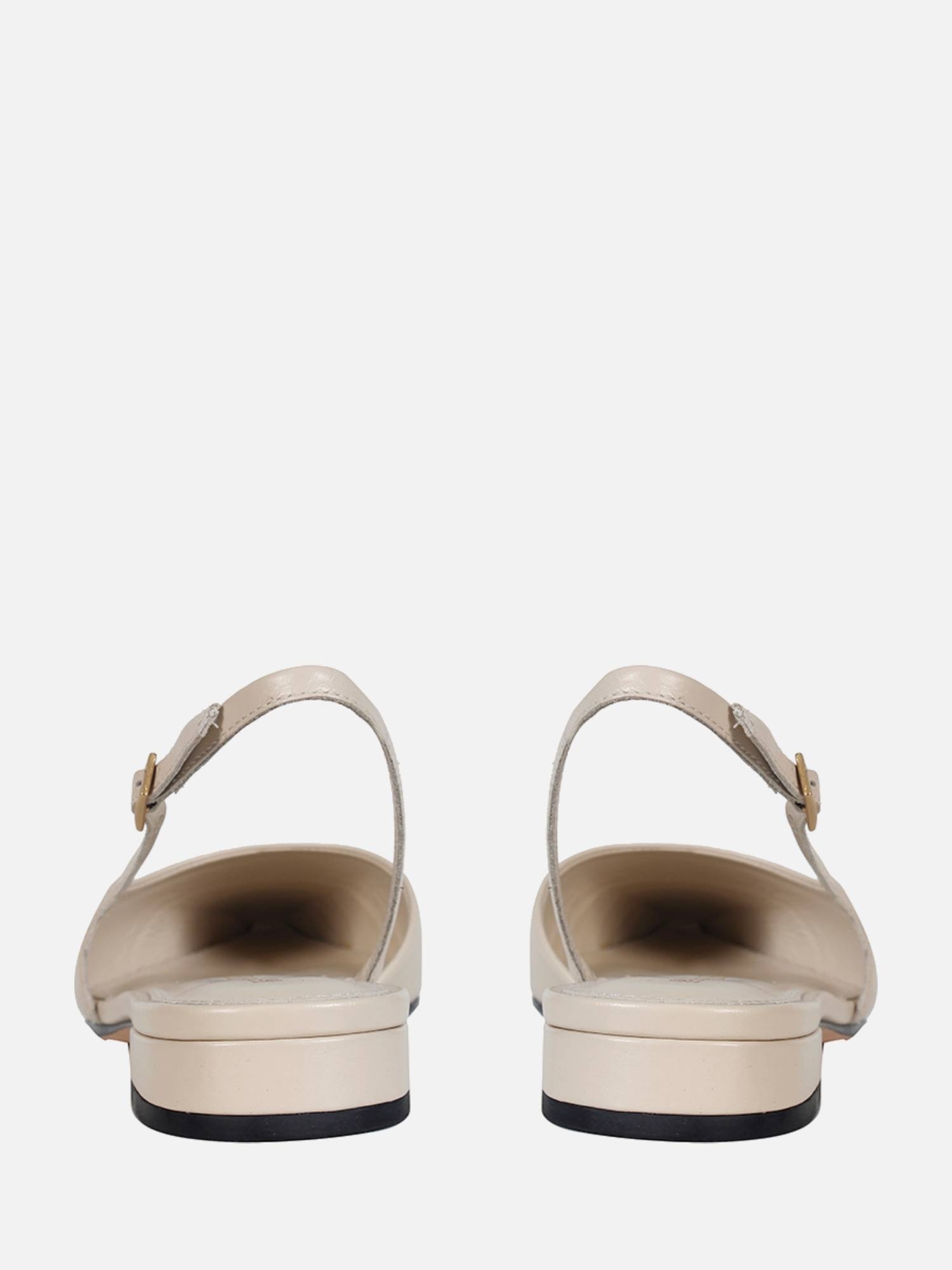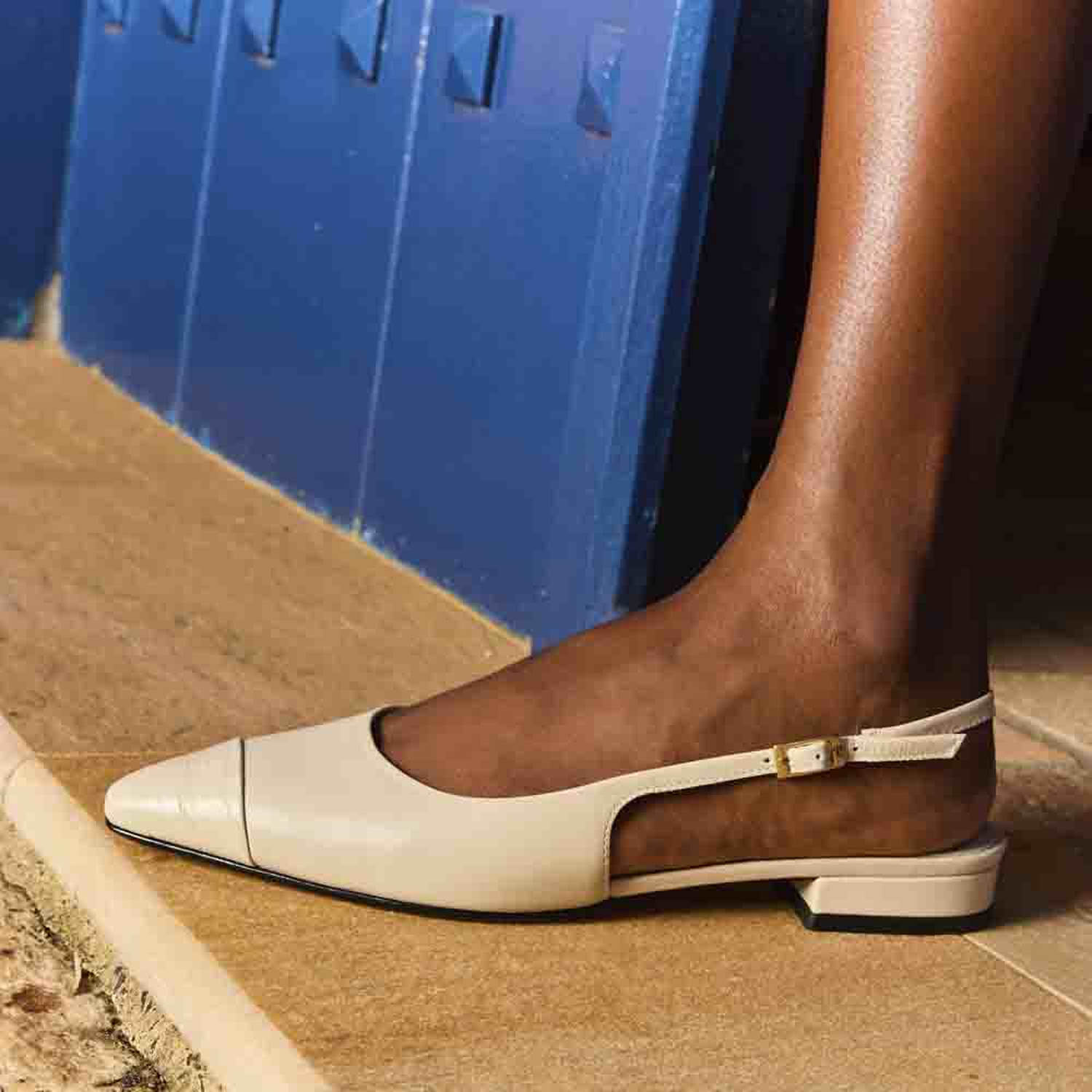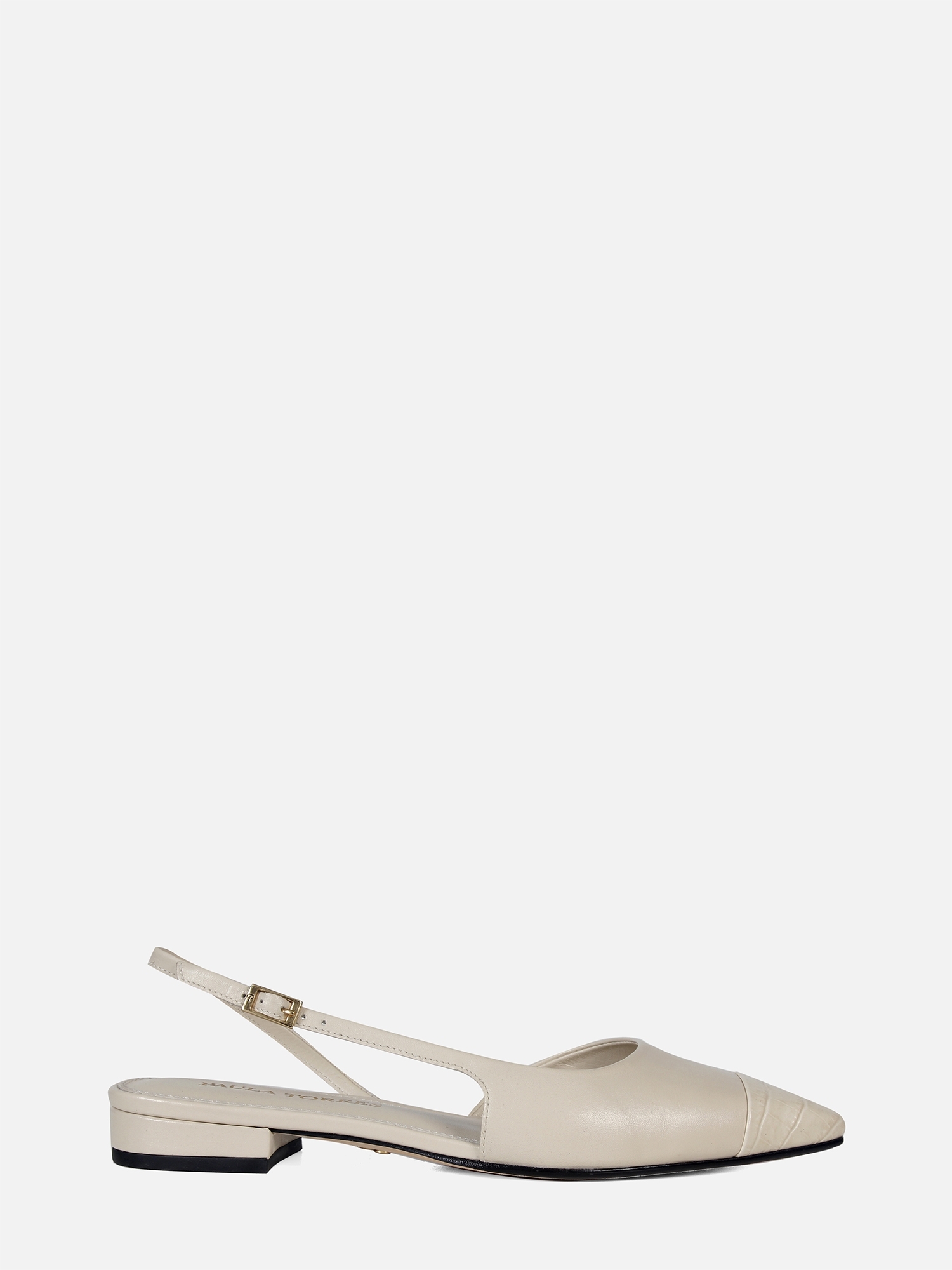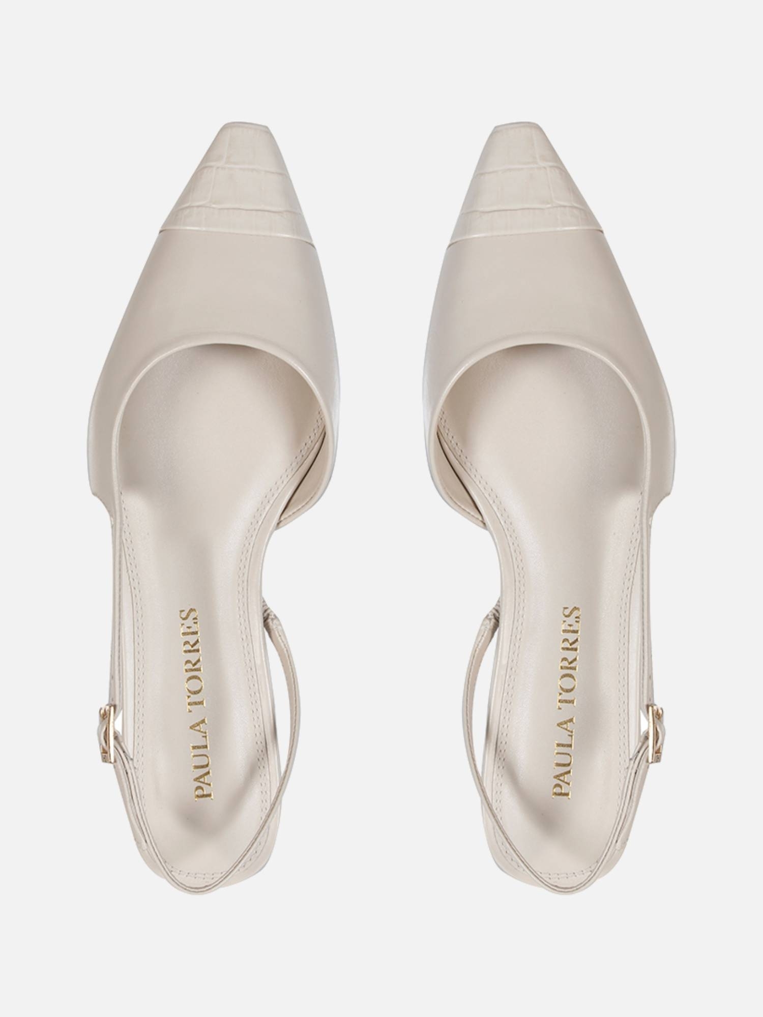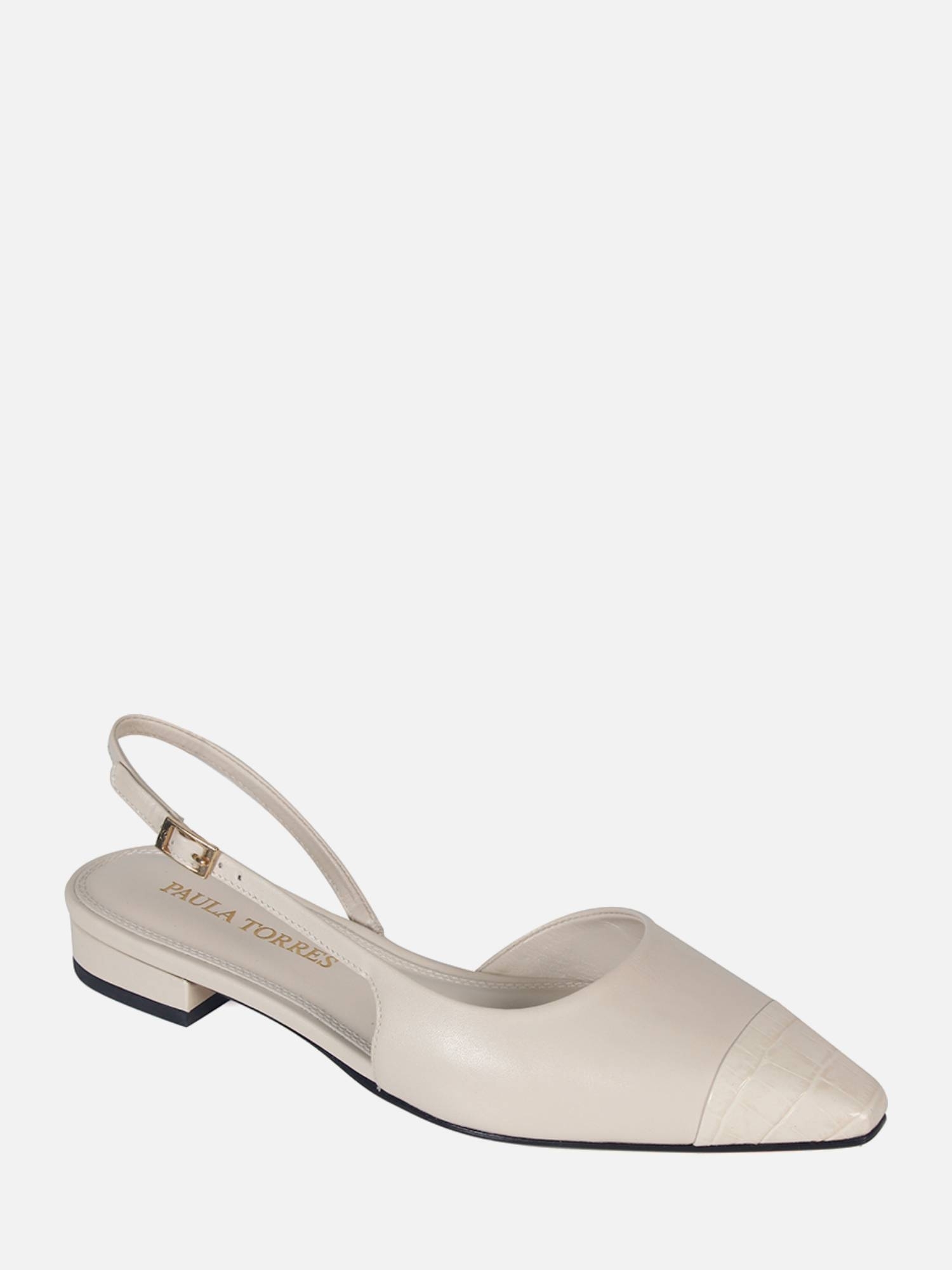A Sapatilha Gabi é produzida em couro. O modelo é conhecido como slingback por conta da tira fina ajustável no calcanhar com uma pequena fivela para regulagem. O destaque do design é o bico fino com a ponta quadrada que possui recorte, formando uma biqueira em couro com estampa croco. O solado em couro e salto rasteiro.