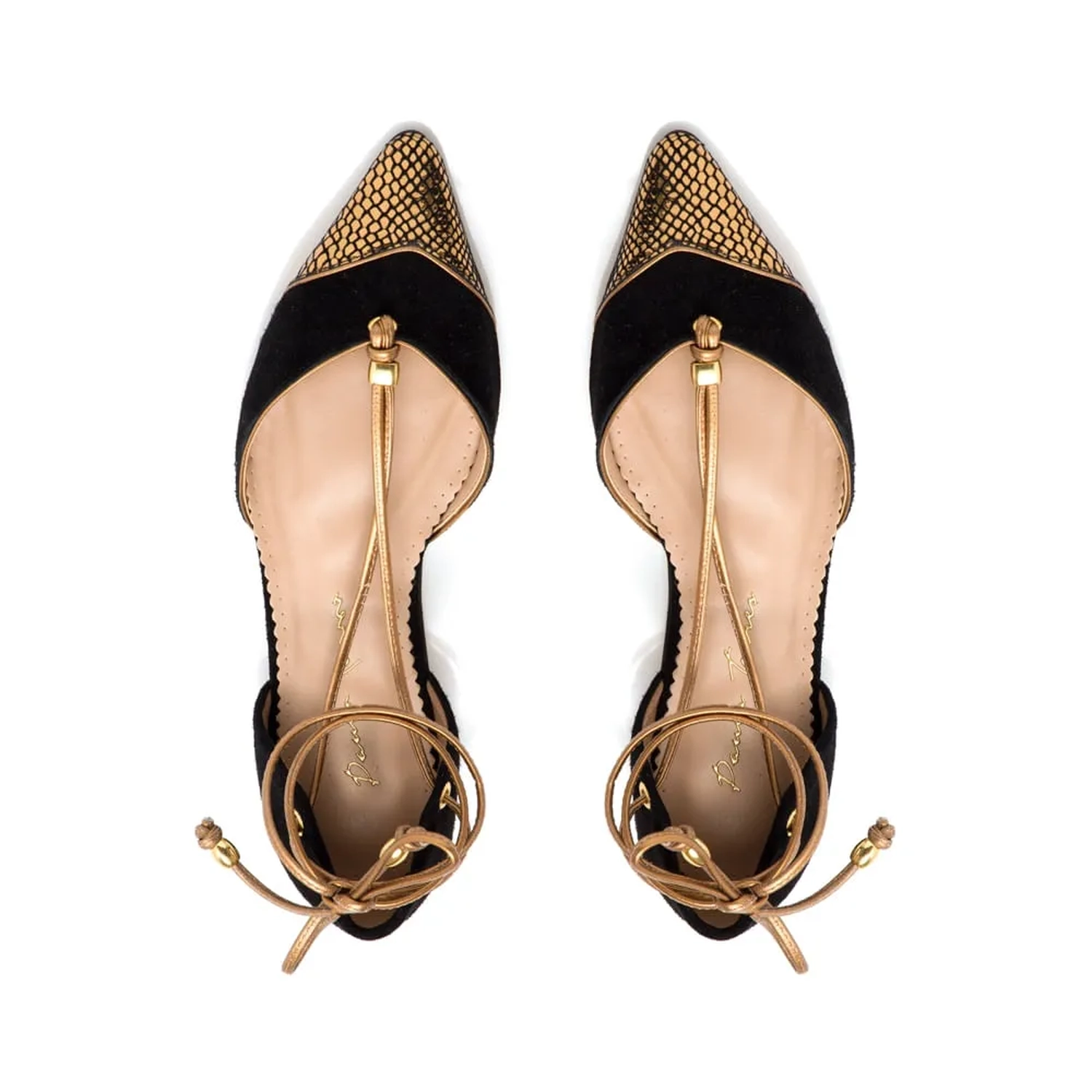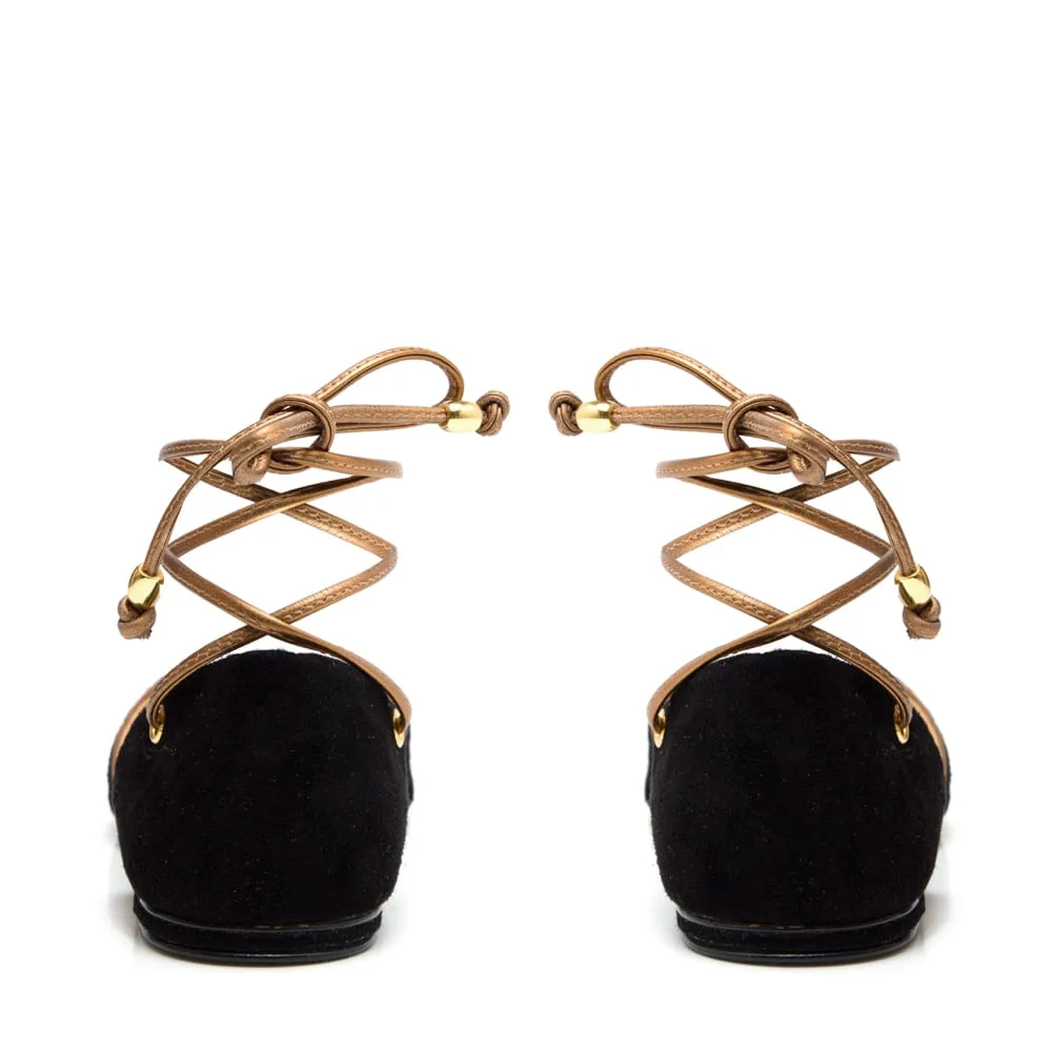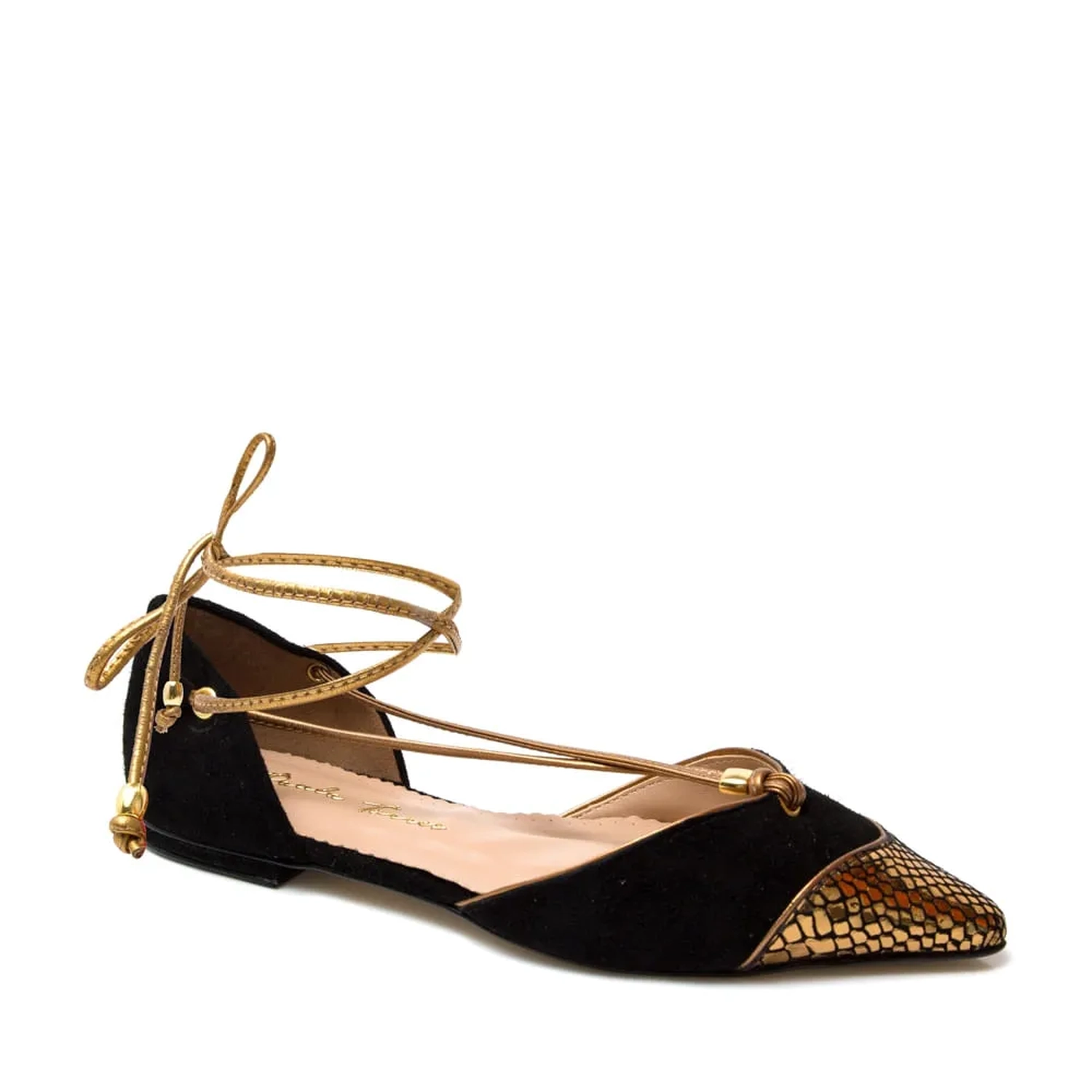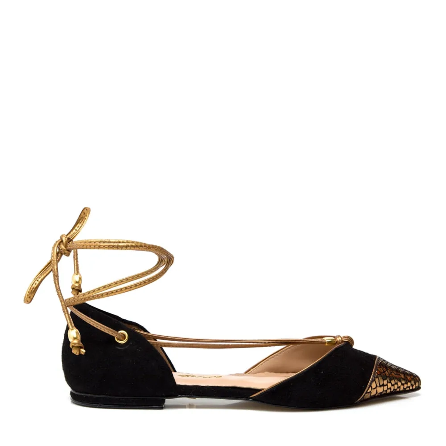 Sapatilha de camurça com o detalhe metalizado em croco na ponteira é um escândalo de luxuosa. O detalhe das tiras pelos pés e na amarração dão um charme a mais ainda para a sapatilha. Para substituir a altura um belo par de salto alto para uma ocasião que pede uma produção mais elegante. Cor: Preto Salto: 1.0CM