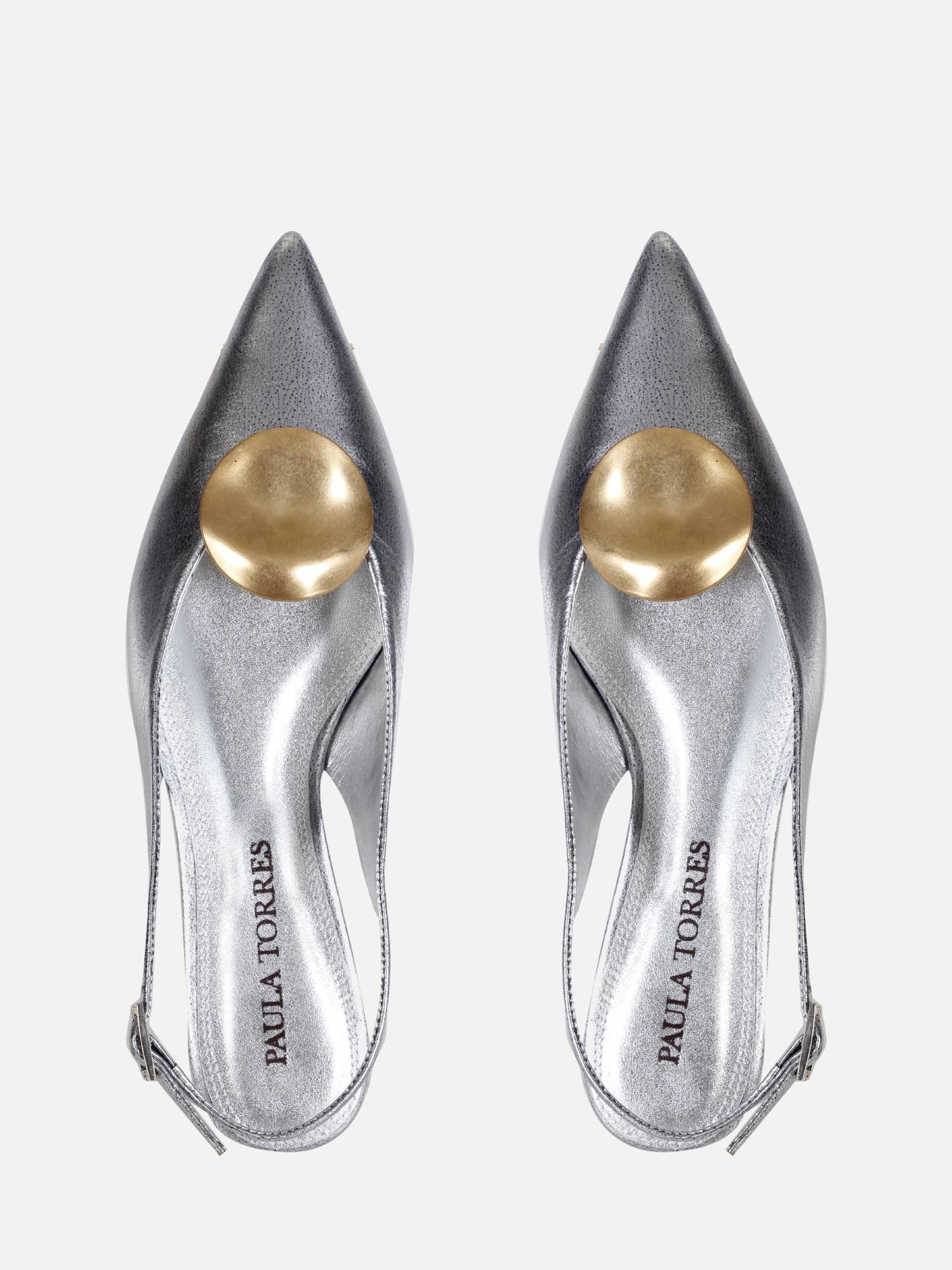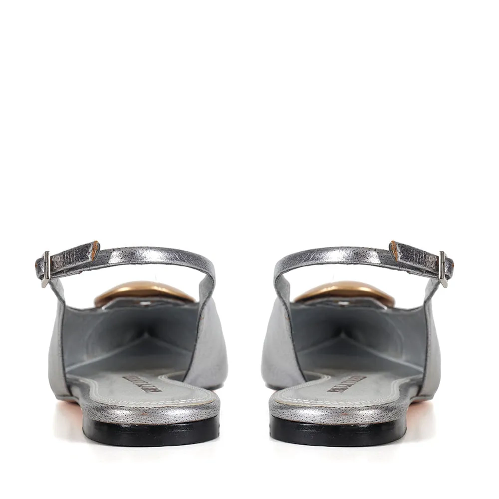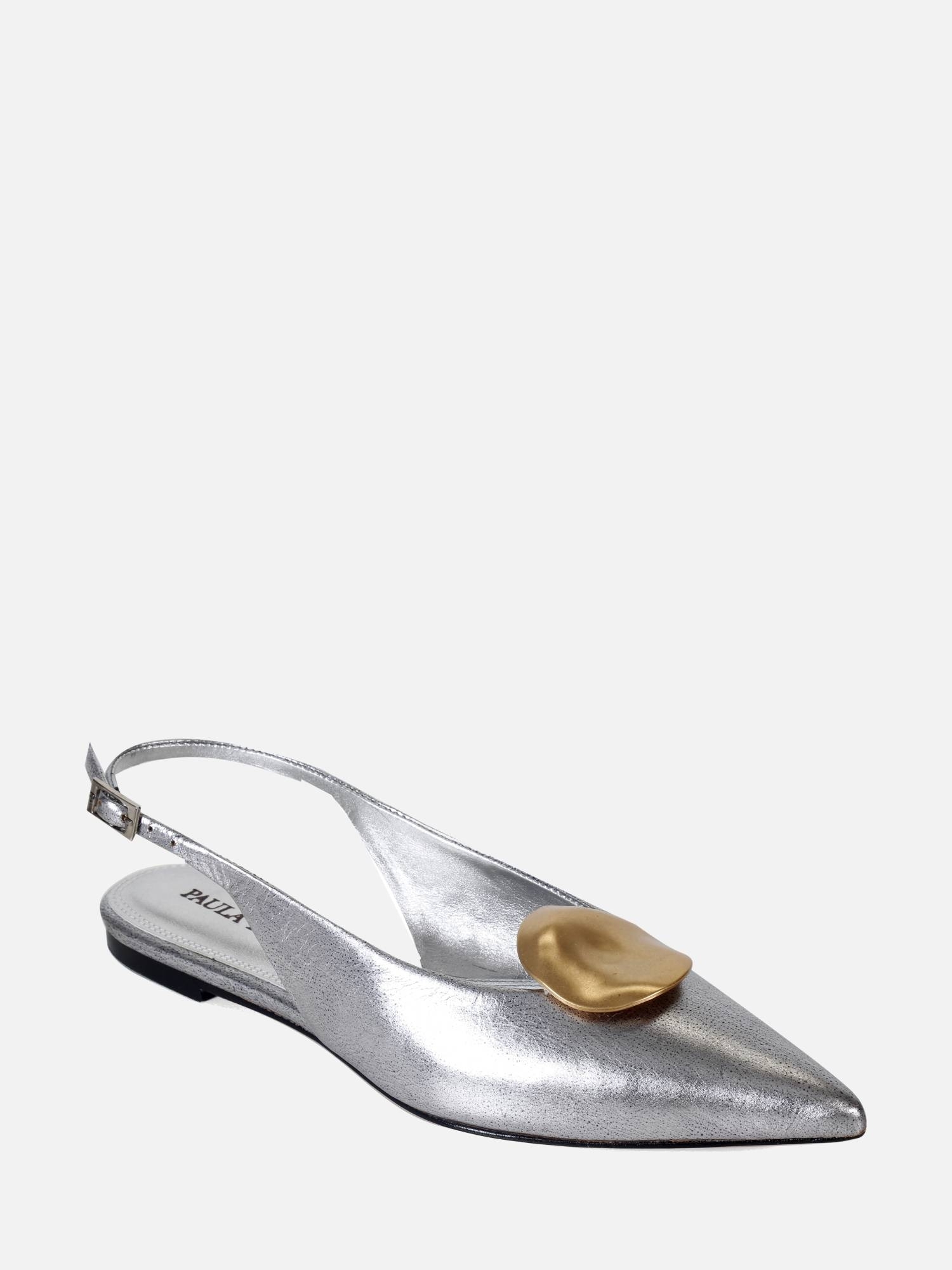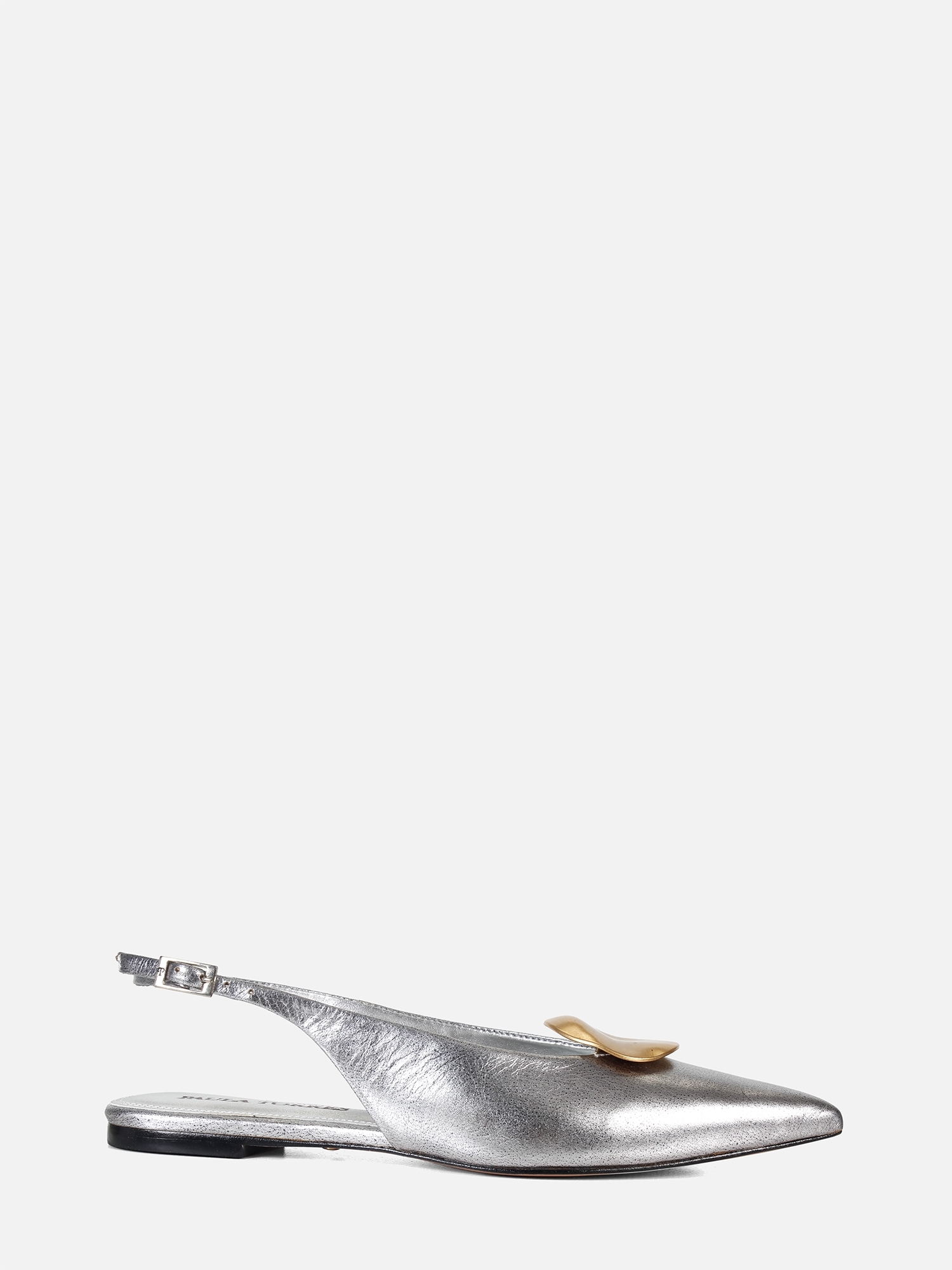 A Sapatilha Helo é produzida em couro metalizado. O modelo de bico fino alongado é realçado por uma delicada peça com banho dourado fosco. O fechamento é feito por fivela lateral, enquanto o solado em couro garante durabilidade à peça.
