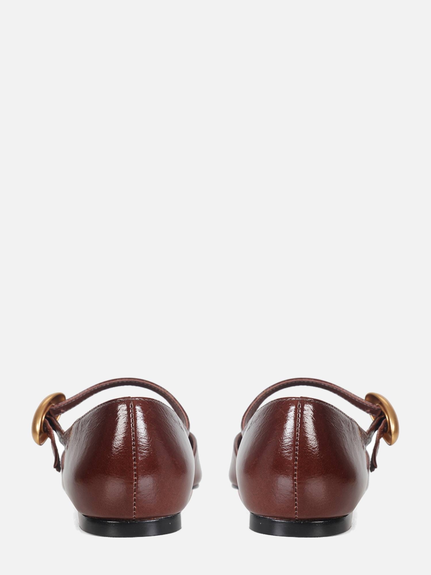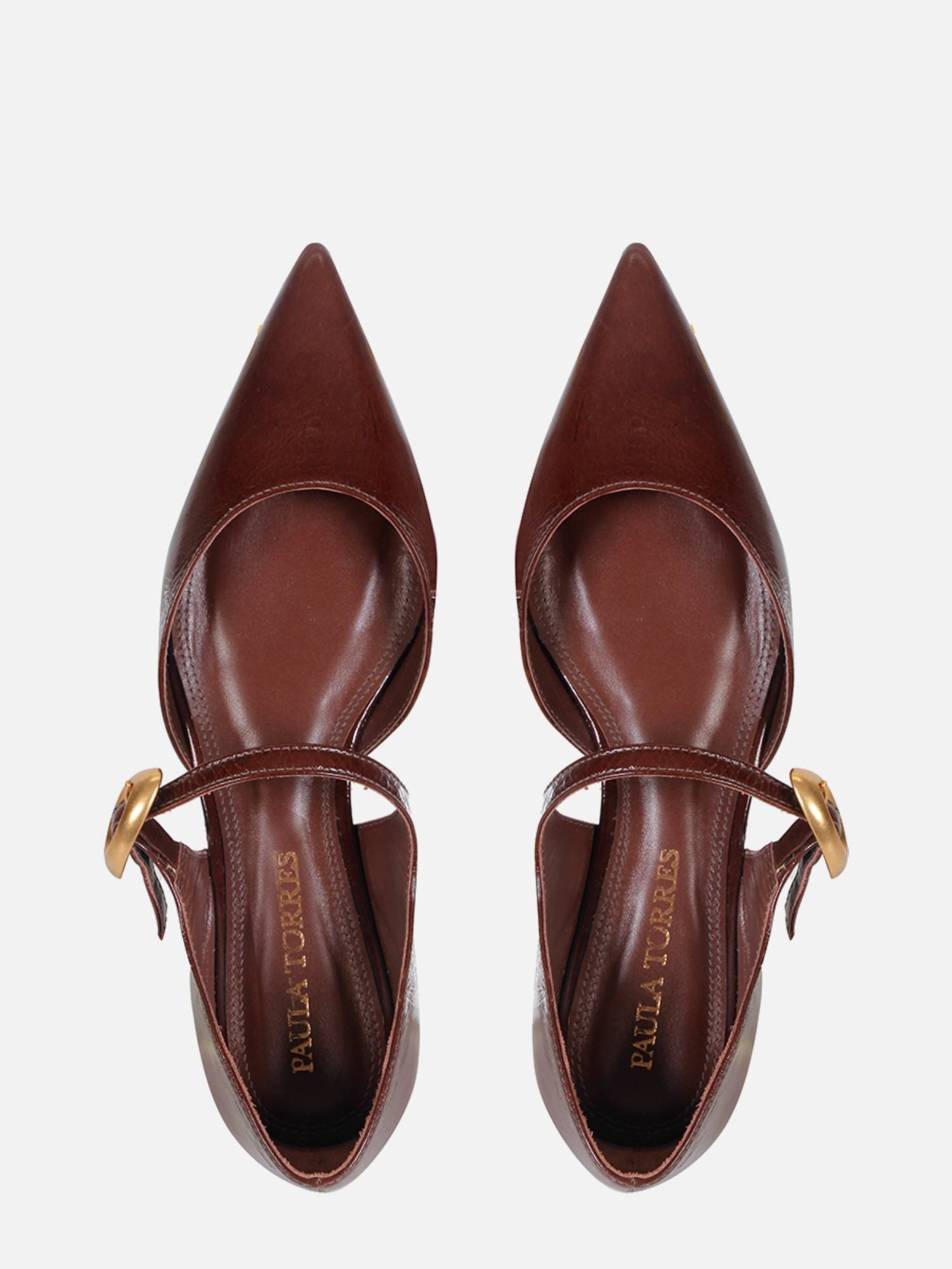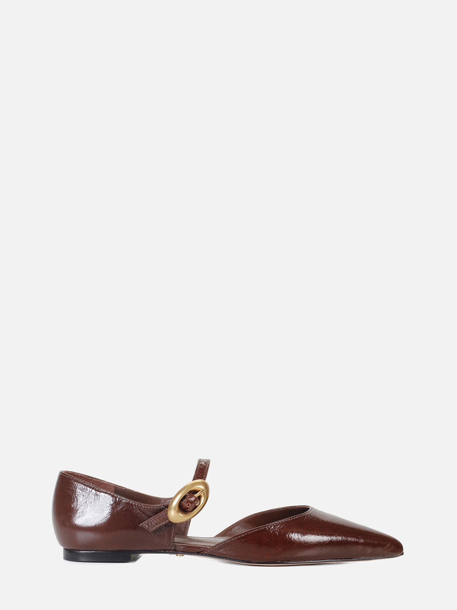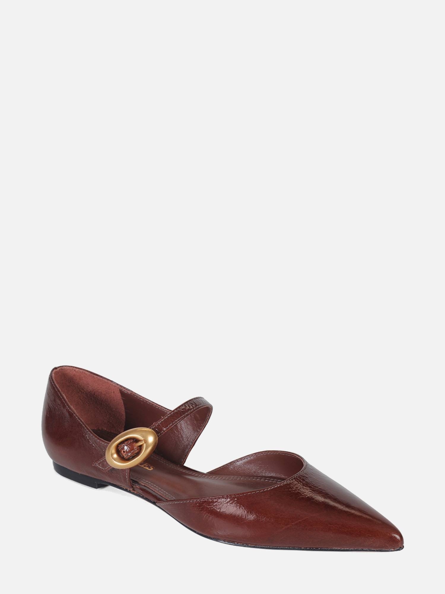 A Sapatilha Julia é produzida em couro macio com um toque de brilho. O modelo de bico fino alongado destaca-se pela tira sobre o peito do pé, adornada com uma elegante fivela dourada. Com calcanhar fechado e solado em couro, a peça combina conforto, elegância e durabilidade.