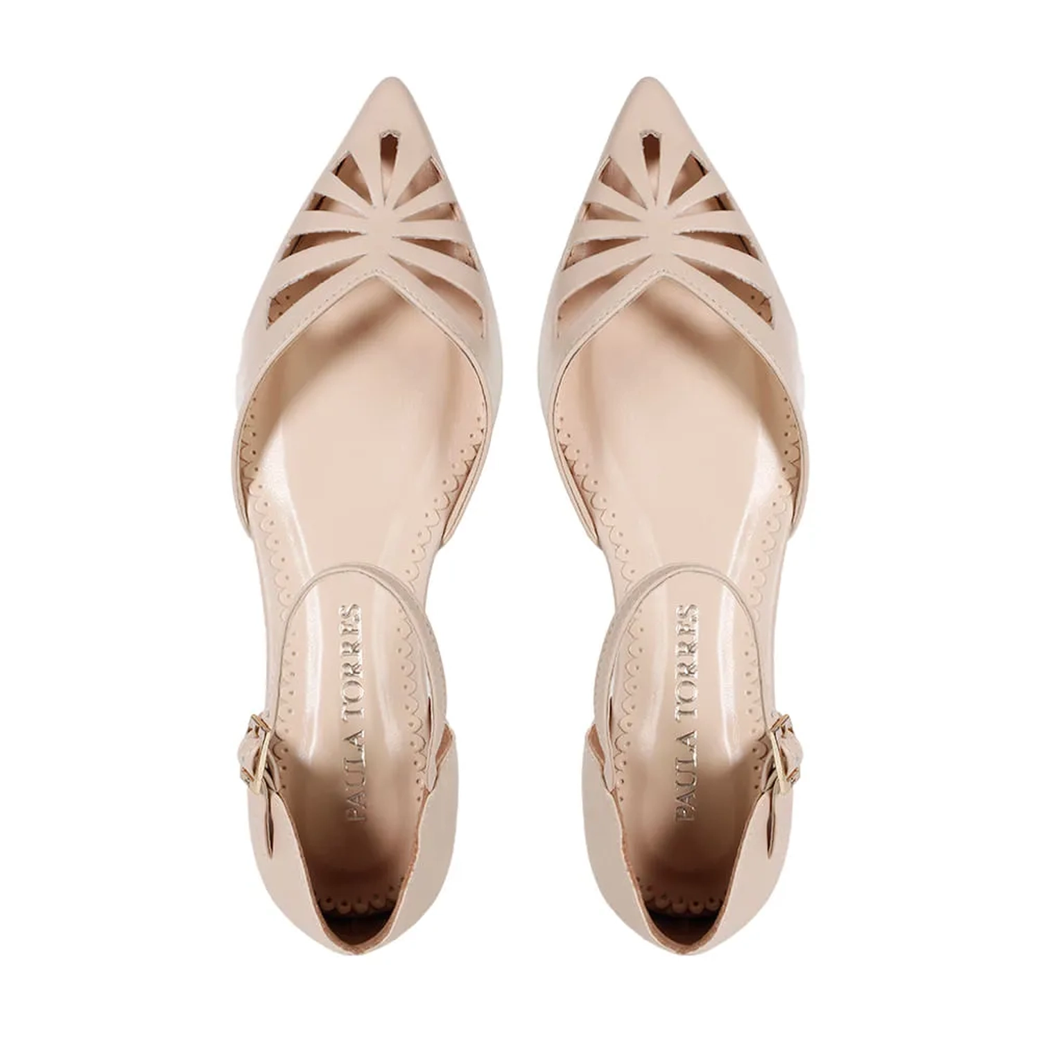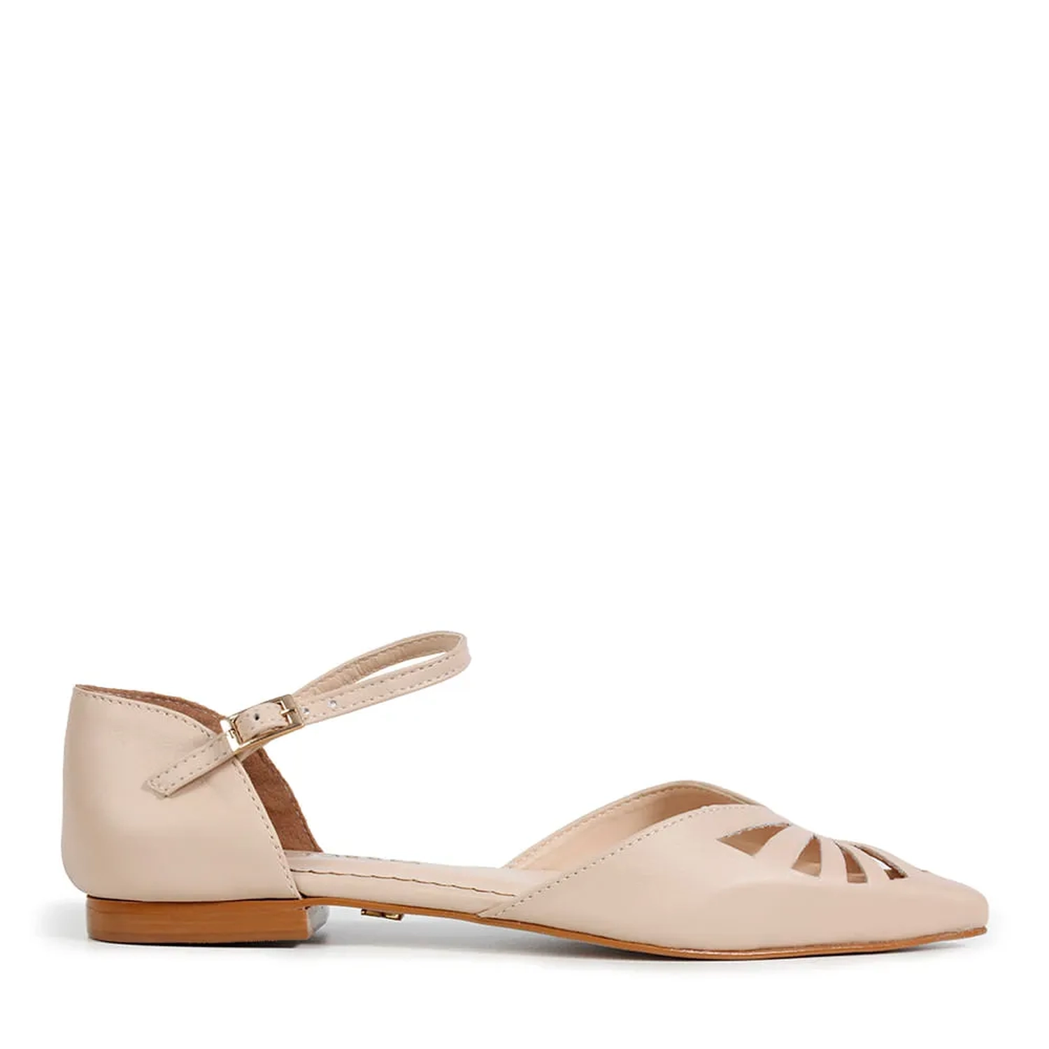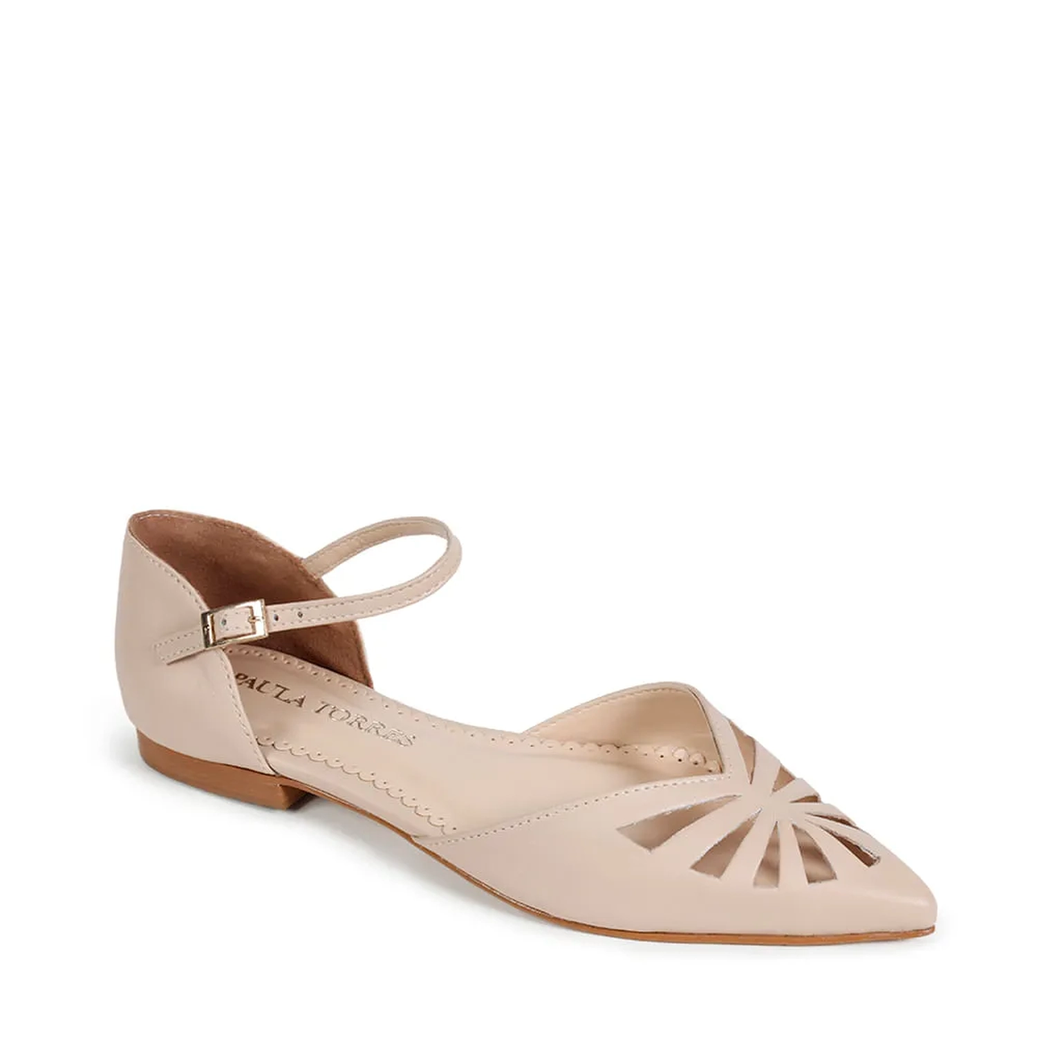 A Sapatilha Kate é confeccionada em couro. Modelagem clássica, em bico fino e fechamento por fivela. O destaque são os recortes na parte frontal do cabedal, conferindo uma estética contemporânea e fresca. A tornozeleira com fivela e o contraforte fechado tornam o modelo delicado. A monocromia e o decote em ¿v¿ transmite sofisticação e elegância.