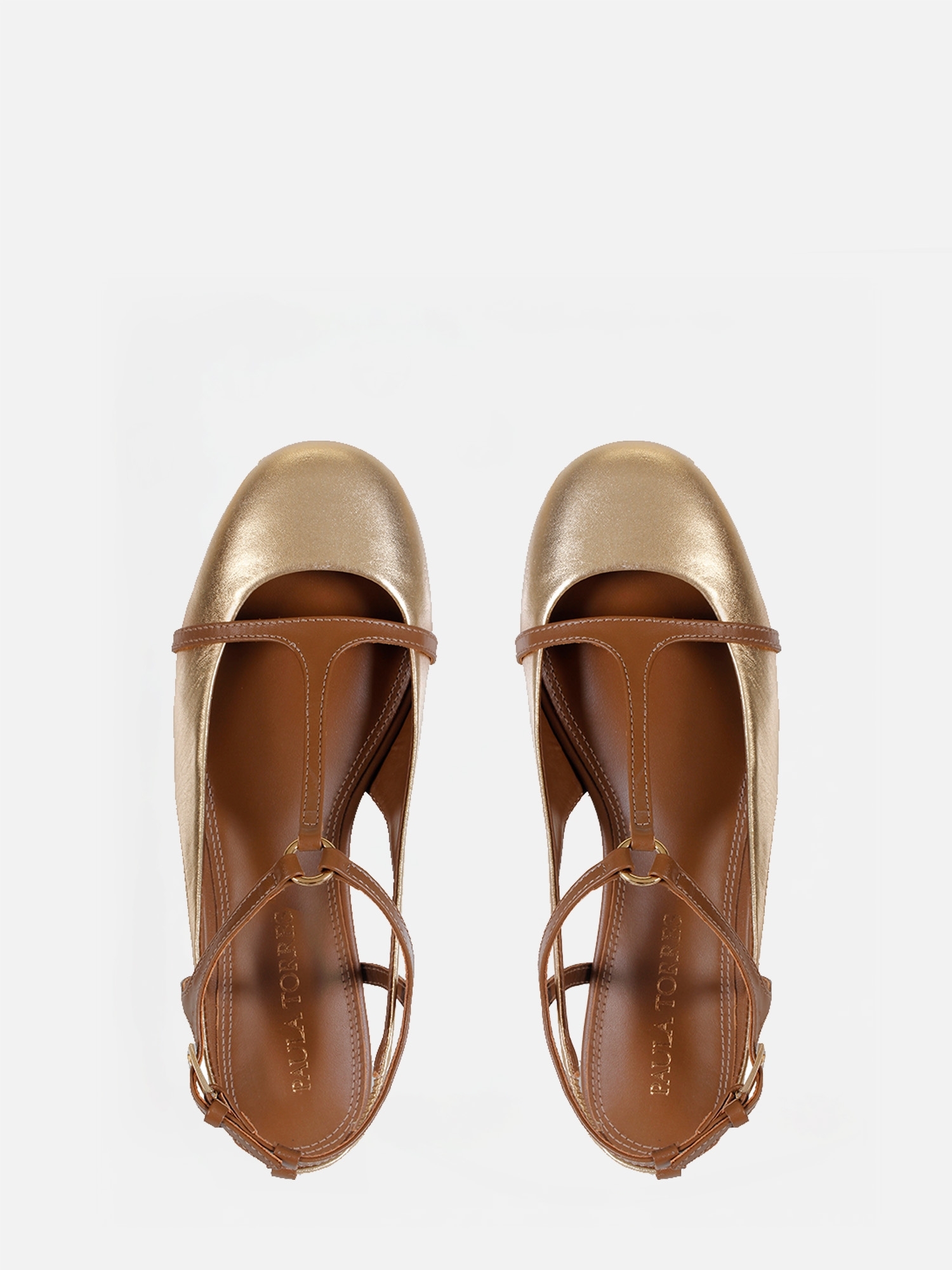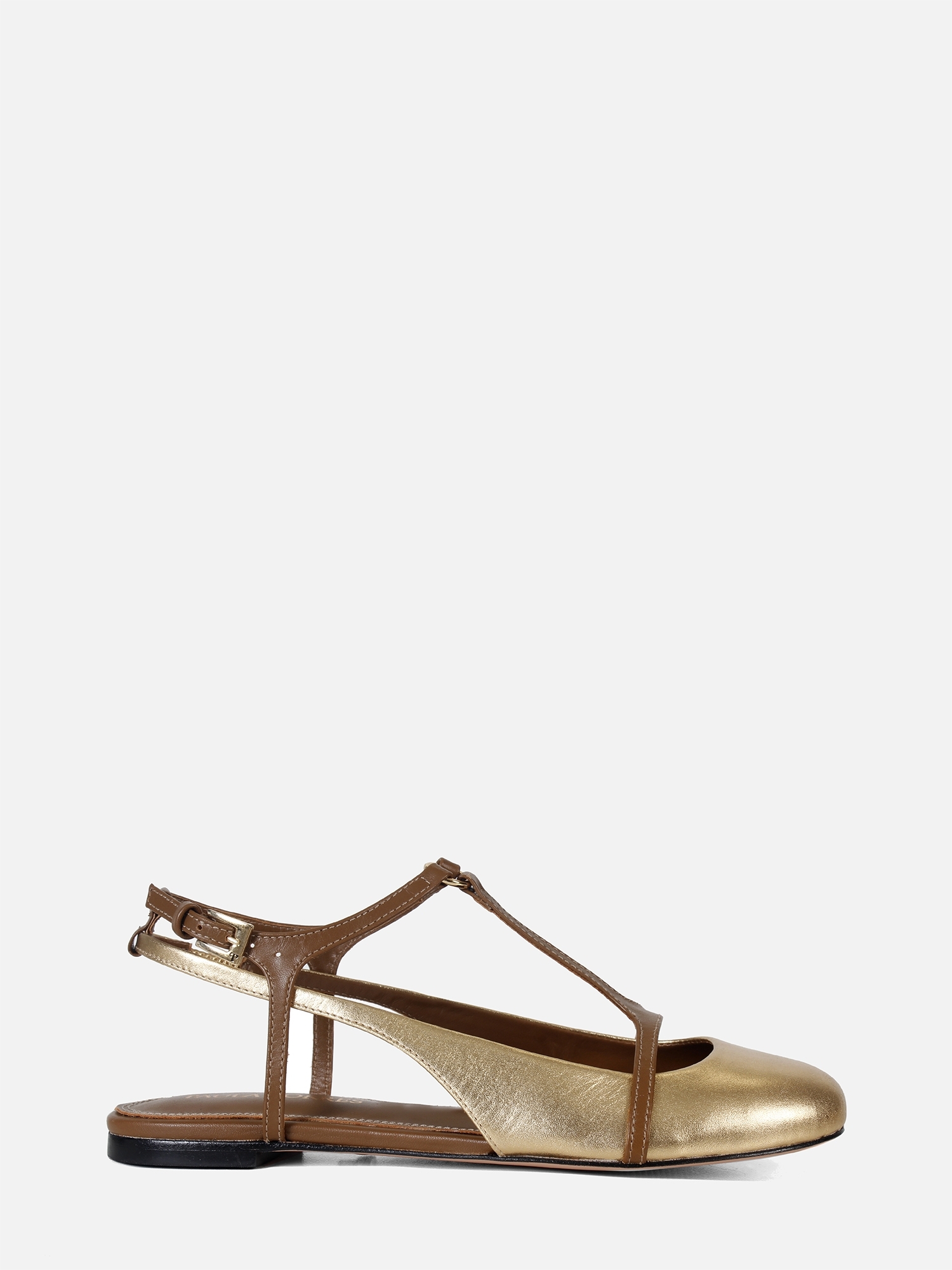 A Sapatilha Lola é sinônimo de charme e sofisticação. Confeccionada em couro metalizado dourado, o modelo possui bico arredondado e um elegante detalhe em T formado por tiras de couro conectadas por uma argola metálica no peito do pé. O design slingback garante um visual leve, enquanto a tira com fivela lateral proporciona ajuste seguro e delicado.