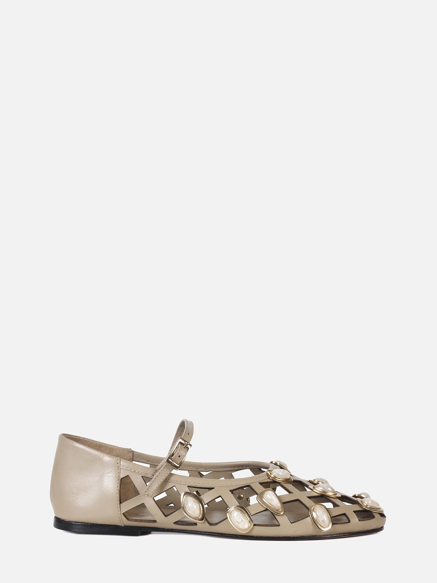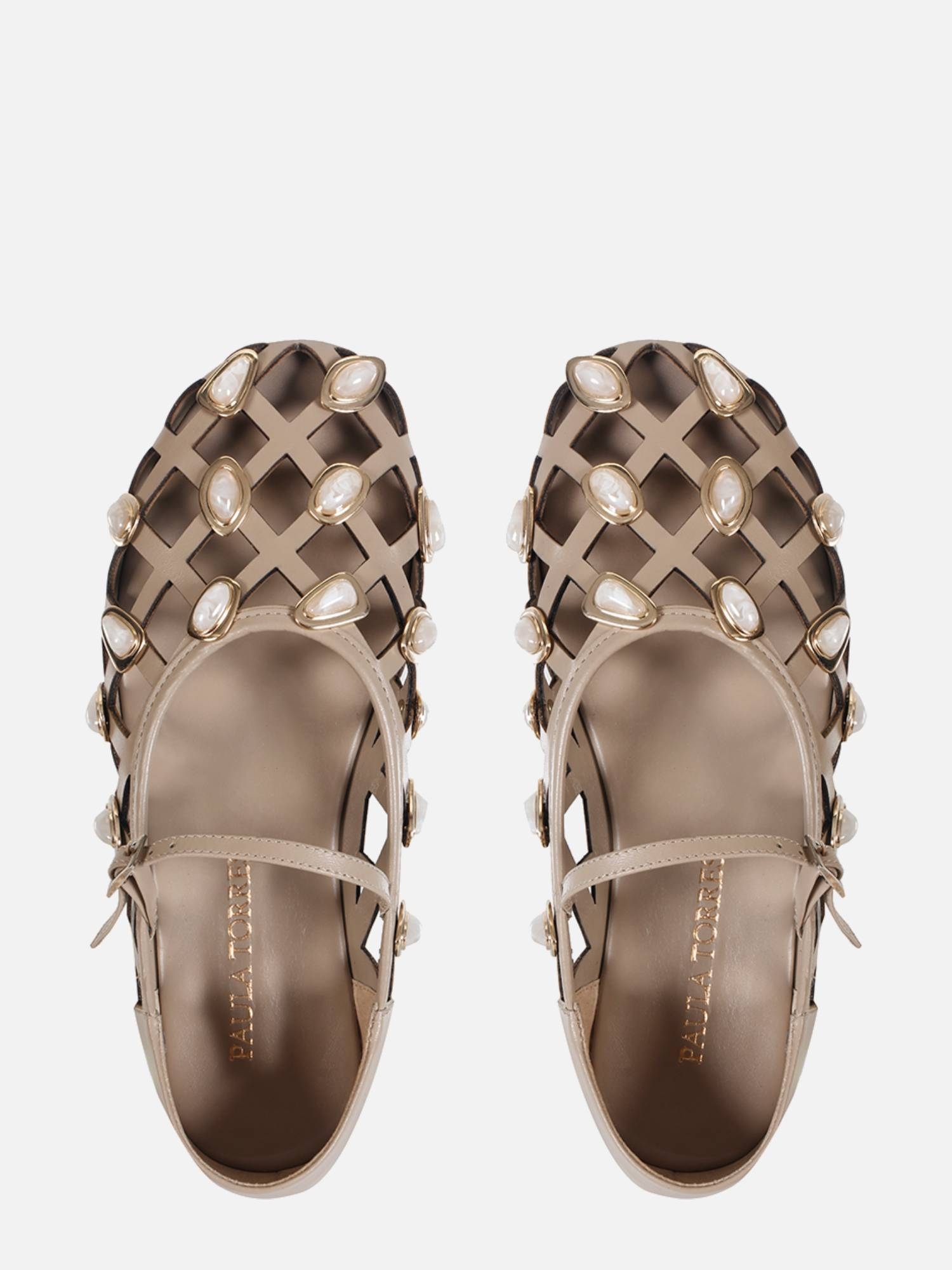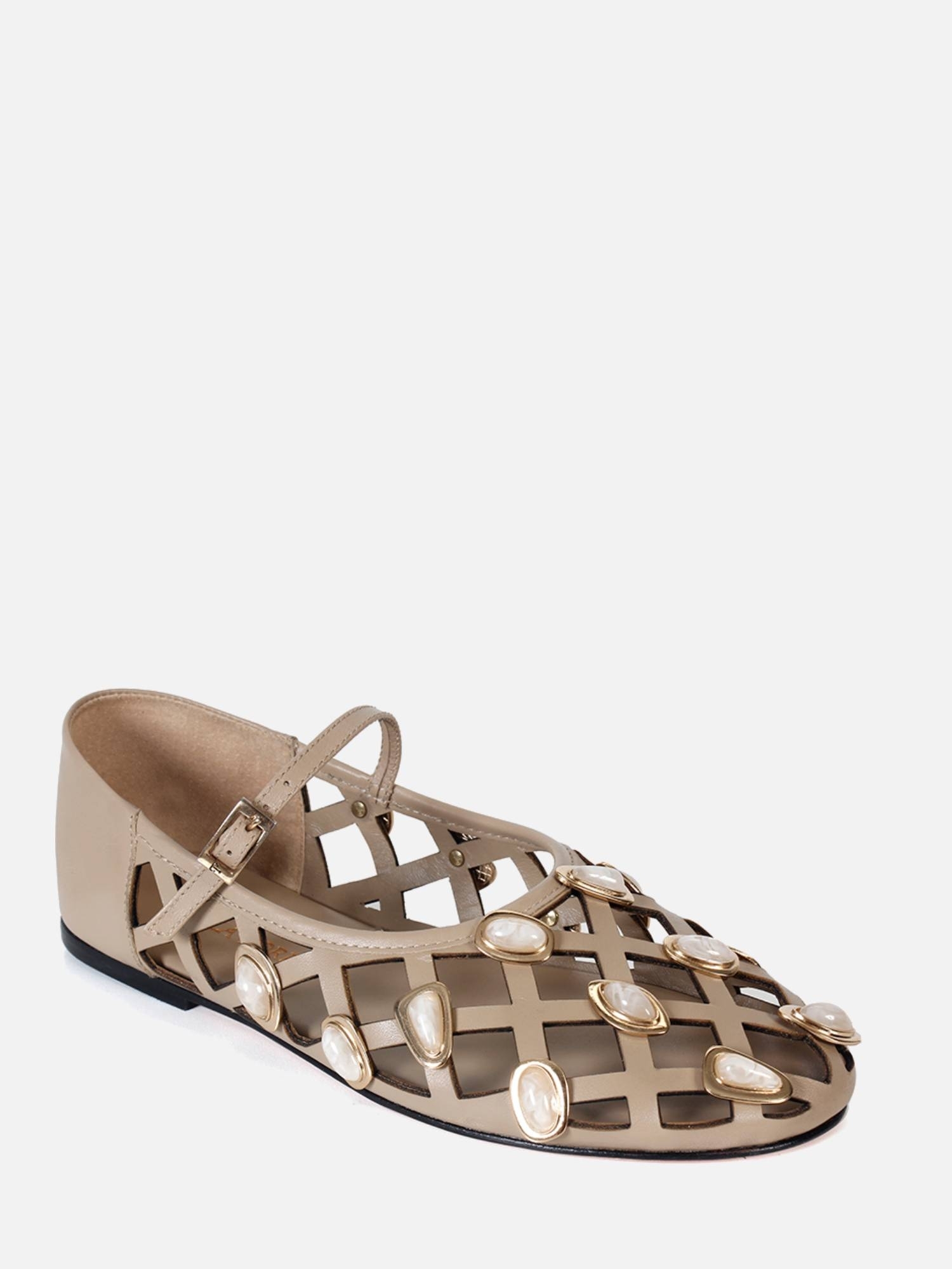 A Sapatilha Millena é confeccionada em couro. O modelo flat de bico arredondado apresenta recortes a laser no cabedal, adornado com pedras resinadas em formatos orgânicos, aplicadas sobre metais com banho dourado. O fechamento é feito por uma fivela na tira que atravessa o peito do pé, garantindo ajuste perfeito e um toque sofisticado. O solado em couro garante durabilidade e um acabamento refinado.