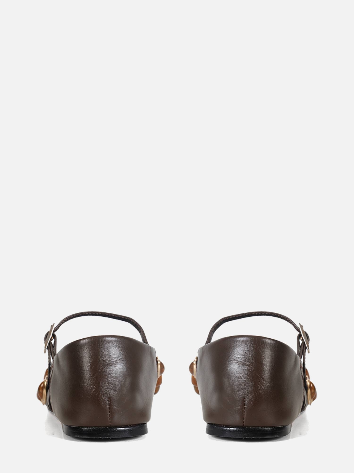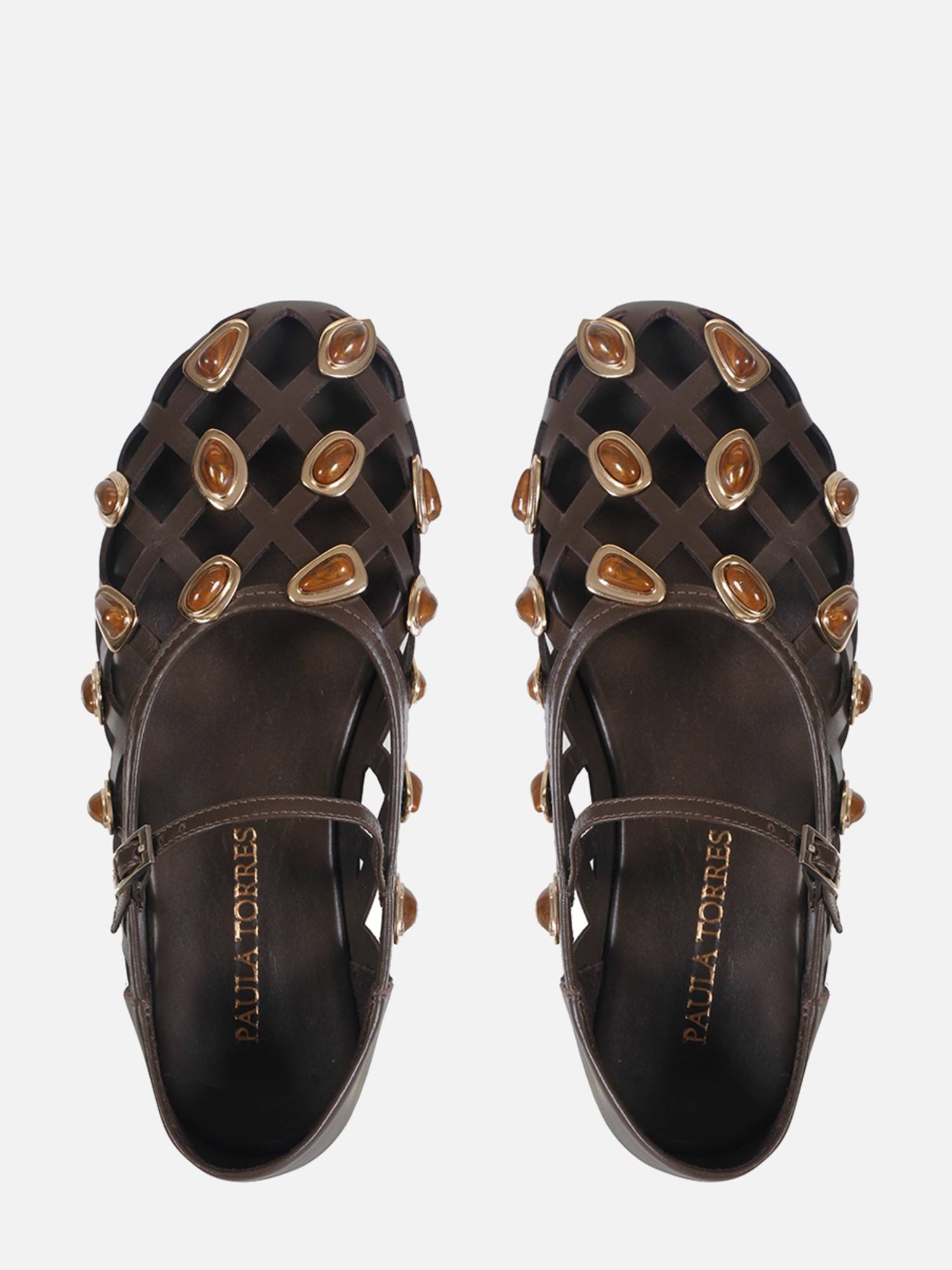 A Sapatilha Millena é confeccionada em couro. O modelo flat de bico arredondado apresenta recortes a laser no cabedal, adornado com pedras resinadas em formatos orgânicos, aplicadas sobre metais com banho dourado. O fechamento é feito por uma fivela na tira que atravessa o peito do pé, garantindo ajuste perfeito e um toque sofisticado. O solado em couro garante durabilidade e um acabamento refinado.