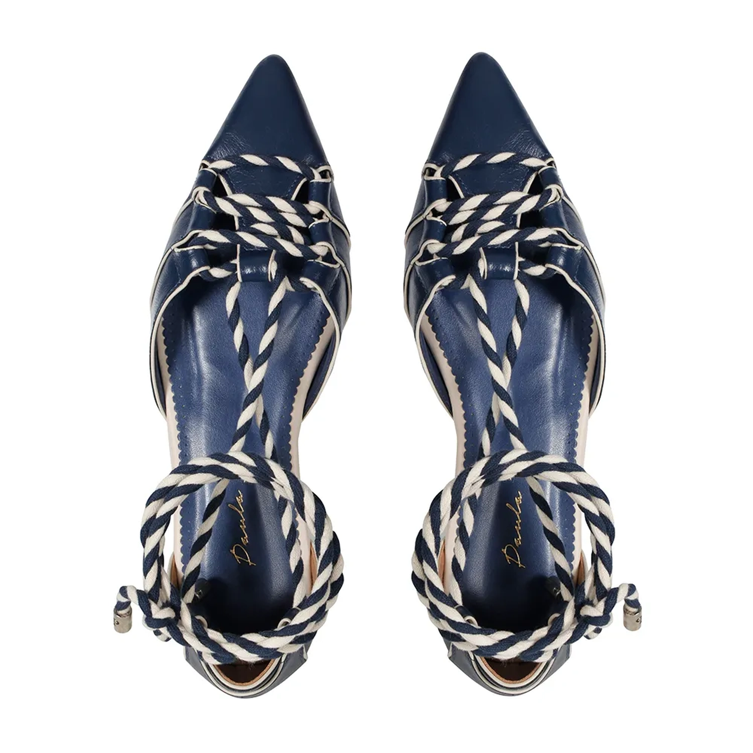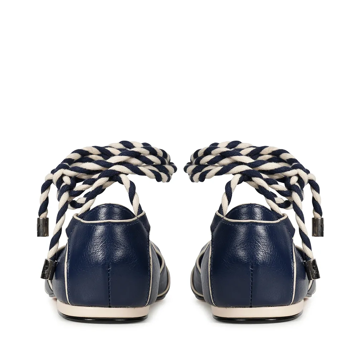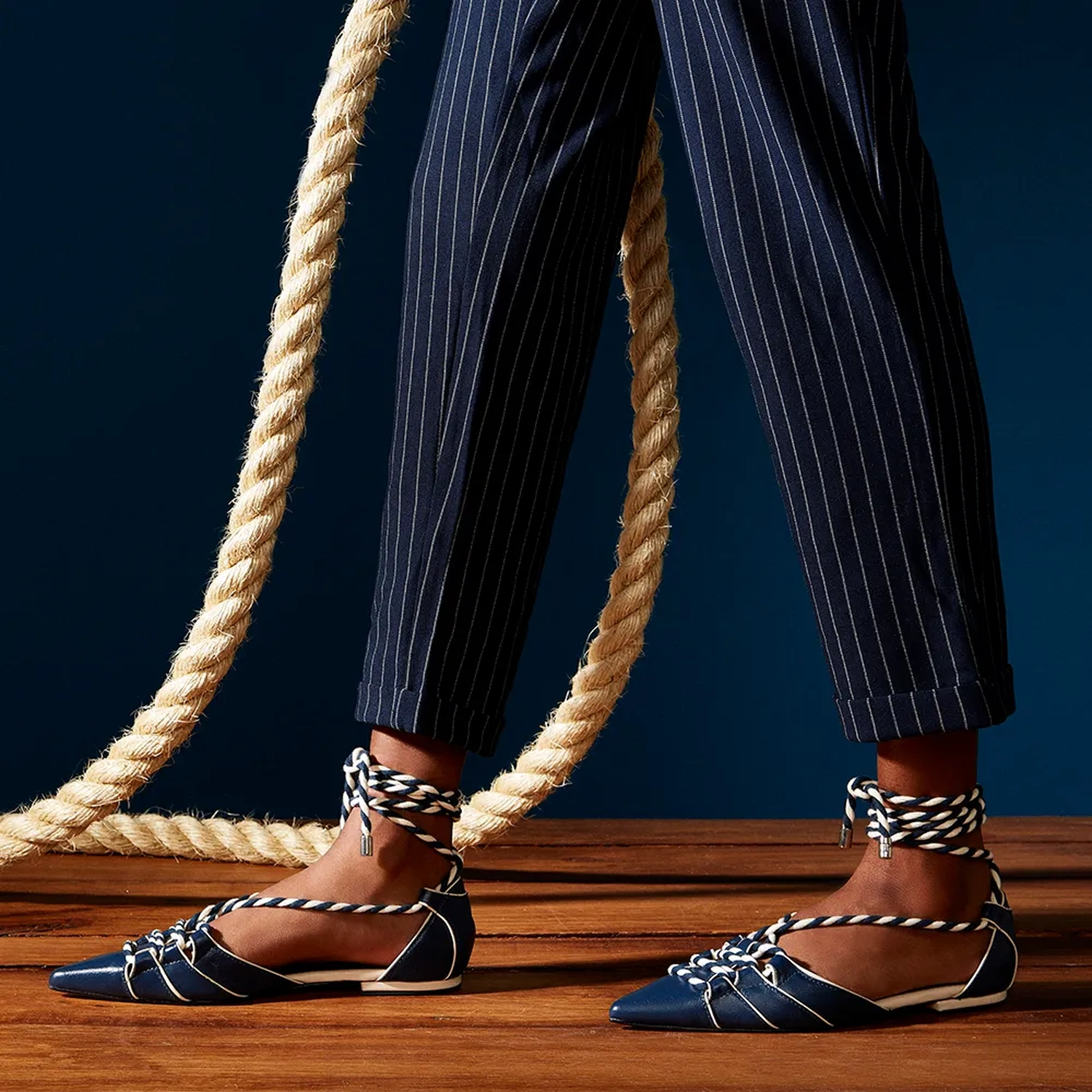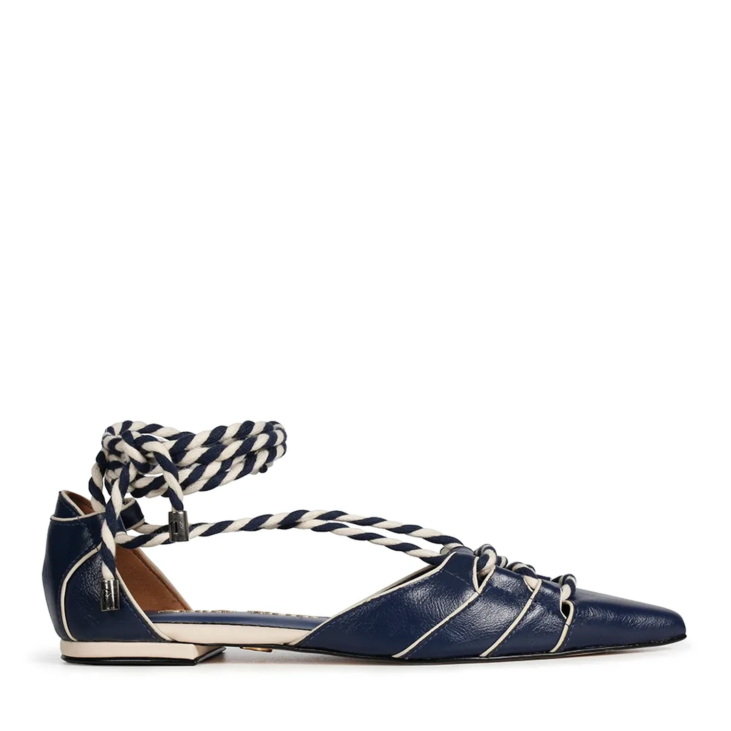 A Sapatilha Nina é confeccionada em couro. Sucesso absoluto na Paula Torres, a sapatilha de modelagem com bico fino, tem em sua nova versão as cordas de couro bicolores, que remetem ao estilo náutico. O cabedal estilizado em forma de escamas nas laterais tornam o modelo ainda mais exclusivo. As cordas decoram o cabedal, e se cruzam na parte do peito do pé, formando um X, passando para o tornozelo, o fechamento acorre por amarração. As extremidades das cordas são finalizadas com um charme metalizado.