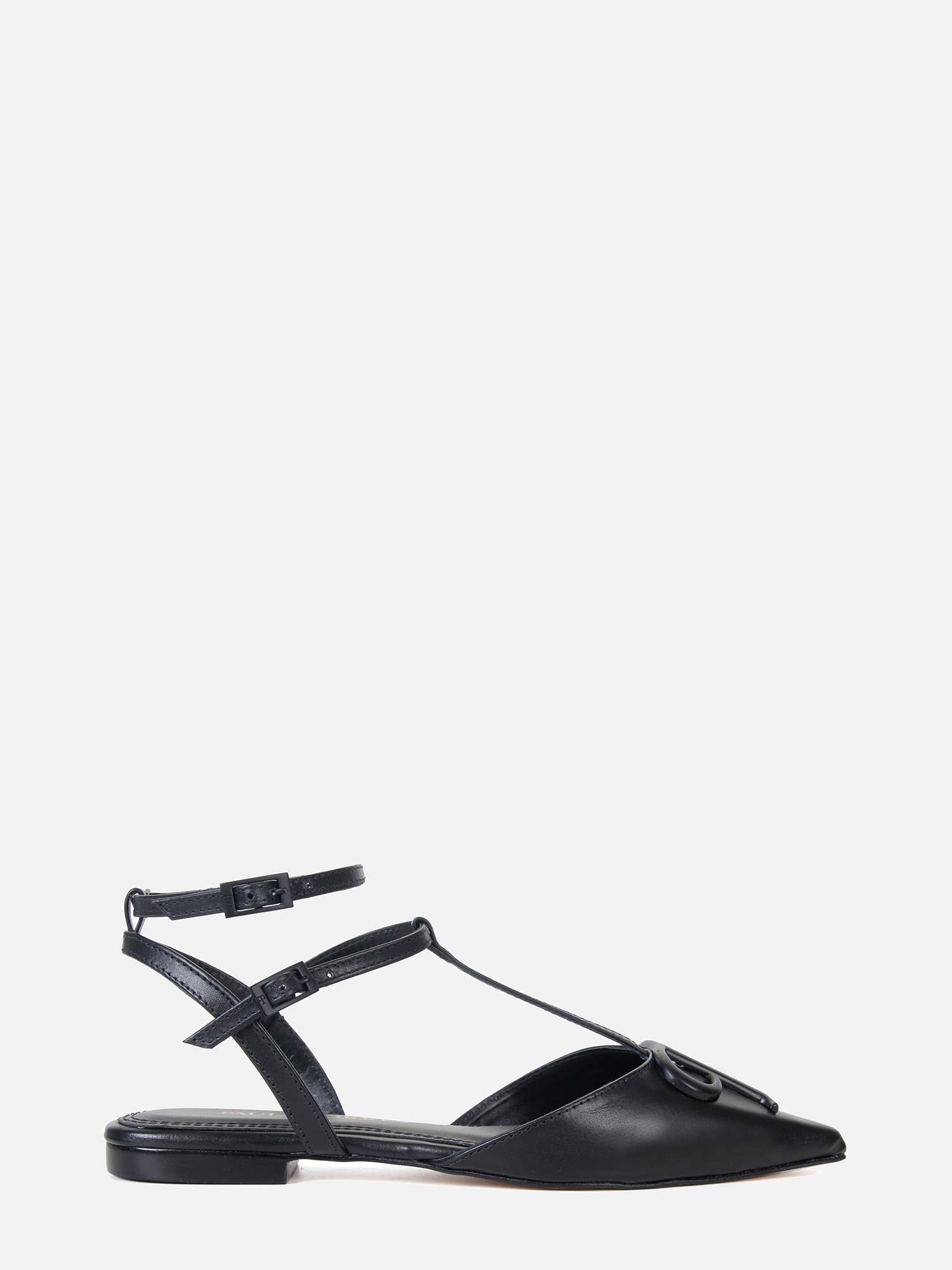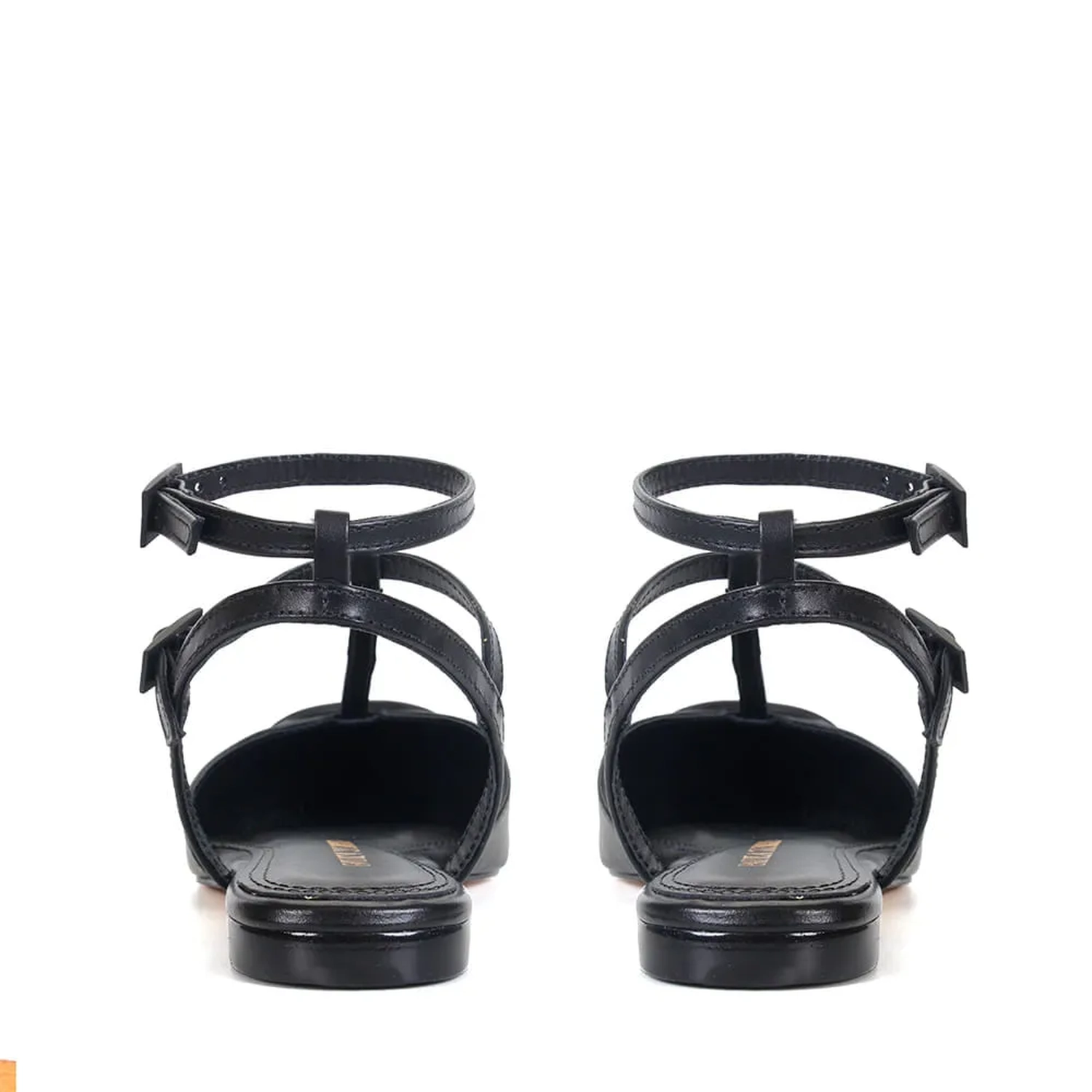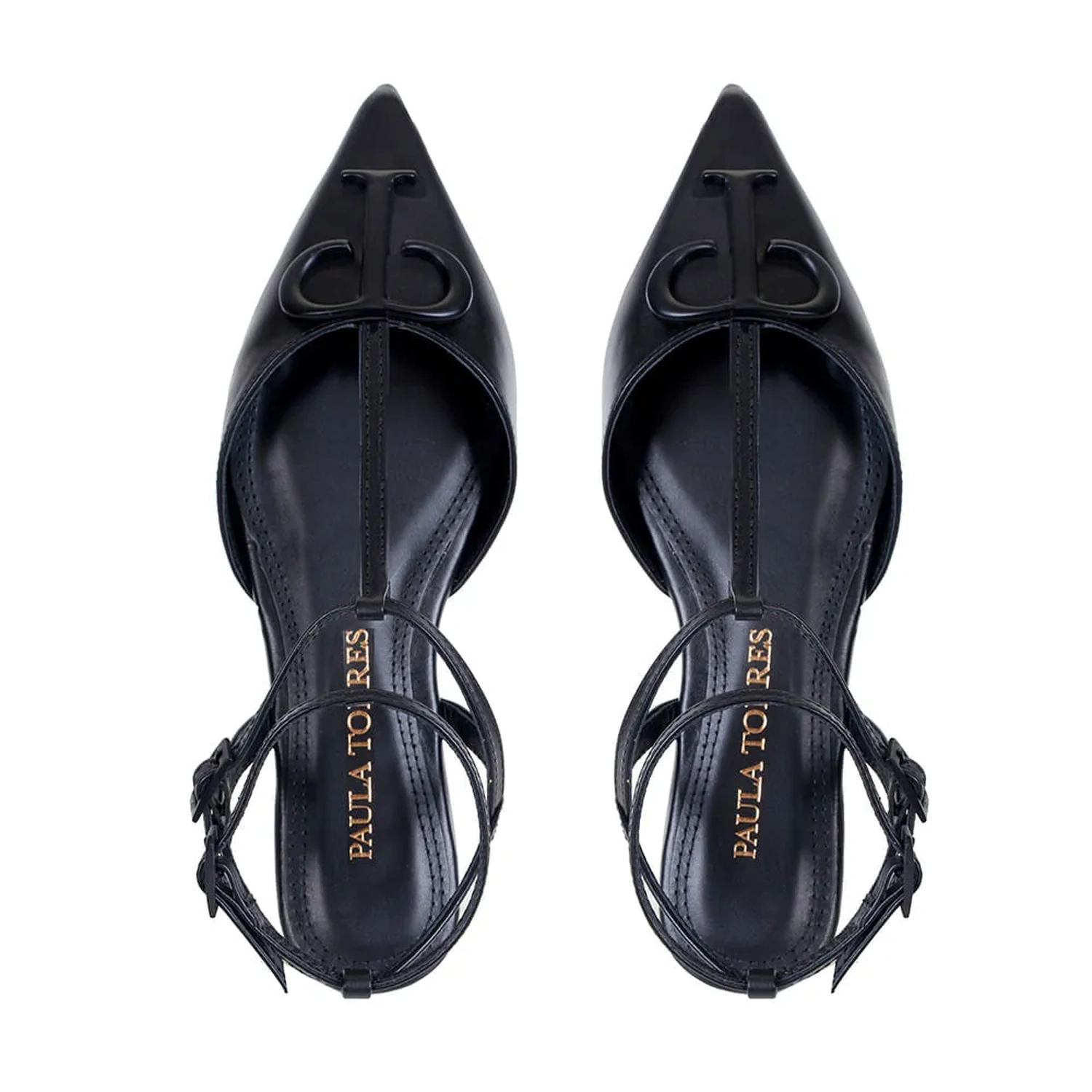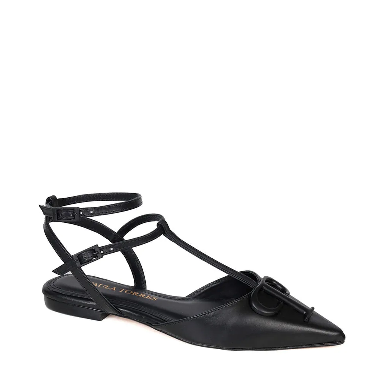 Confeccionada em couro e tiras finas no tornozelo, o modelo de bico fino traz muita feminilidade com o conforto da flat. Detalhe superior do monograma Paula Torres.