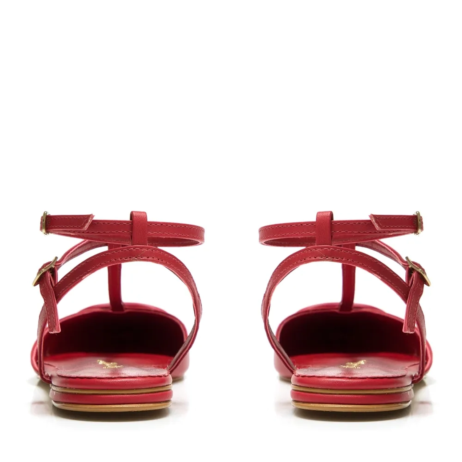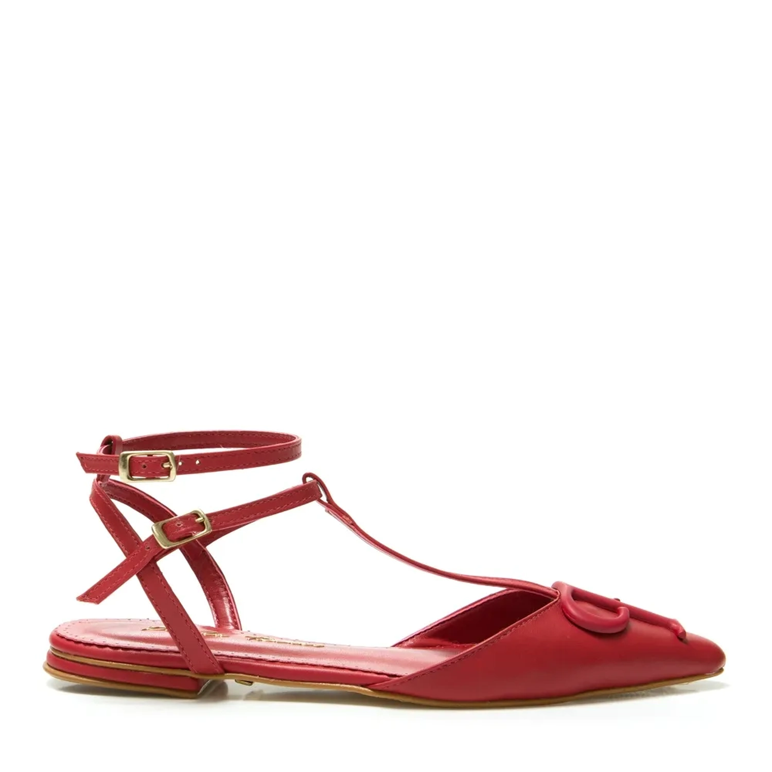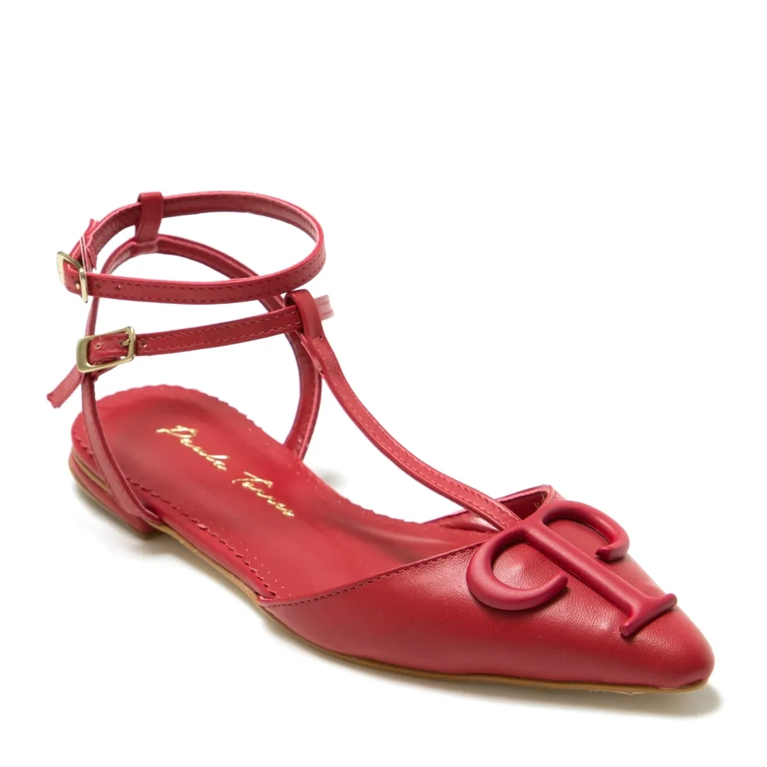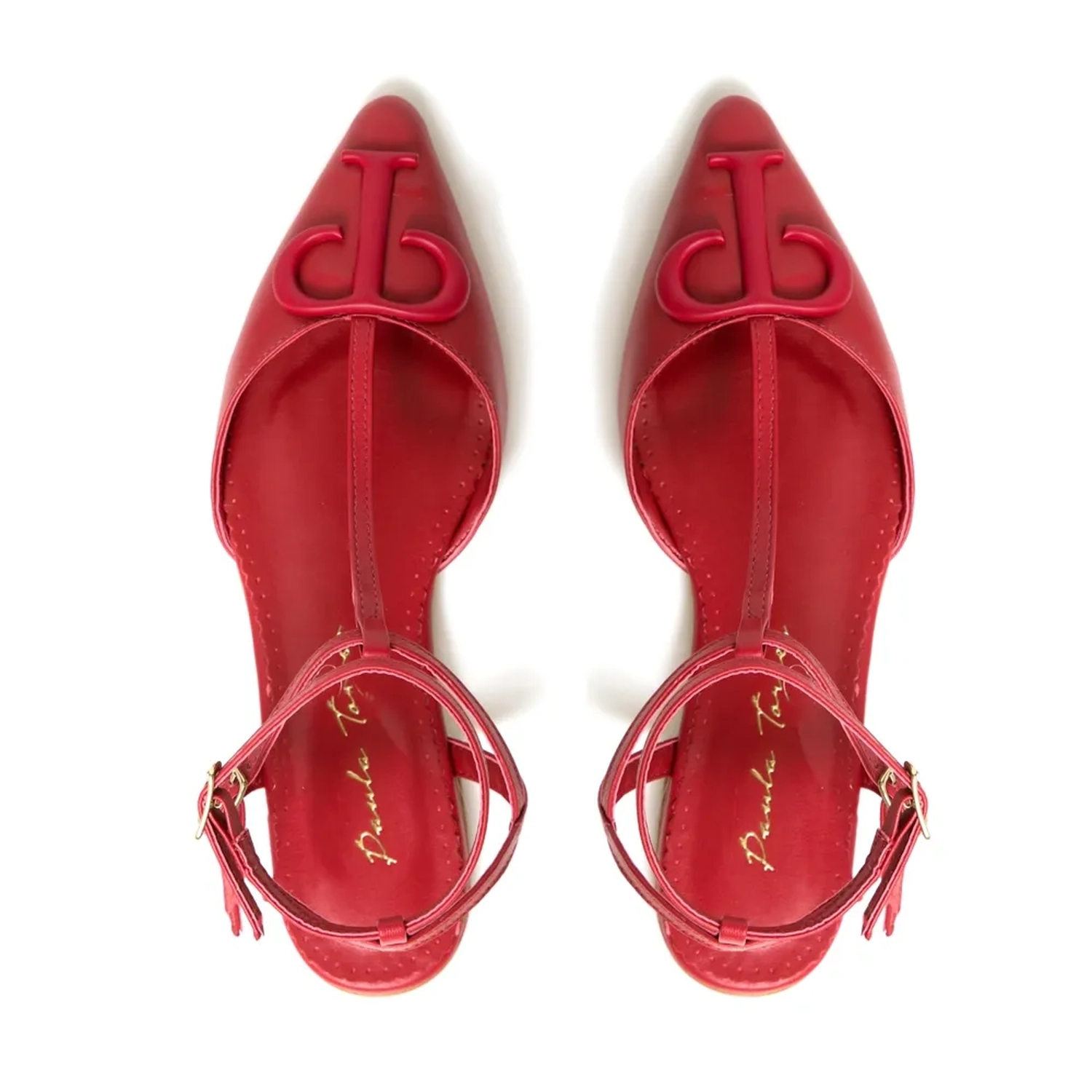 A Sapatilha Paula é confeccionada em couro. A peça possui bico fino e tiras finas no tornozelo com ajuste lateral feito por fivela e detalhe superior do monograma Paula Torres. Cor: Vermelho