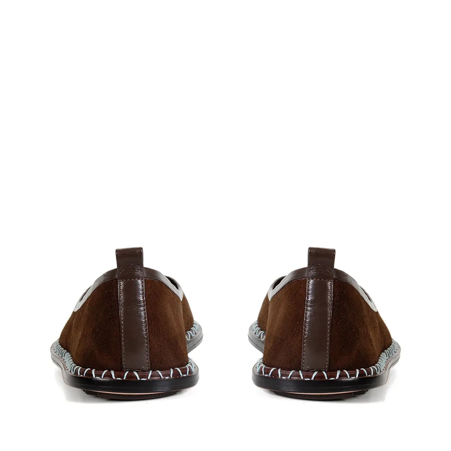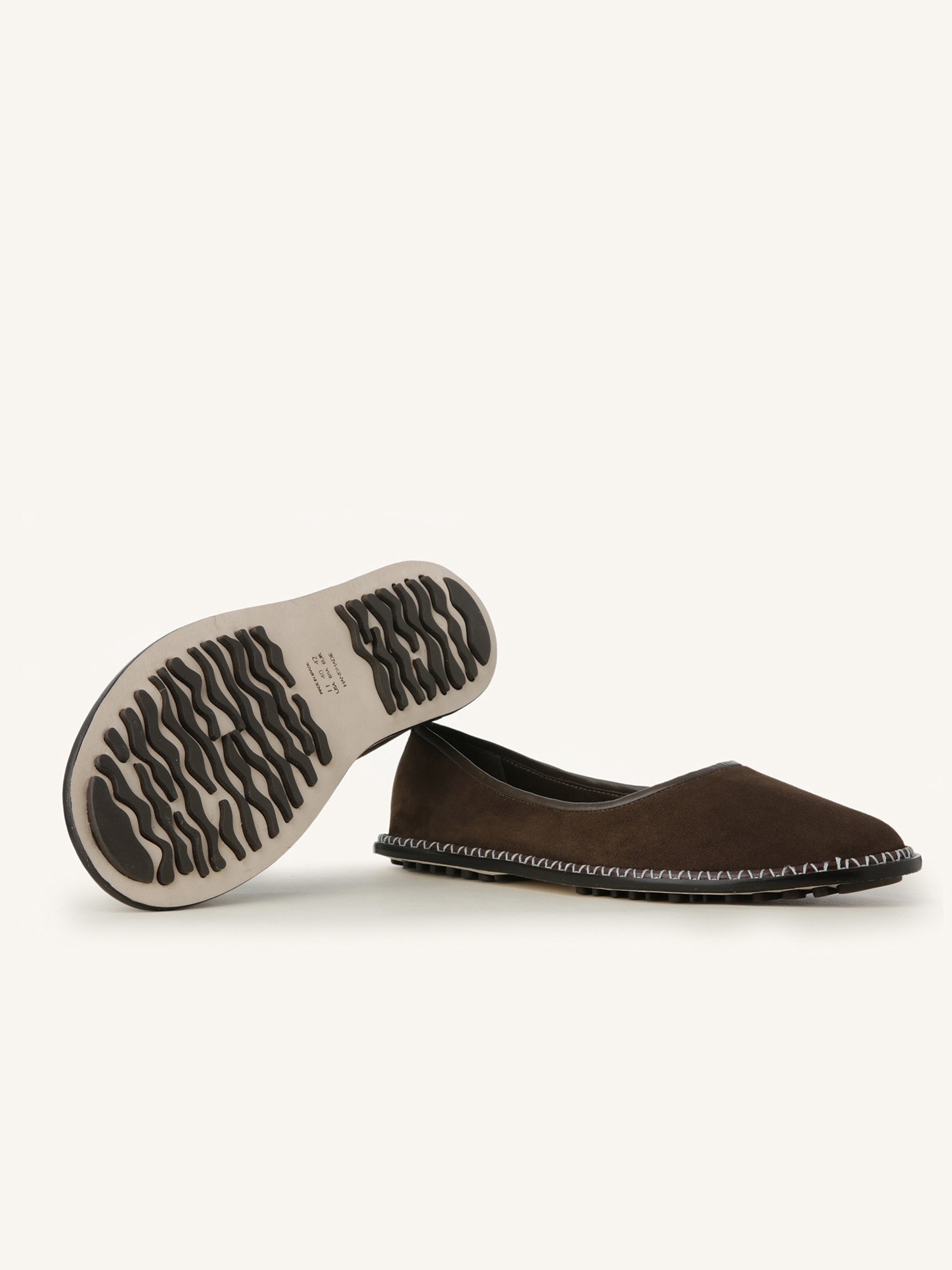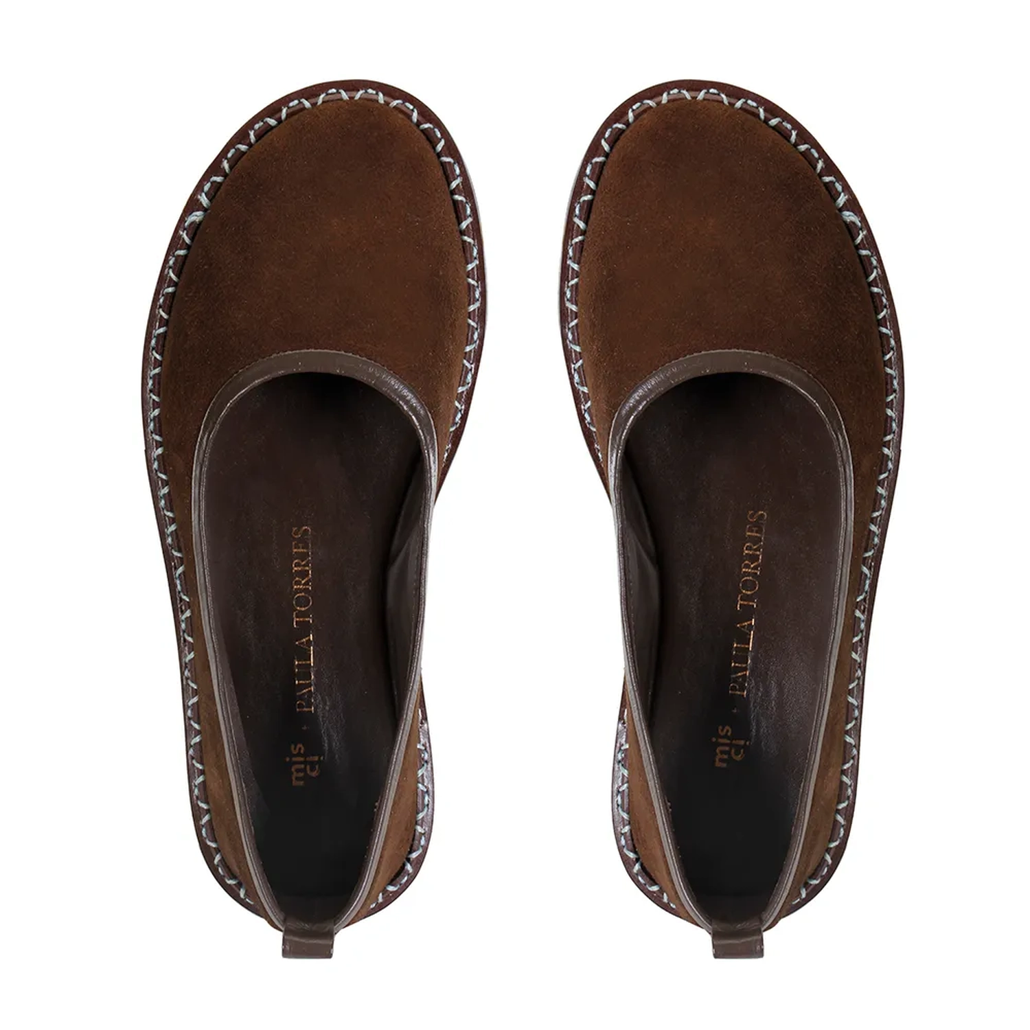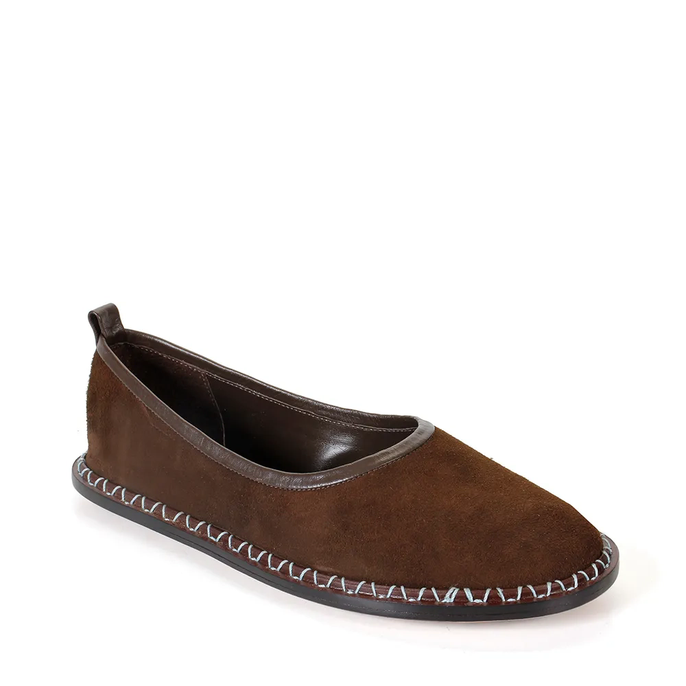 Uma das peças da coleção Paula Torres + Misci, a Sapatilha Santana na cor Café é confeccionada em camurça de alta qualidade. O design de bico arredondado ganha uma releitura contemporânea com a aplicação de uma vira larga em couro liso, finalizada com costura aparente. O debrum em napa no cabedal reforça o contraste de texturas com sofisticação.