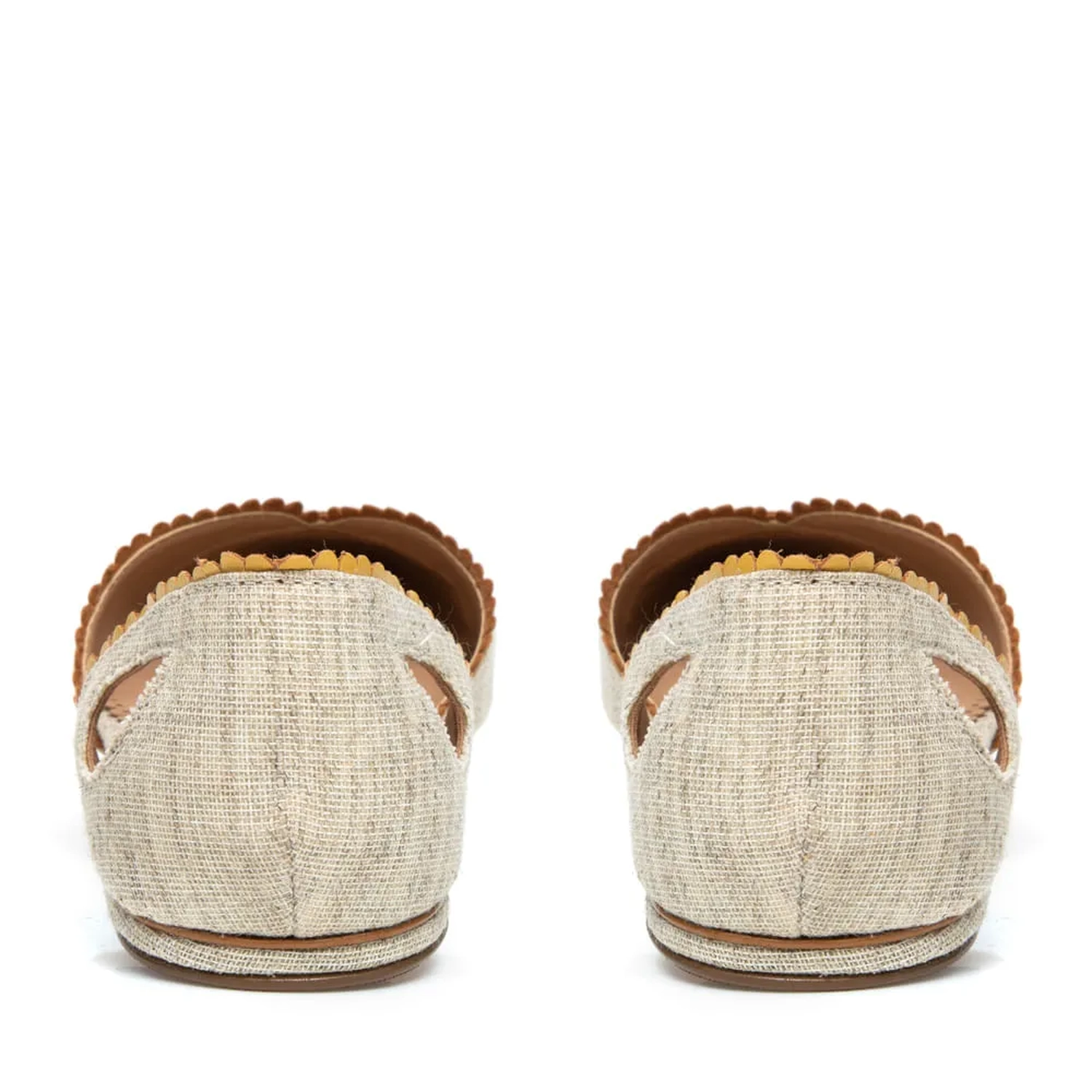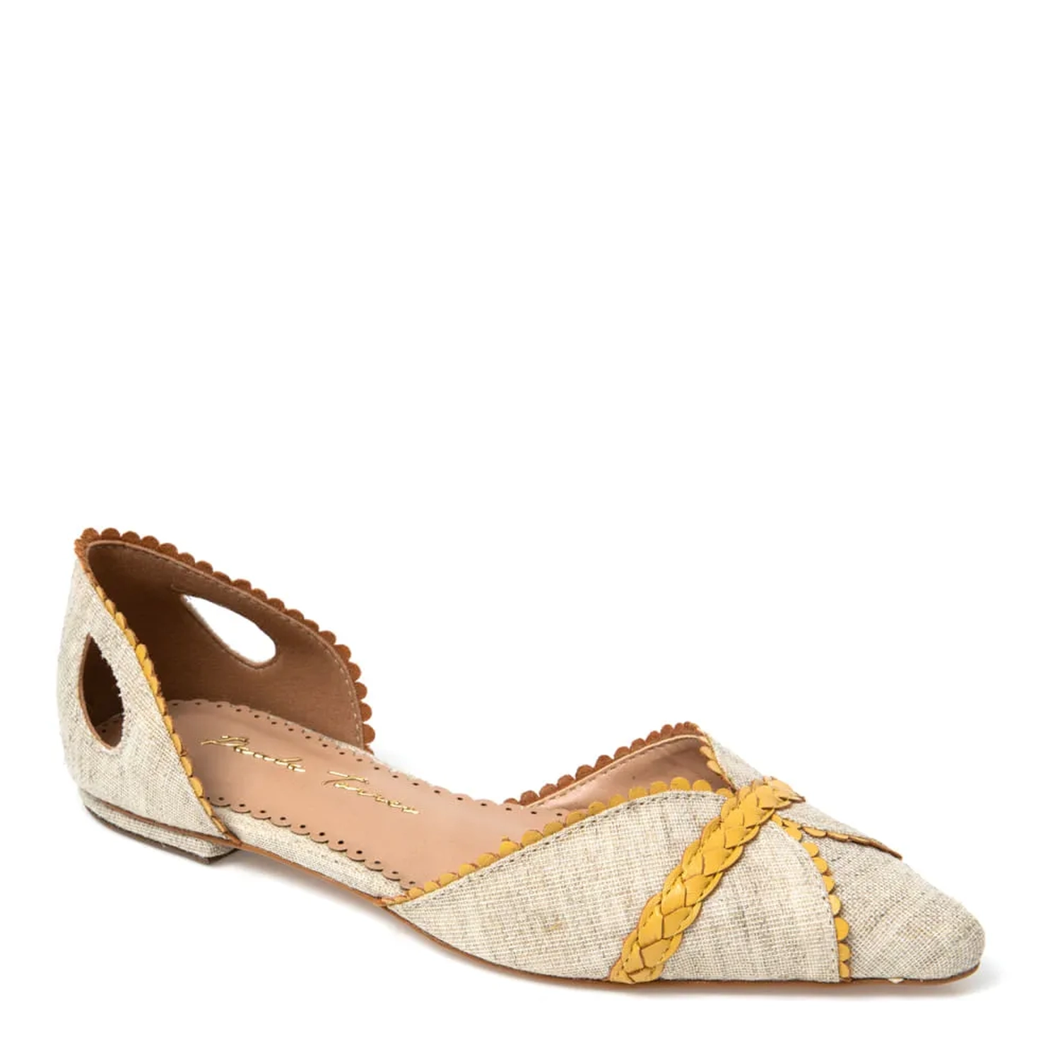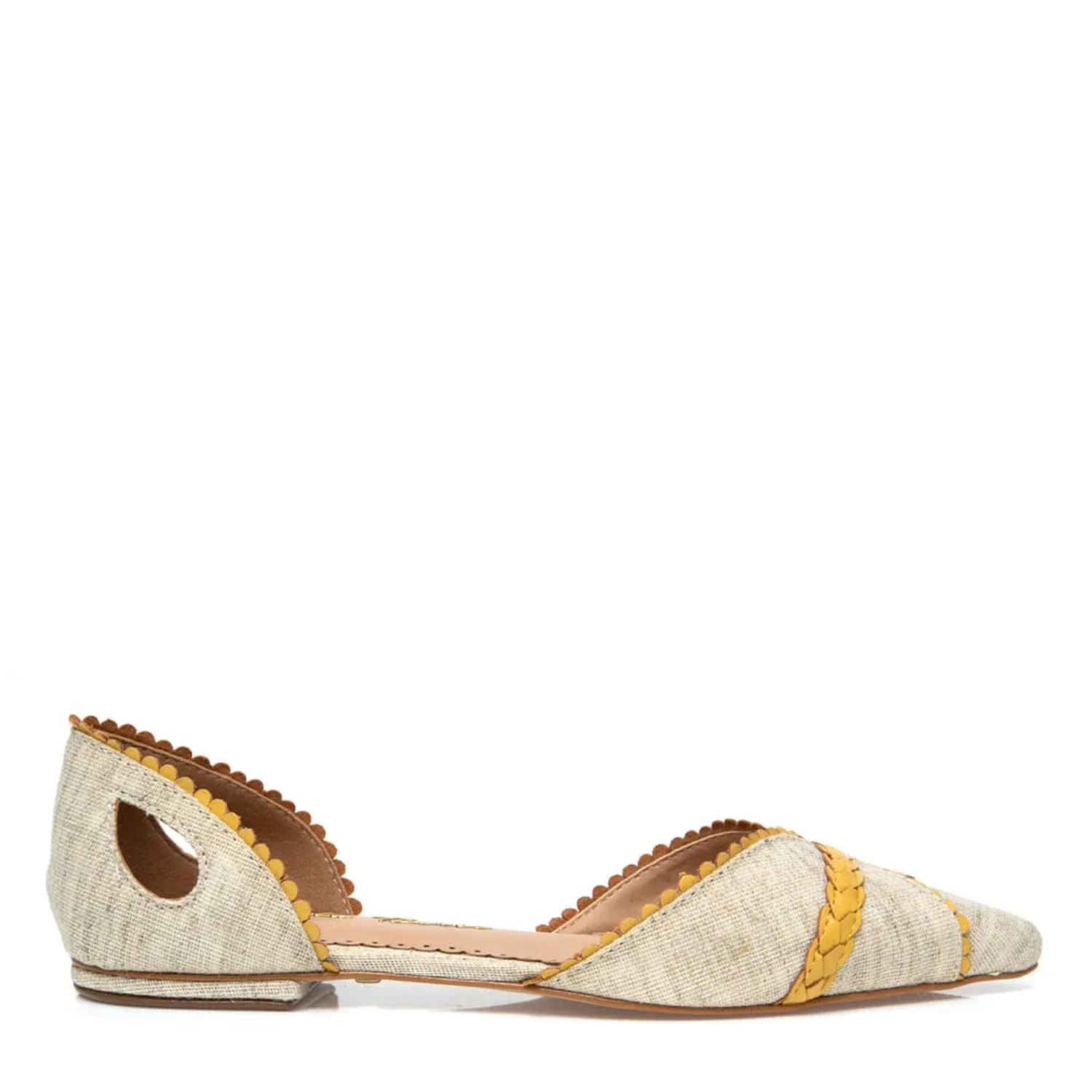 A Sapatilha Stella é confeccionada em tecido. Modelagem em bico fino e bordas do cabedal e calcanheira trabalhadas. Trança de couro na parte frontal. Detalhe de recorte em forma de pétala nas laterais da calcanheira, dão um toque especial ao modelo.