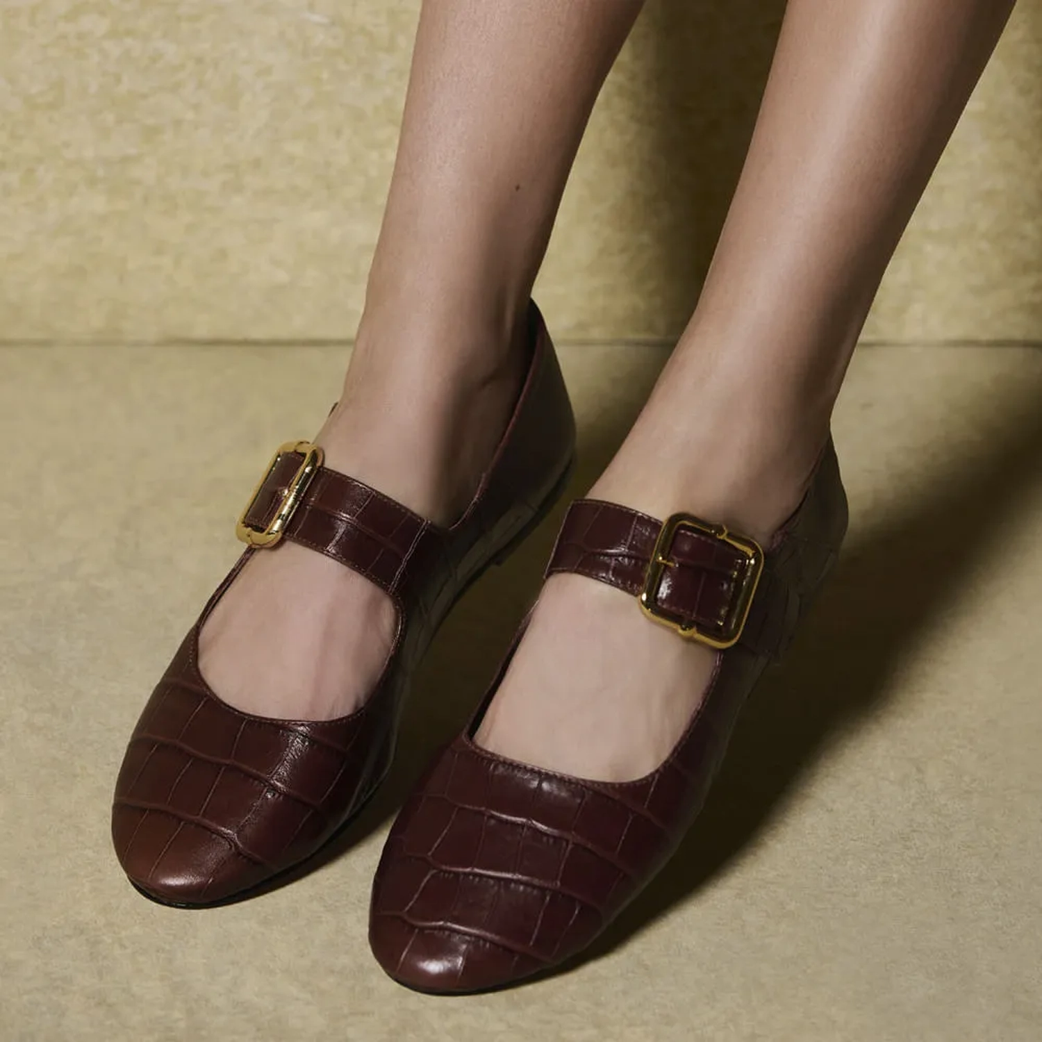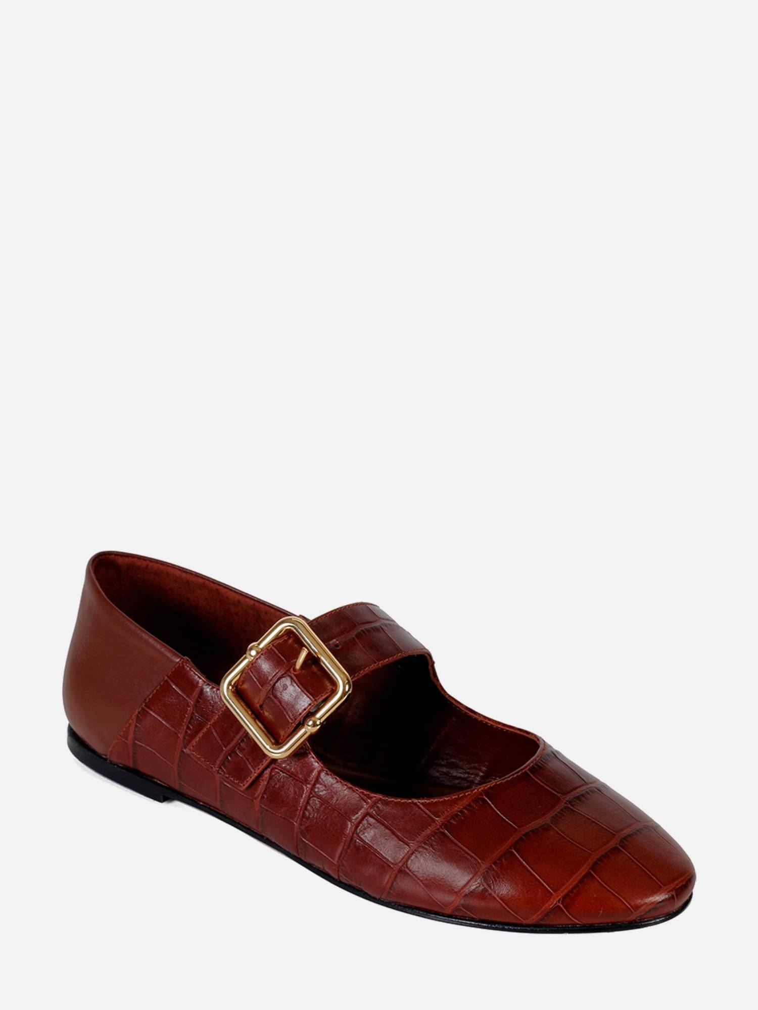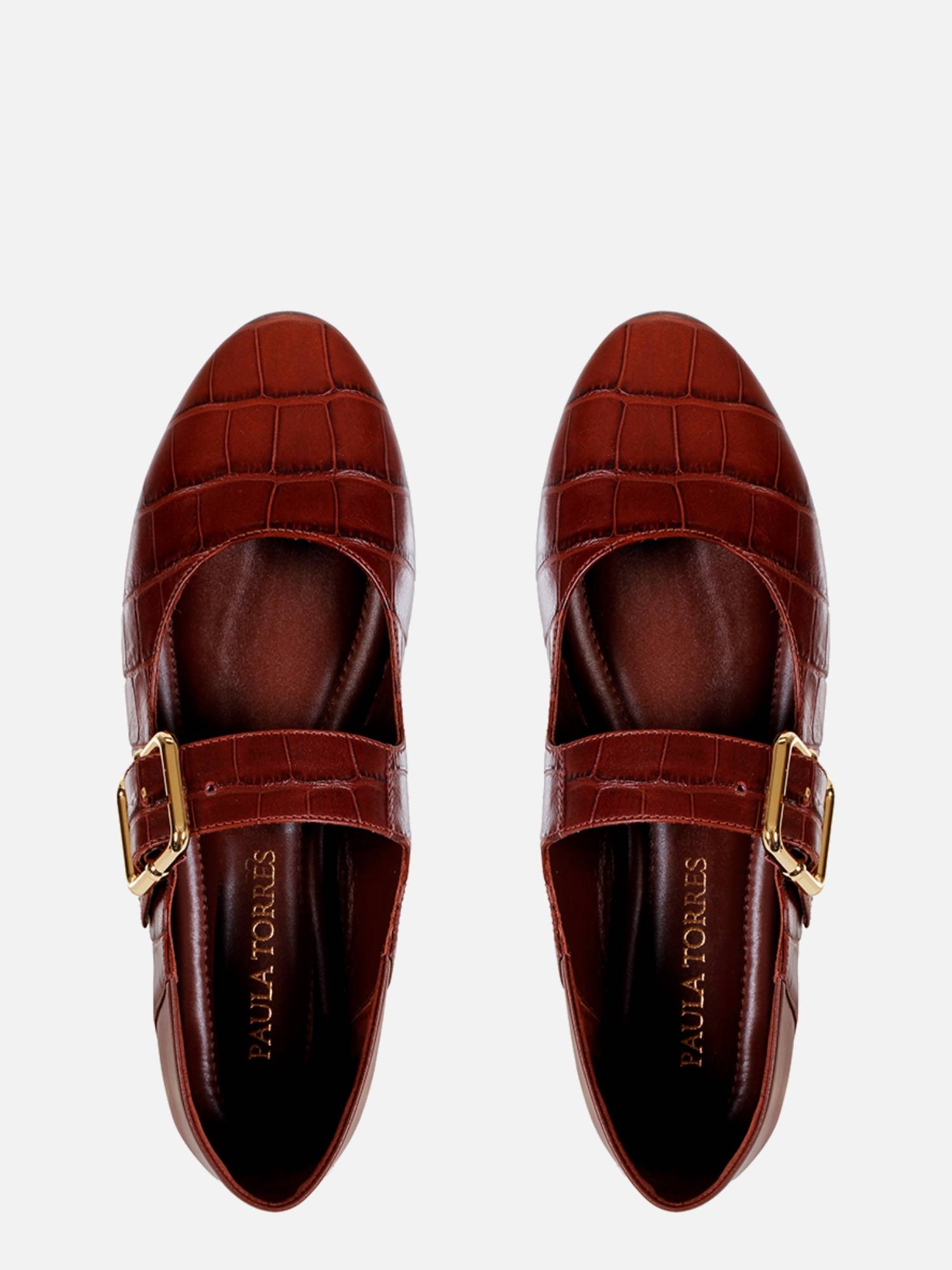 A Sapatilha Suri é confeccionada em couro com estampa croco. O modelo de bico arredondado possui uma tira ajustável sobre o peito do pé, adornada com uma elegante fivela metalizada dourada na lateral. Para maior conforto, o calcanhar é produzido em couro extra macio, sem costuras. O solado em couro complementa o design, garantindo qualidade e durabilidade.