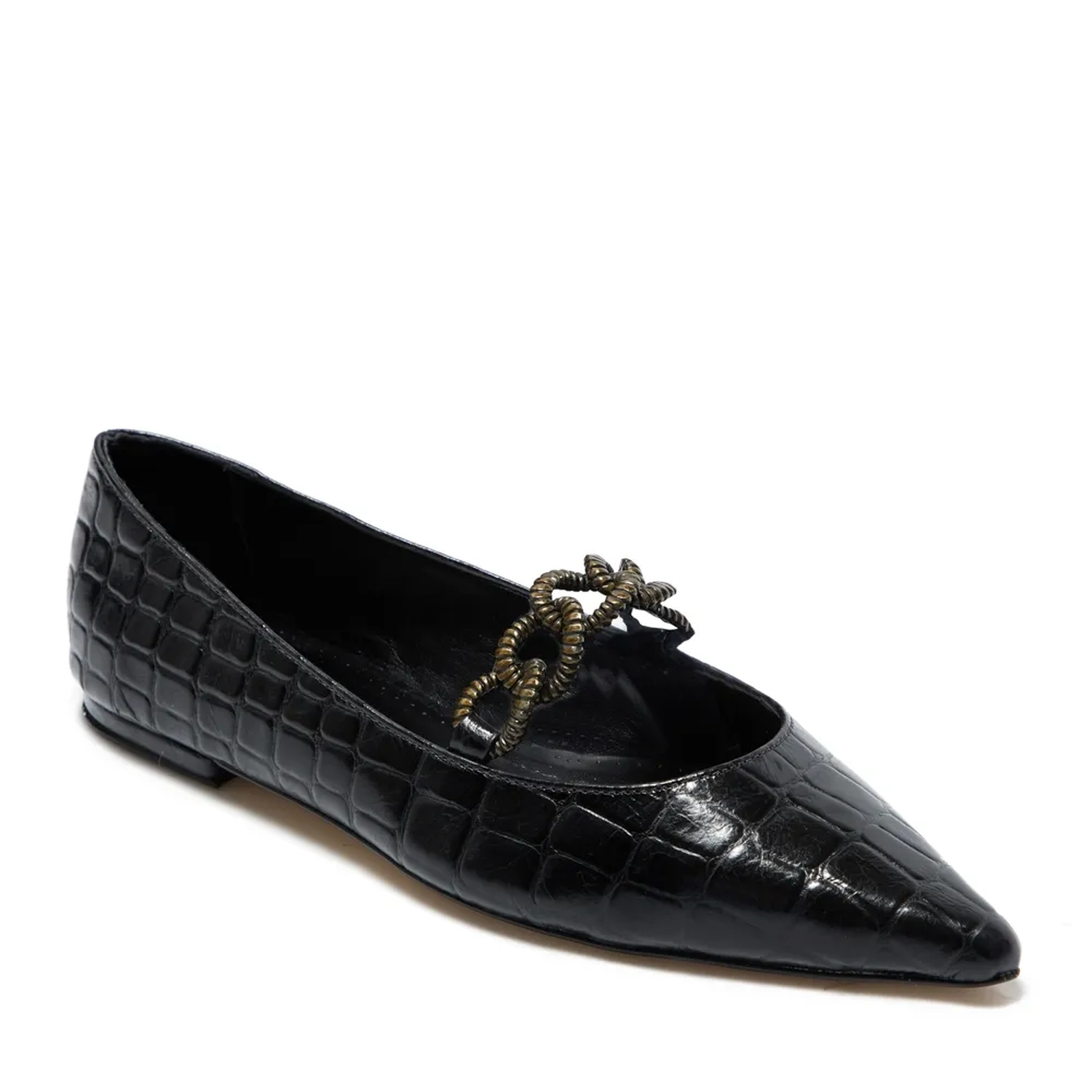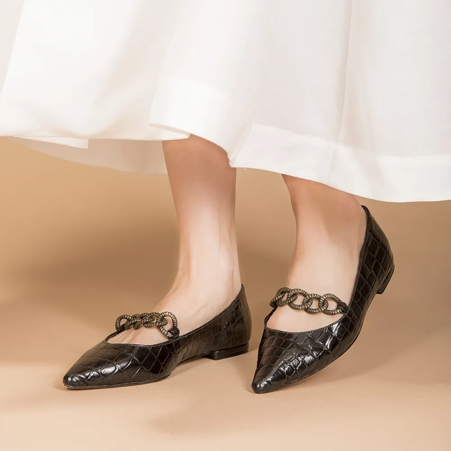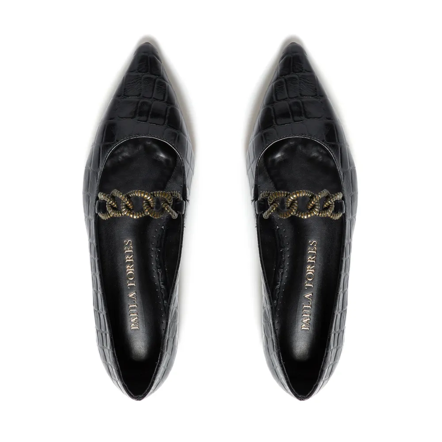 A Sapatilha Toronto é confeccionada em couro com textura croco. O modelo combina referências de moda com delicadeza no desenvolvimento. Sua construção é toda em couro com bico levemente fino e alongado, salto forrado com o mesmo couro do cabedal. O ponto chave fica no detalhe em corrente com elos no tom de ouro velho que acrescenta sofisticação. Uma peça eterna e atemporal que reafirma o design autoral, elegância, feminilidade e conforto que estão presentes no DNA Paula Torres.