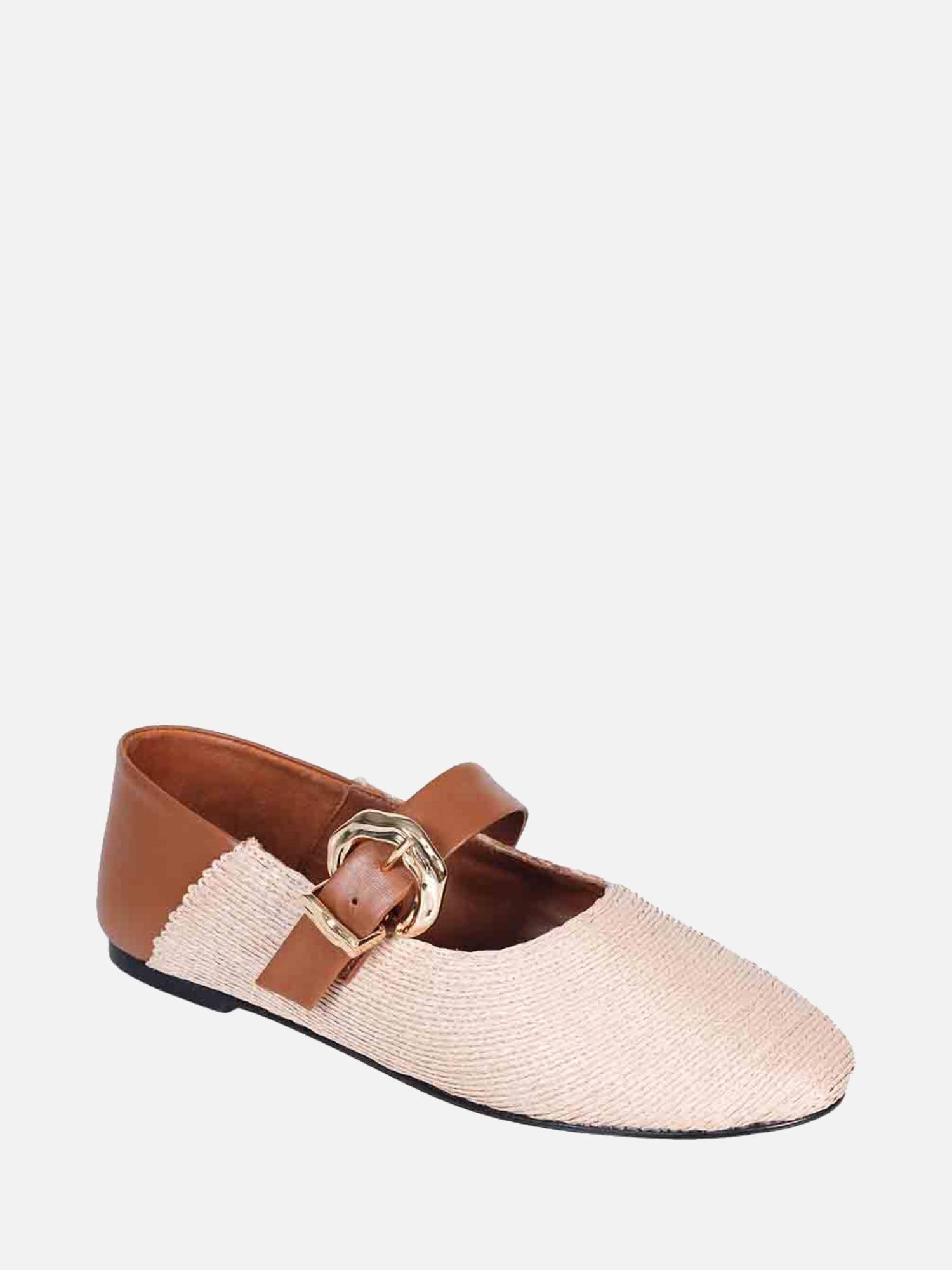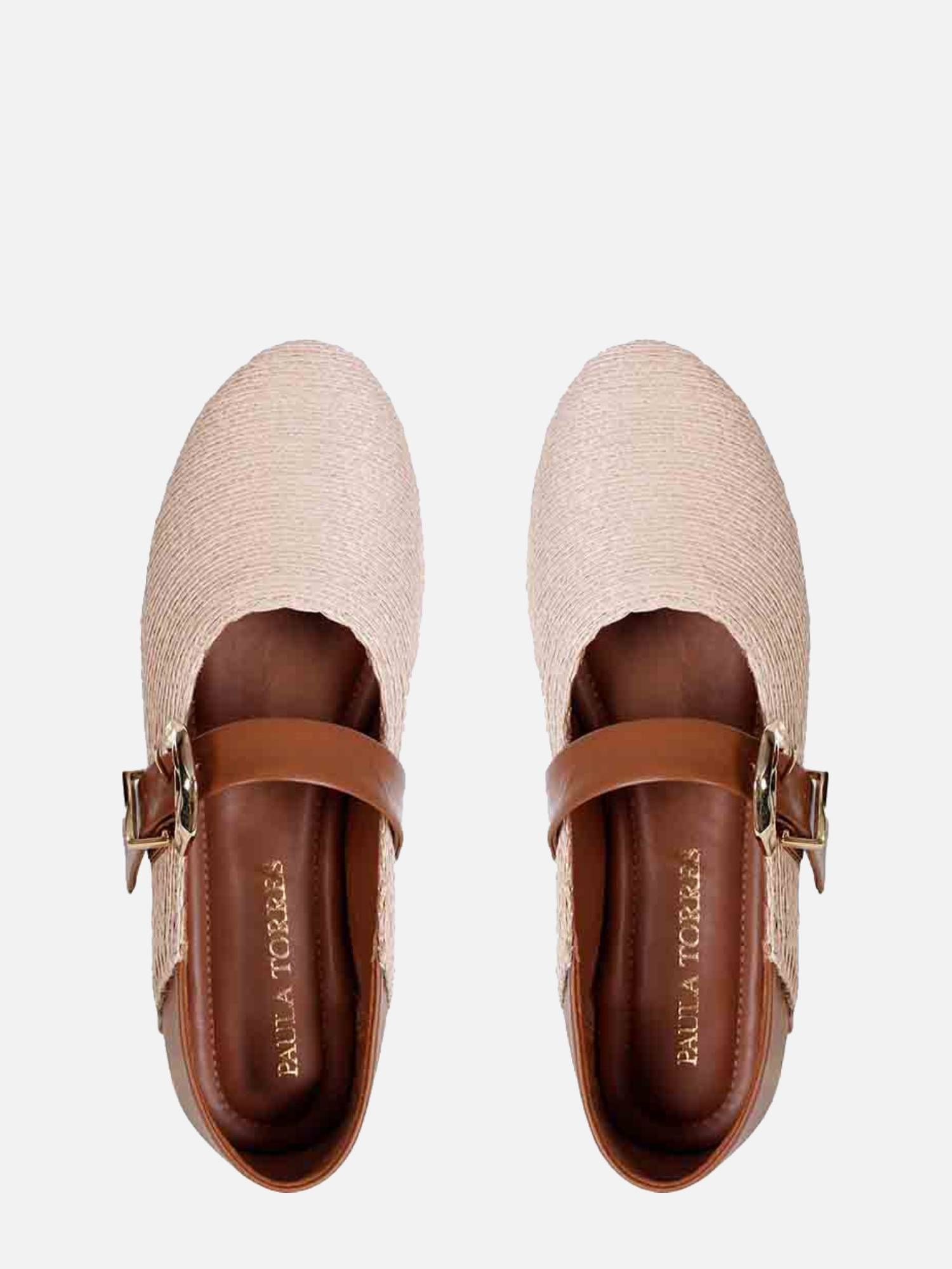 A Sapatilha Vênus é confeccionada com bordado de ráfia, um material plástico leve, resistente e reciclável, amplamente utilizado por sua durabilidade e leveza. O modelo estilo mary jane possui bico arredondado e uma tira em couro sobre o peito do pé, adornada com uma fivela orgânica exclusiva, desenvolvida pela Paula Torres, em acabamento ouro escovado. O calcanhar, feito em couro macio, proporciona conforto extra, enquanto o solado em couro garante maior durabilidade à peça.
