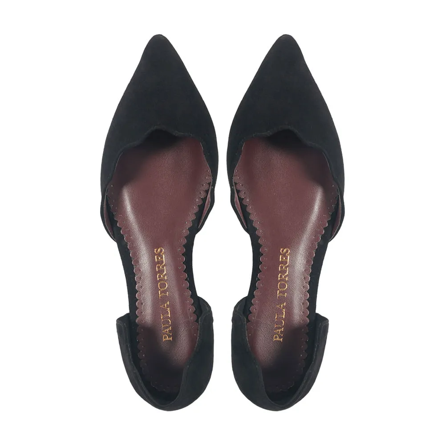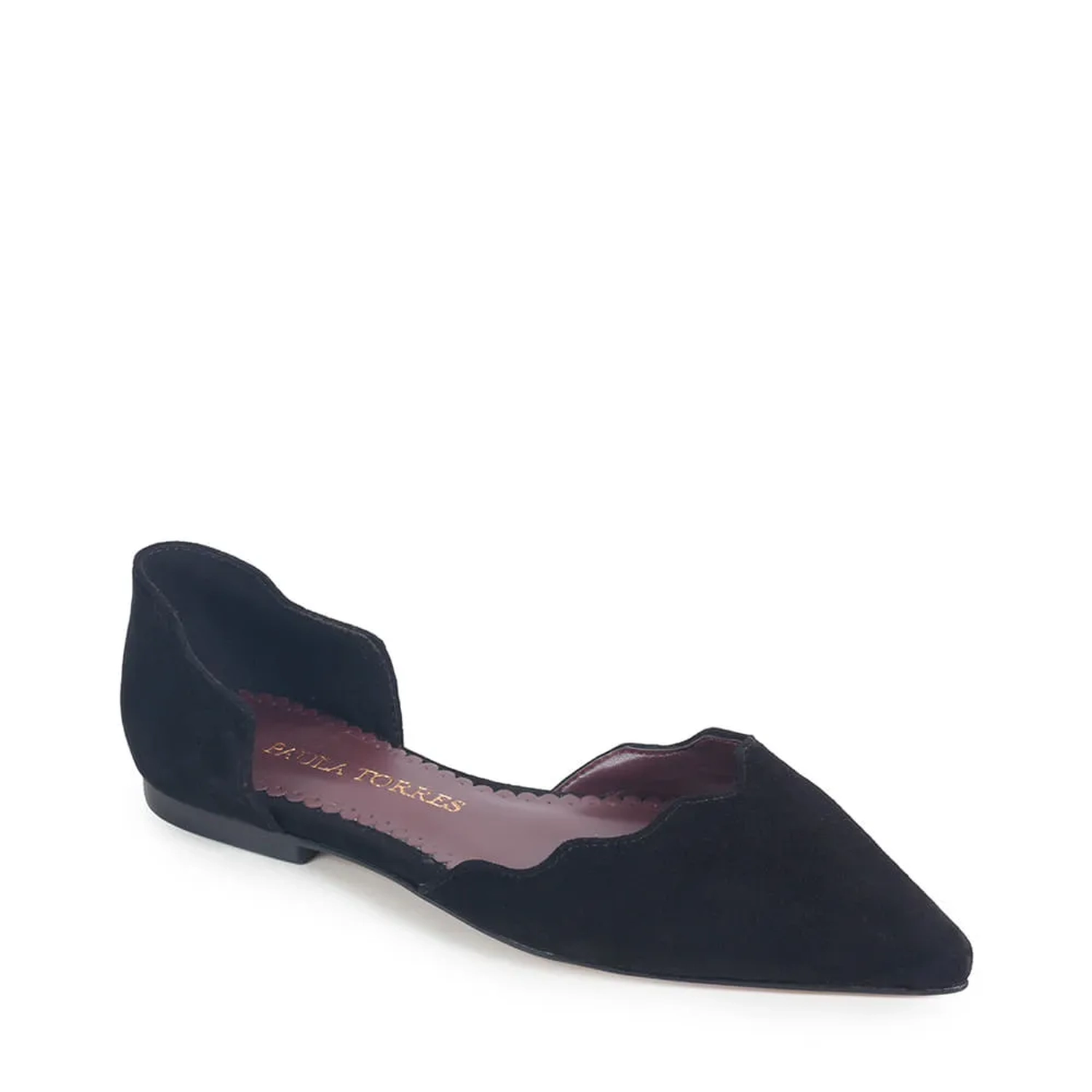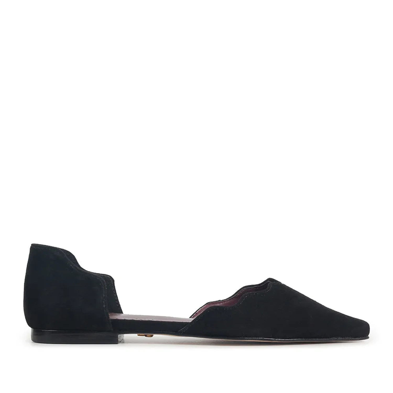 A Sapatilha Zurique é confeccionada em camurça. O modelo conta com bico fino e recorte ondulado com pespontos na cor do couro e uma abertura lateral. Detalhe também para a palmilha na cor merlot.