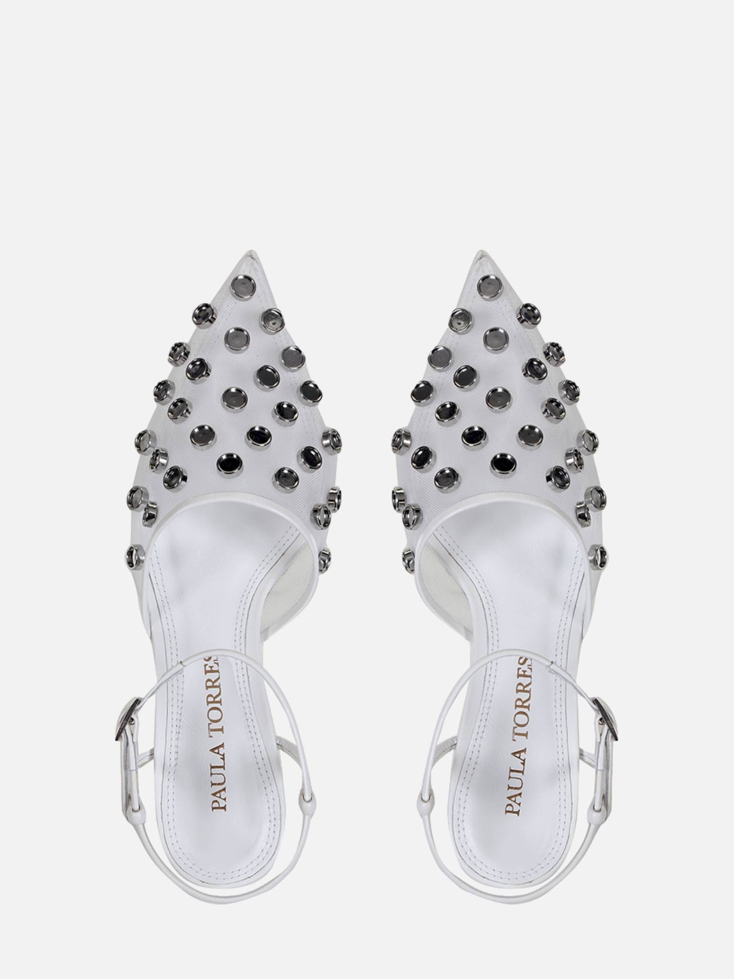 Apresentamos o Scarpin Aurora agora em outra versão, com salto. Escolha esse modelo para incorporar autenticidade ao seu visual. Ele é confeccionada em tecido telado com a aplicação de tachas metalizadas e detalhes em couro, além do envolvente bico fino, que oferece uma dose extra de estilo e sofisticação. Possui tiras aplicadas que adornam o tornozelo com fechamento por fivela superior que proporciona praticidade e um ajuste perfeito a cada passo. Uma escolha assertiva para quem busca sofisticação, sem abrir mão do refinamento.