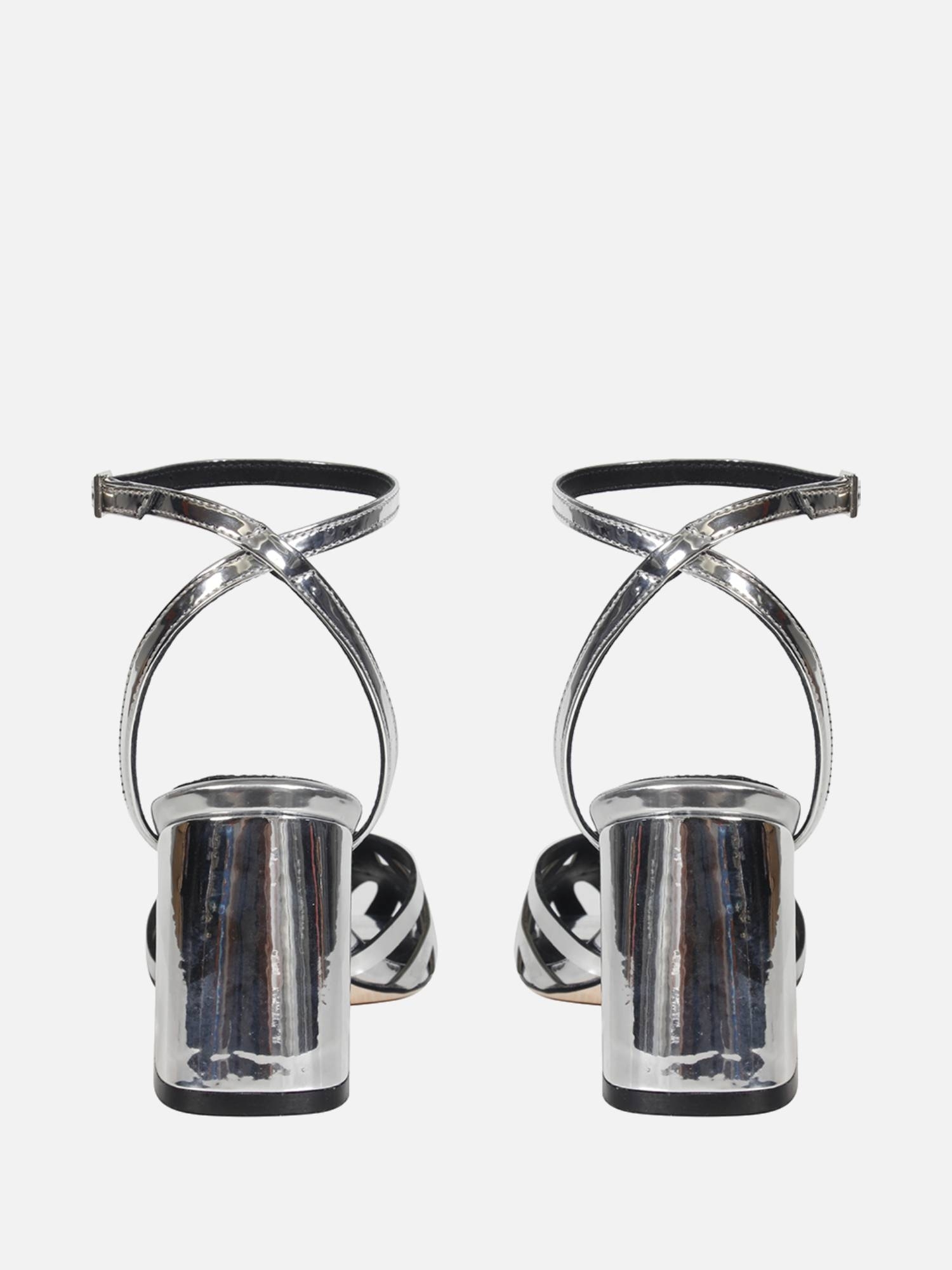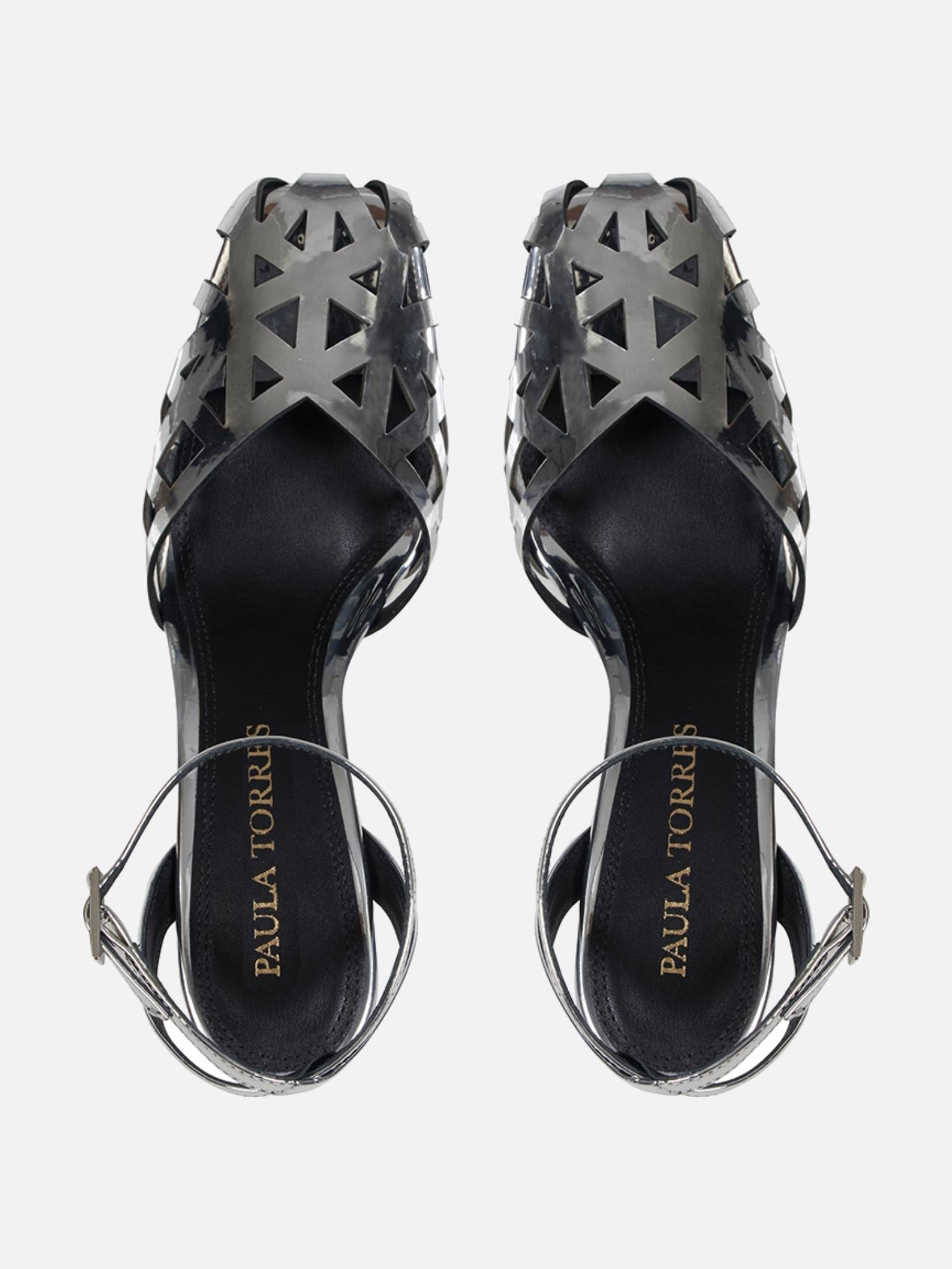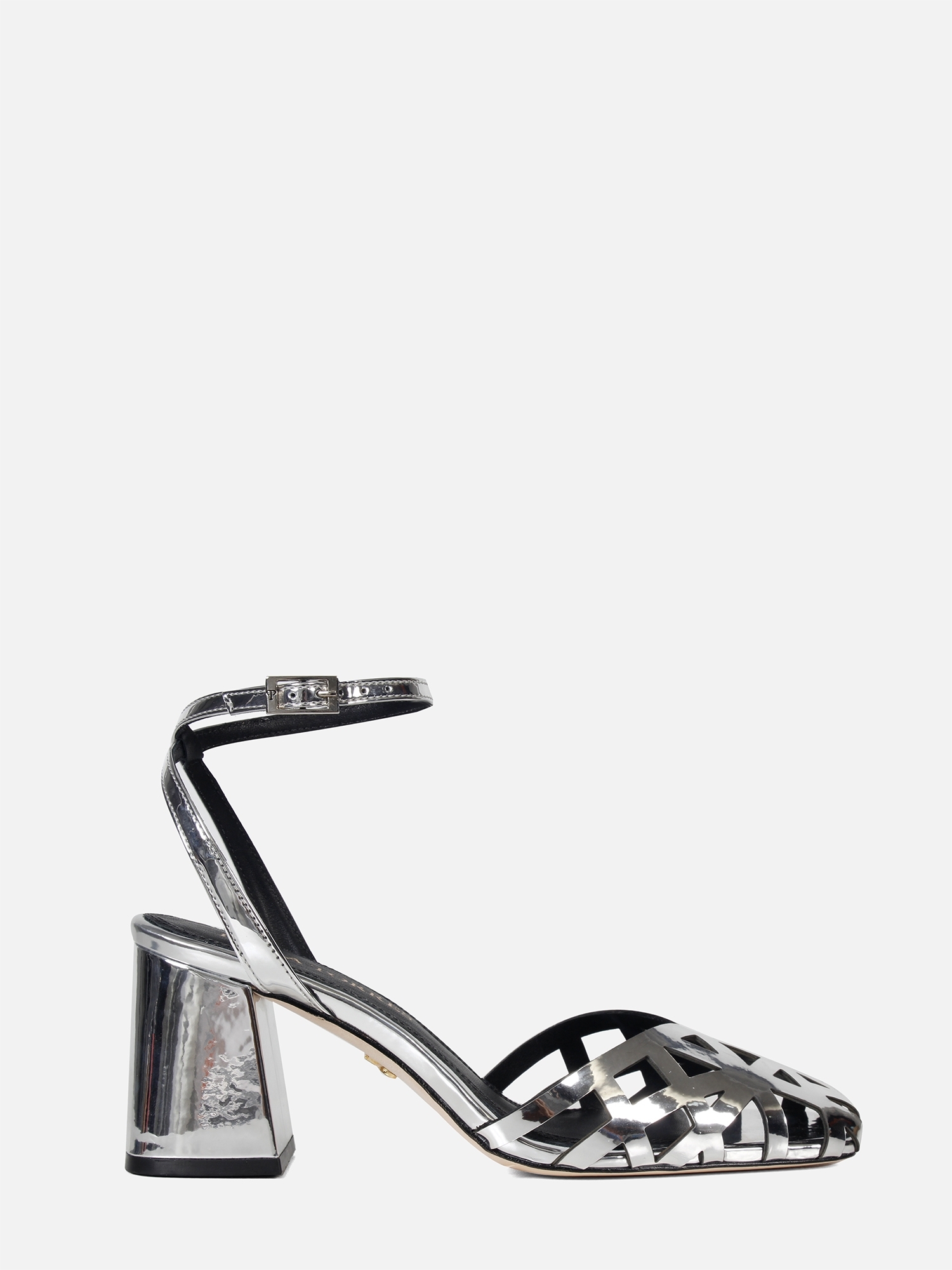 O Scarpin Frida é feito em specchio prata. O modelo possui bico quadrado e recortes feitos a laser no cabedal. Apresenta uma tira no tornozelo com fivela para ajuste e fechamento, além de um salto bloco grosso para conforto e estabilidade.
