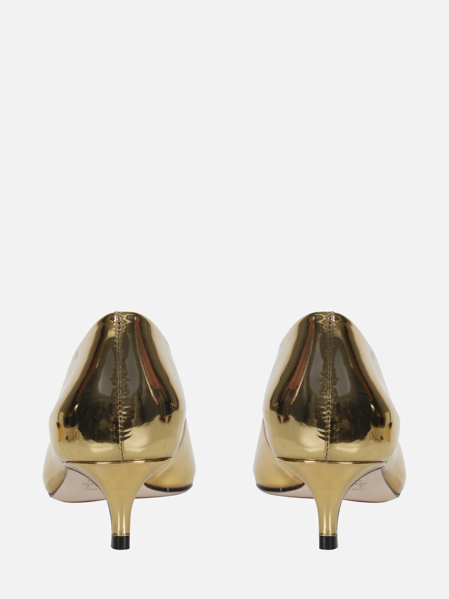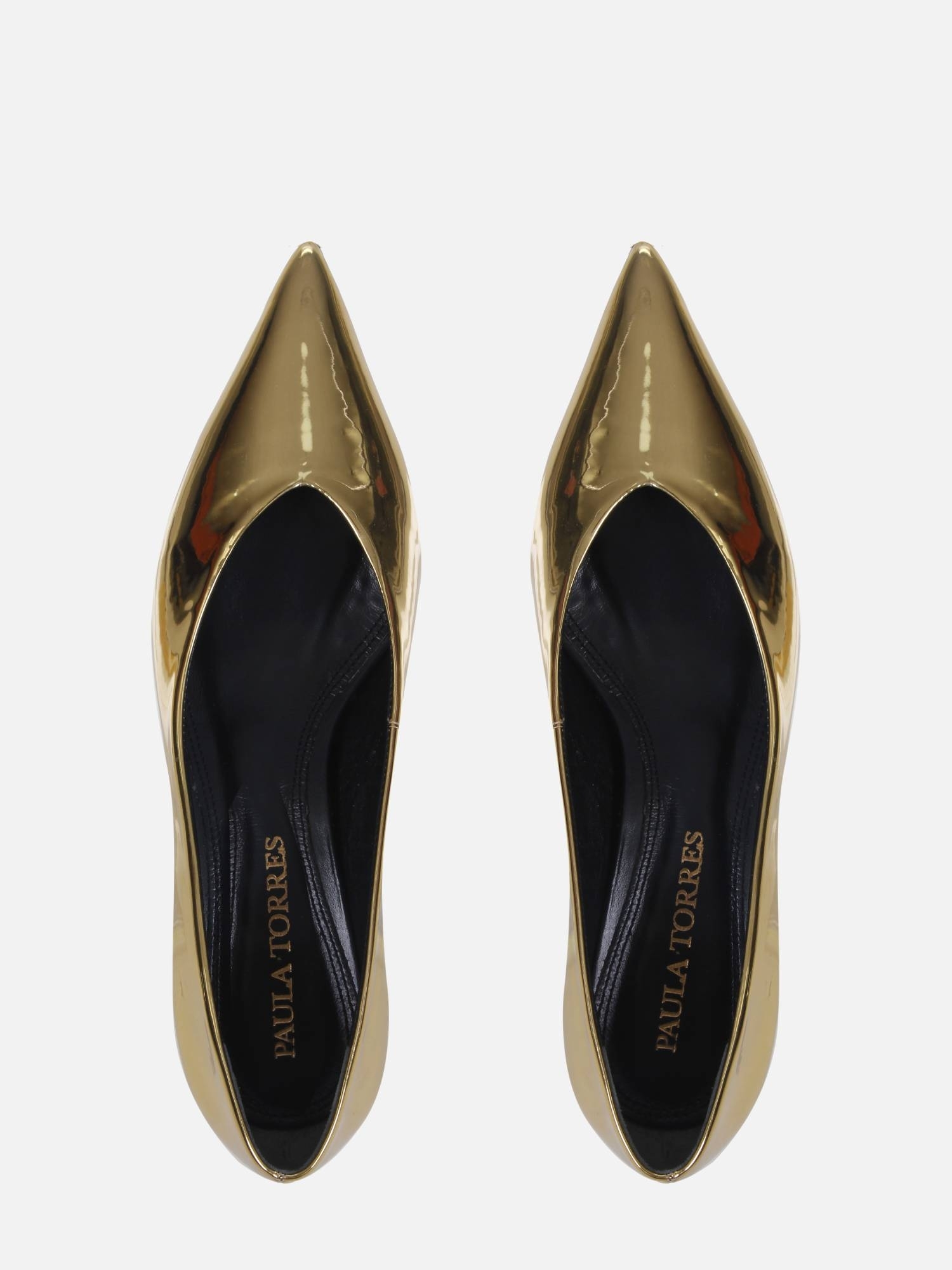 O Scarpin Iris é produzido em spechio, um material com acabamento espelhado na cor dourado. O modelo é um exemplo clássico de um sapato "high vamp", onde as laterais mais altas oferecem maior cobertura ao pé, criando um contraste interessante com o decote em V na parte frontal. Isso combinado com bico fino alongado e com salto baixo projetados para proporcionar conforto, enquanto o solado em couro contribui para a durabilidade do sapato.