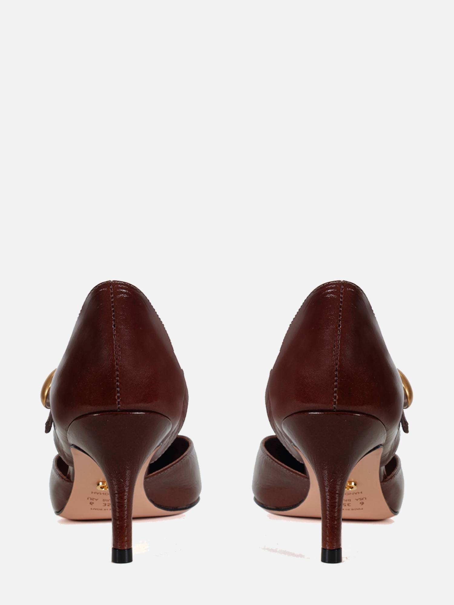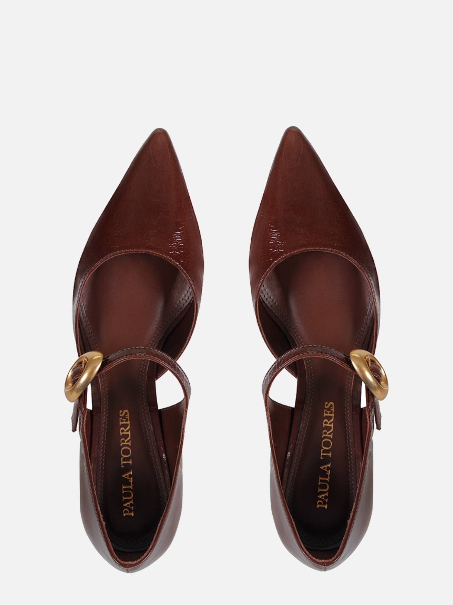 O Scarpin Julia é produzido em couro macio com um toque de brilho. O modelo de bico fino alongado e salto médio fino destaca-se pela tira sobre o peito do pé, adornada com uma elegante fivela dourada. Com calcanhar fechado e solado em couro, a peça combina conforto, elegância e durabilidade.