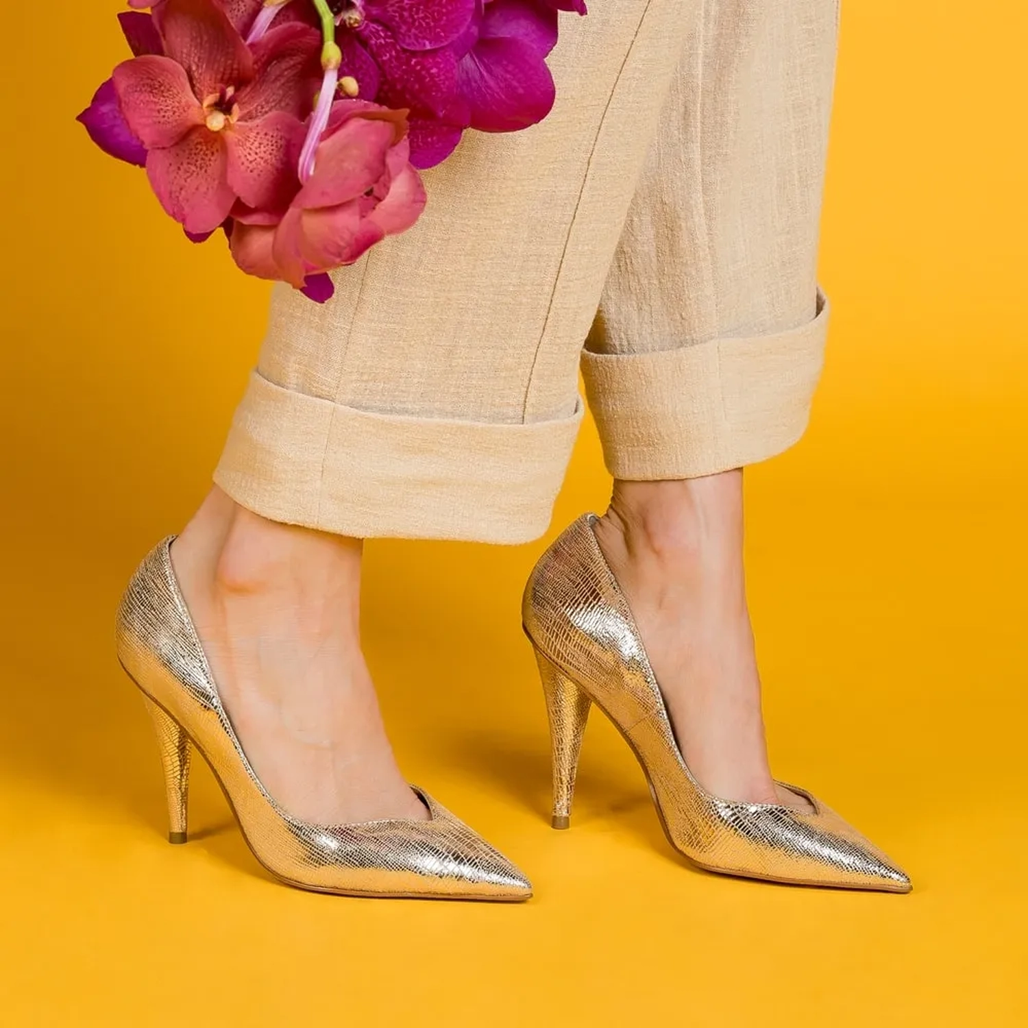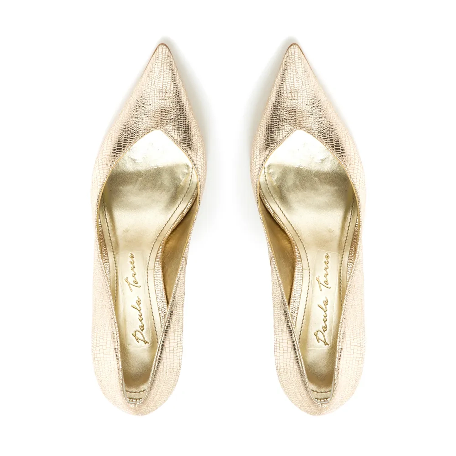 O Scarpin Madrid é cofeccionado em camurça metalizada. Modelagem em bico fino com decote em V que realça a feminilidade, salto estilizado em formato de cone e todo conforto presente no DNA Paula Torres.