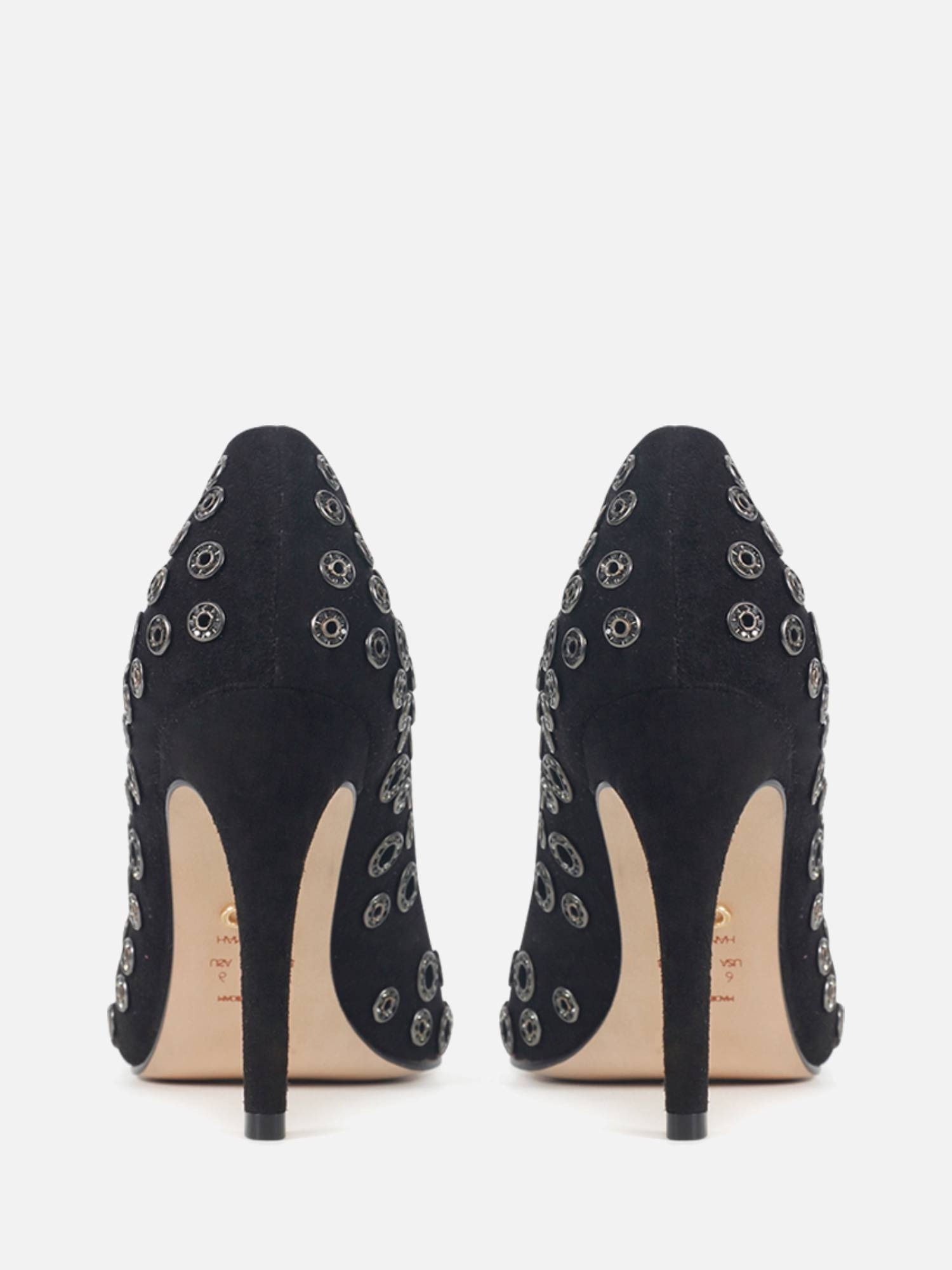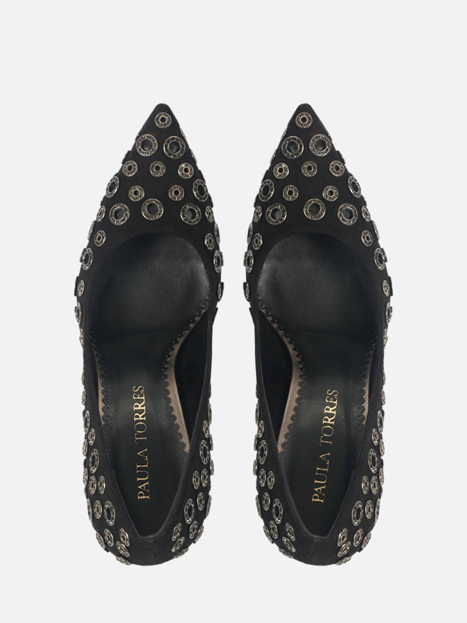 O Scarpin Niagara é confeccionado em camurça. O modelo conta com bico fino e salto alto. Sua construção clássica possui um diferencial dos ilhoses com cristais aplicados em tamanhos diferentes. Detalhe para o forro garantindo que o modelo não fique vazado.