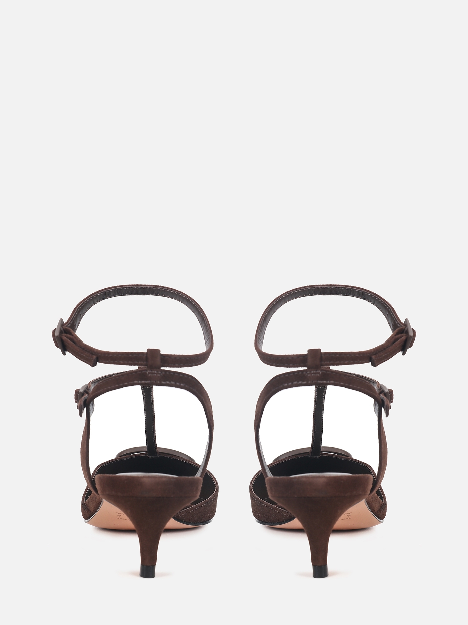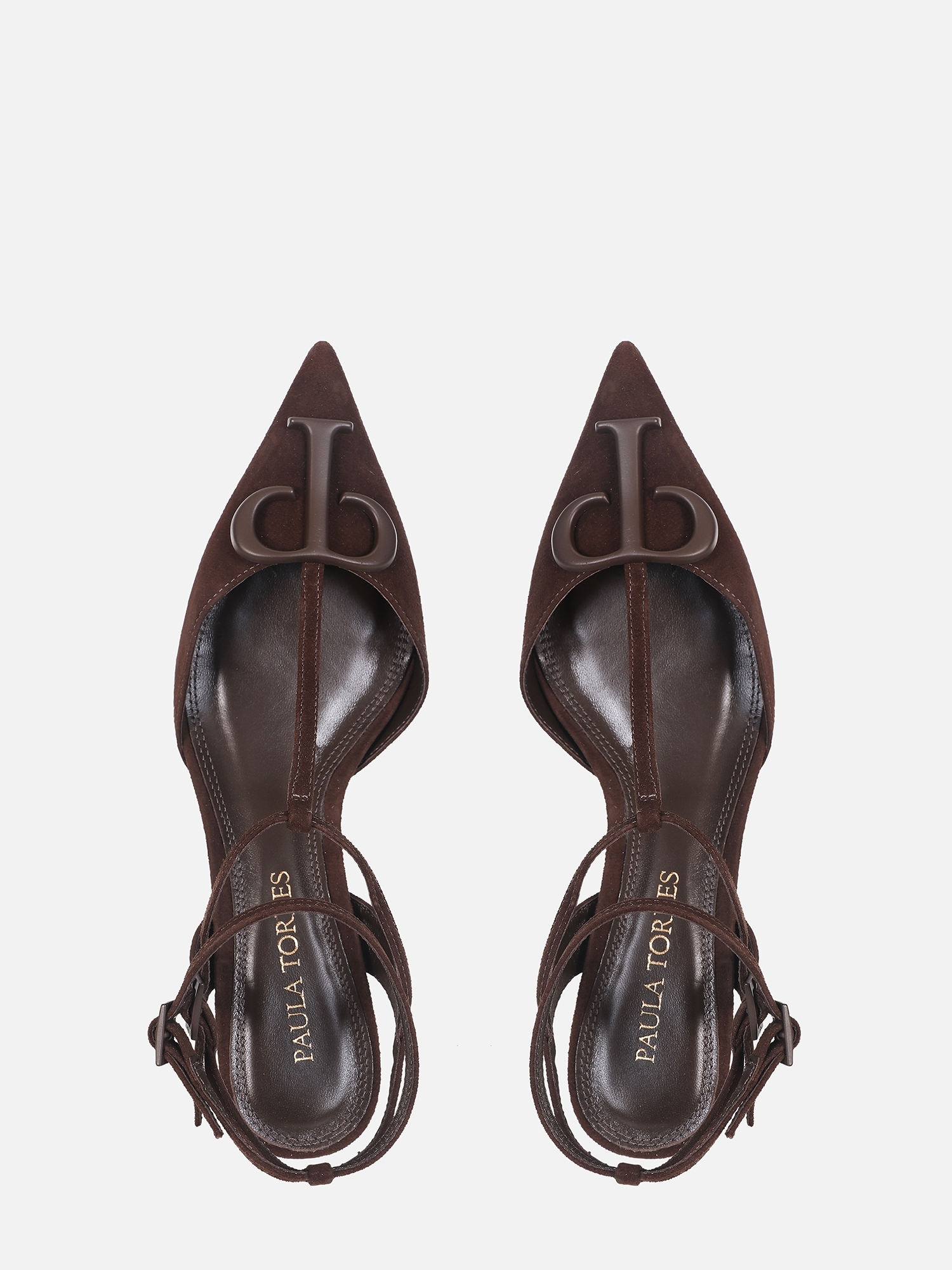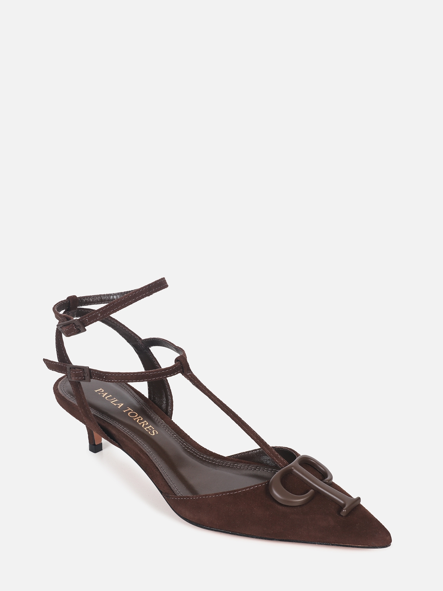 O Scarpin Paula Café é confeccionado em camurça de alta qualidade e se destaca pelo design elegante e bem-definido. O modelo possui bico fino e aplicação de metal exclusivo da marca no cabedal, acrescentando um detalhe sofisticado ao visual. As tiras delicadas que envolvem o tornozelo contam com fechamento por fivelas laterais, proporcionando um ajuste seguro e confortável.