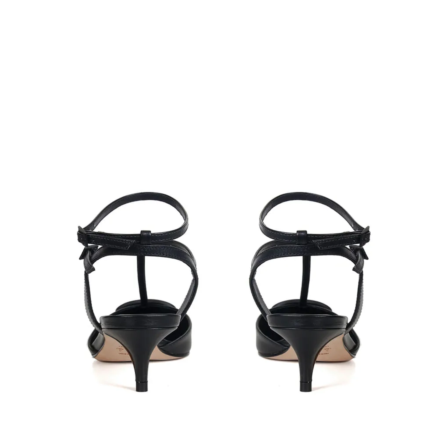 O Scarpin Paula é confeccionado em couro. A peça clássica e atemporal, possui bico fino e tiras finas no tornozelo com ajuste lateral feito por fivela e detalhe superior do monograma.