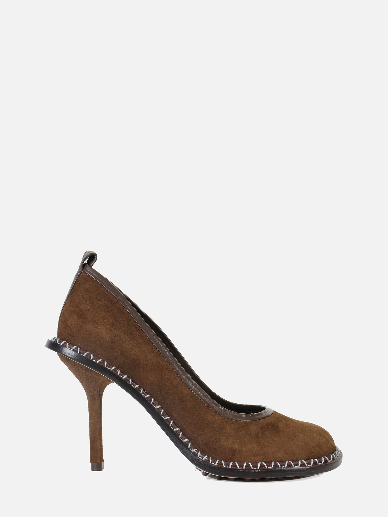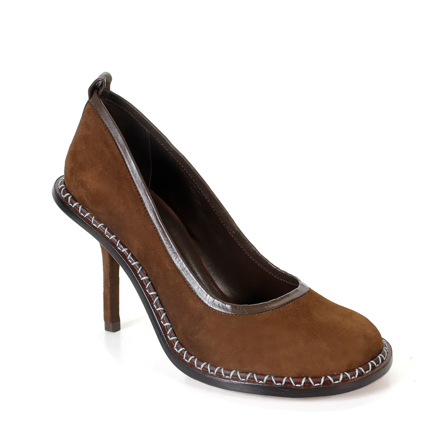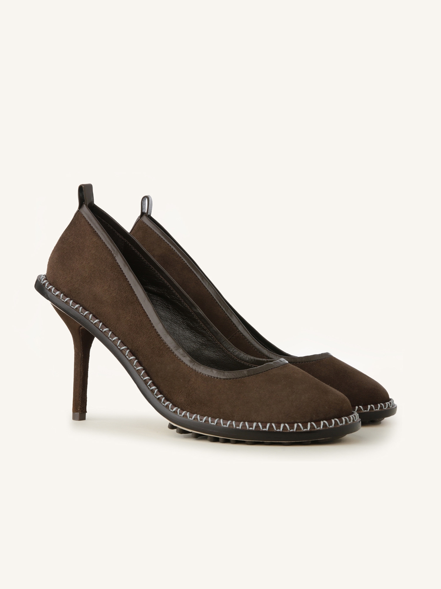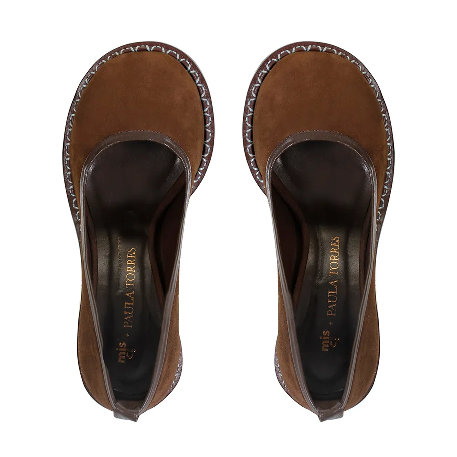 O Scarpin Santana em camurça Café, da coleção Paula Torres + Misci, destaca-se pela combinação entre artesania e design contemporâneo. Com bico arredondado e salto alto fino, o modelo traz uma vira larga em couro liso com costura aparente e debrum em napa, oferecendo um contraste de texturas elegante e sofisticado.