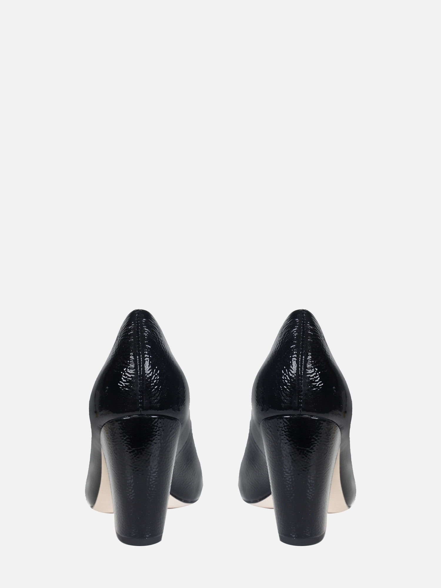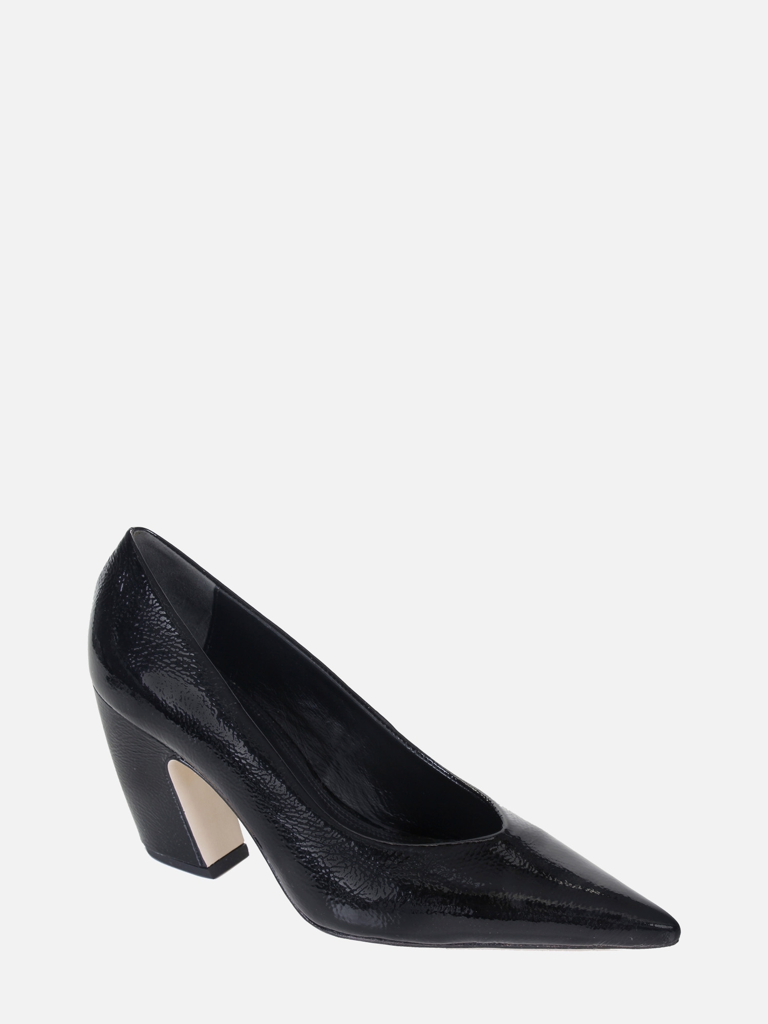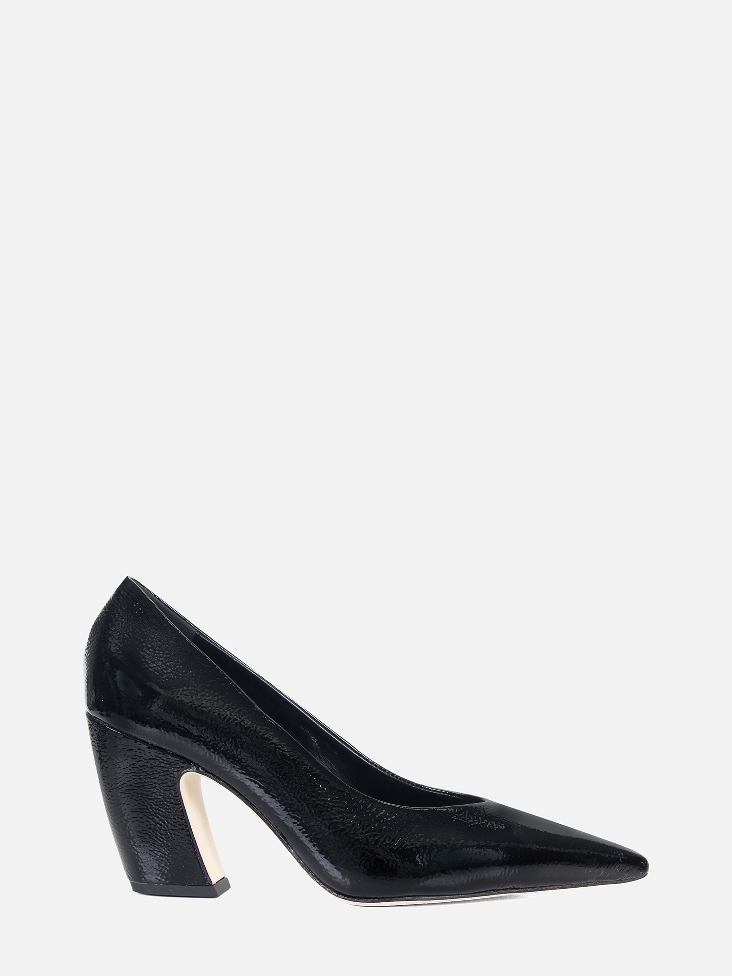 O Scarpin Venus é produzido em couro verniz com aspecto amassado. O modelo é um exemplo clássico de um sapato "high vamp", onde as laterais mais altas oferecem maior cobertura ao pé, criando um contraste interessante com o decote em V na parte frontal. Isso combinado com bico fino e com salto bloco tipo vírgula, proporcionam conforto enquanto o solado em couro contribui para a durabilidade do sapato.