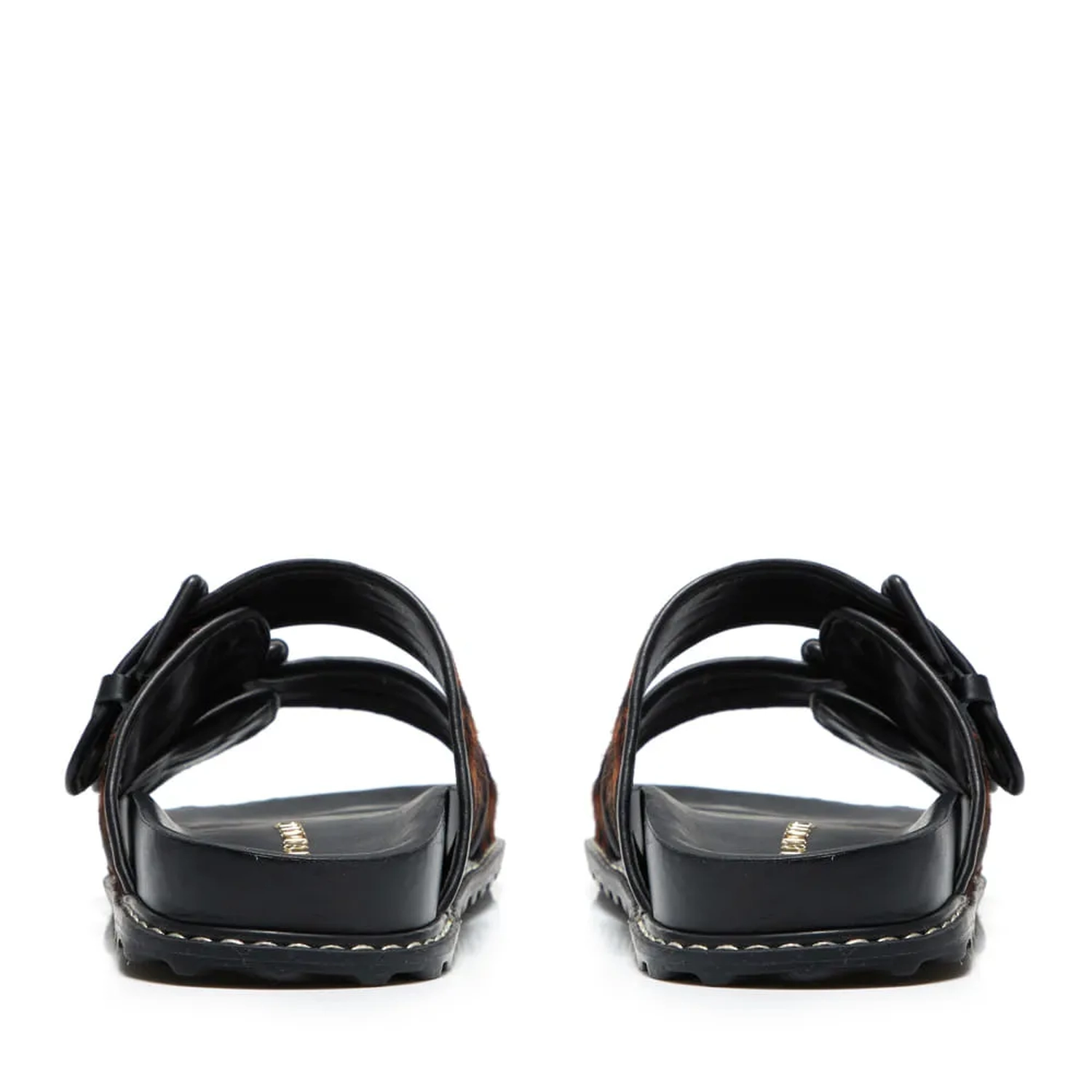O Slider Bari é confeccionado em couro. O protagonista no modelo é o conforto. Sua construção conta com cabedal em couro com aplicação de pelo com print animal, palmilha anatômica e solado tratorada. Os detalhes do debrum e o charme do banho das  fivelas ajustavéis arrematam a peça.