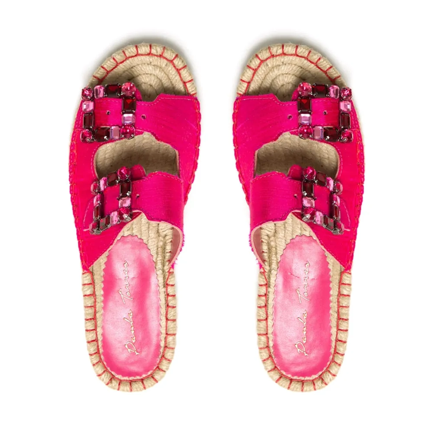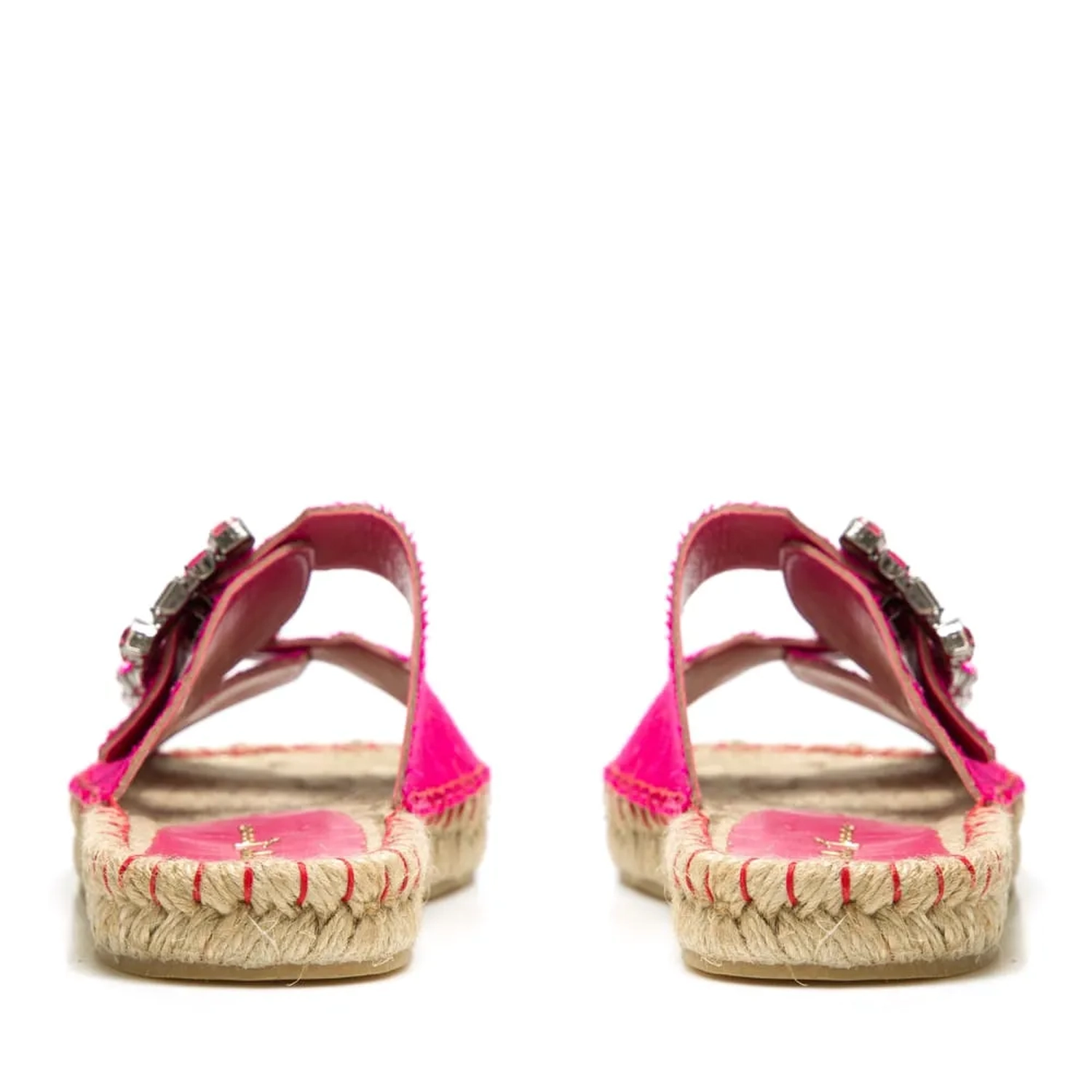 SLIDER LAOS ROSA O Slider Laos é produzido em tecido Shantung. O foco principal são as fivelas em cristais, buscando referências vintage, mas com foco na praticidade. Palmilha em corda com pesponto na cor do cabedal.