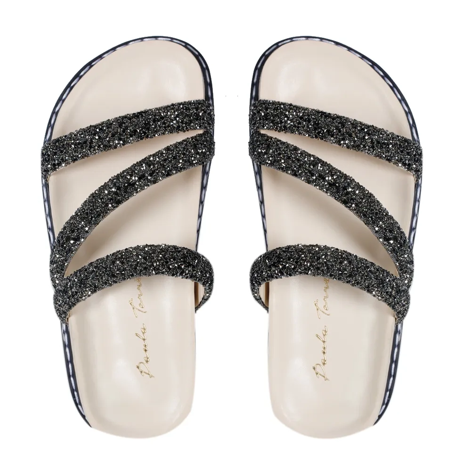 A Slider Sofia é confeccionada em couro. O cabedal é composto por três tiras de couro com aplicação de cristais pretos, combinando com a cor da sola. O modelo Sofia apresenta glamour e conforto, completamente Paula Torres.