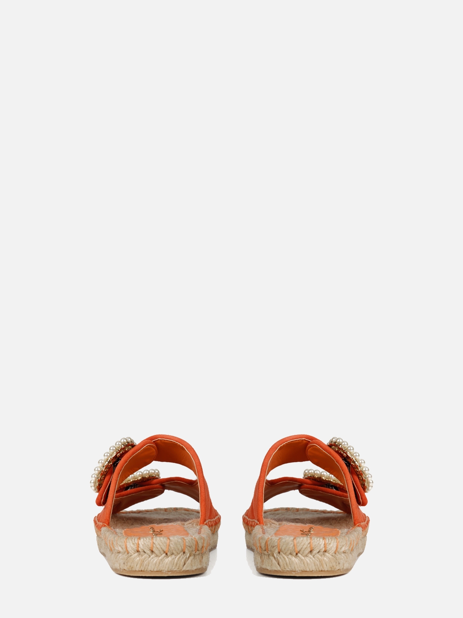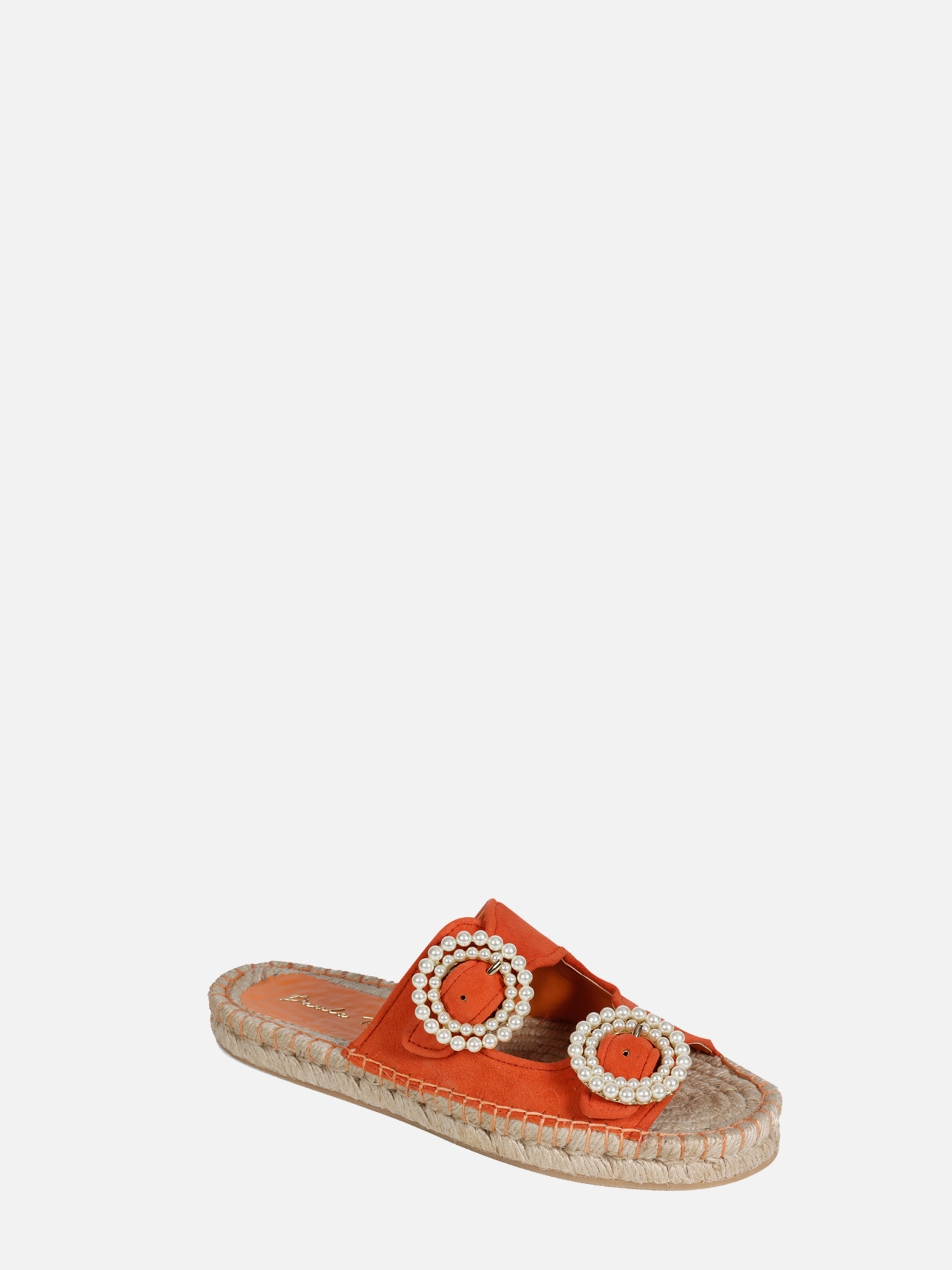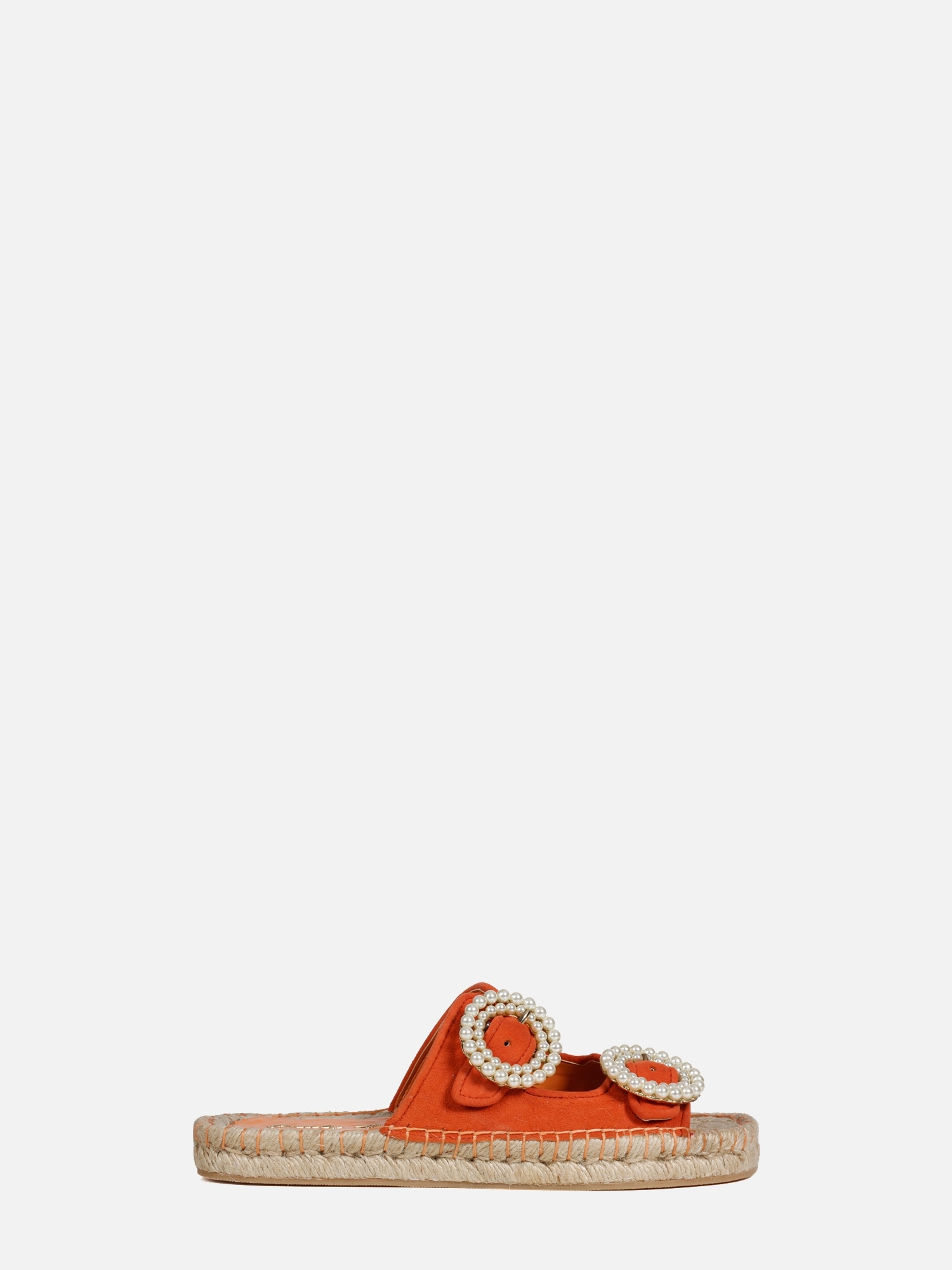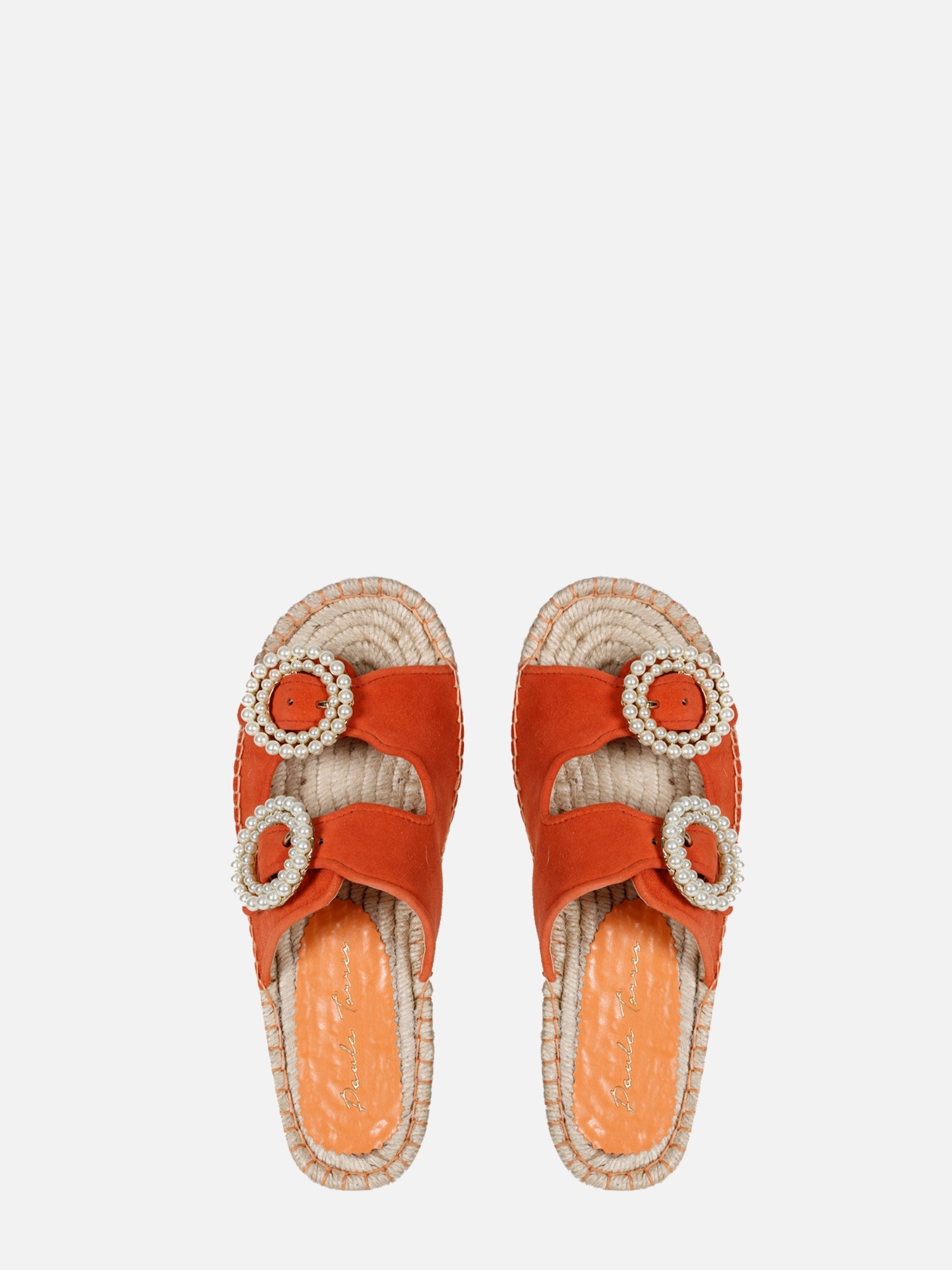 A Slider Zoe é confeccionada em camurça. Modelagem em bico redondo com o solado de borracha revestido por corda. As duas tiras grossas no cabedal trazem um toque suave, que contrasta com a aplicação de pérolas sobre a fivela ajustável de formato circular. O mix de texturas cria uma estética confortável e elegante, totalmente Paula Torres.
