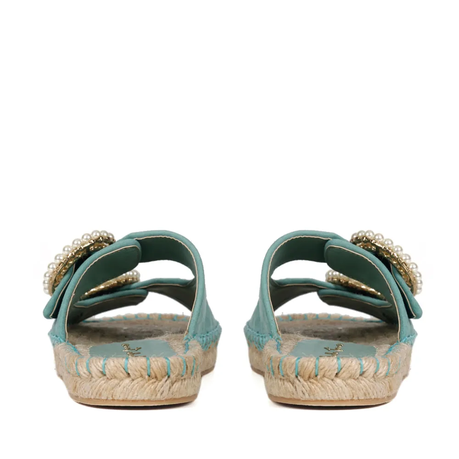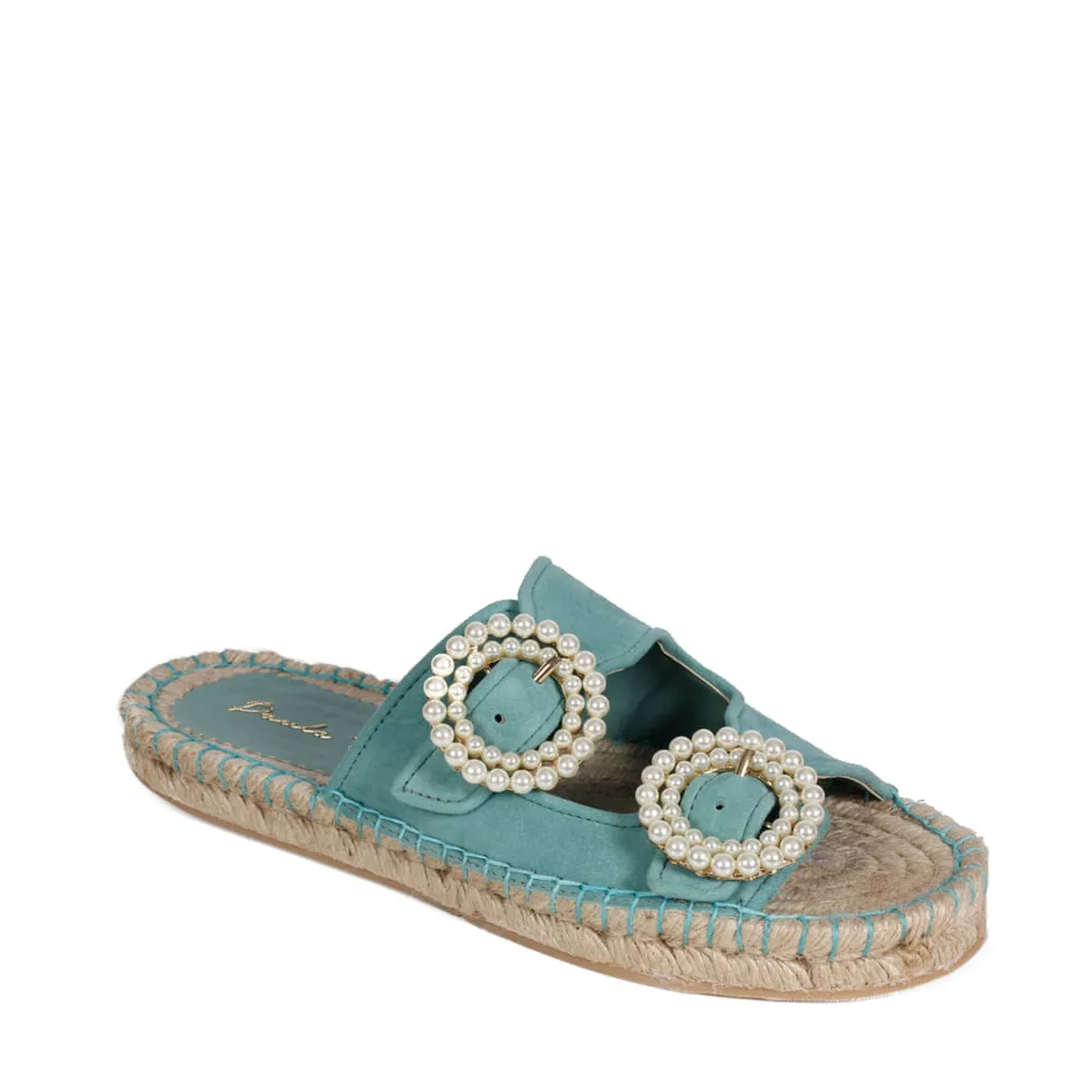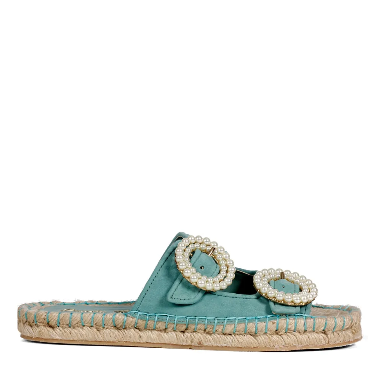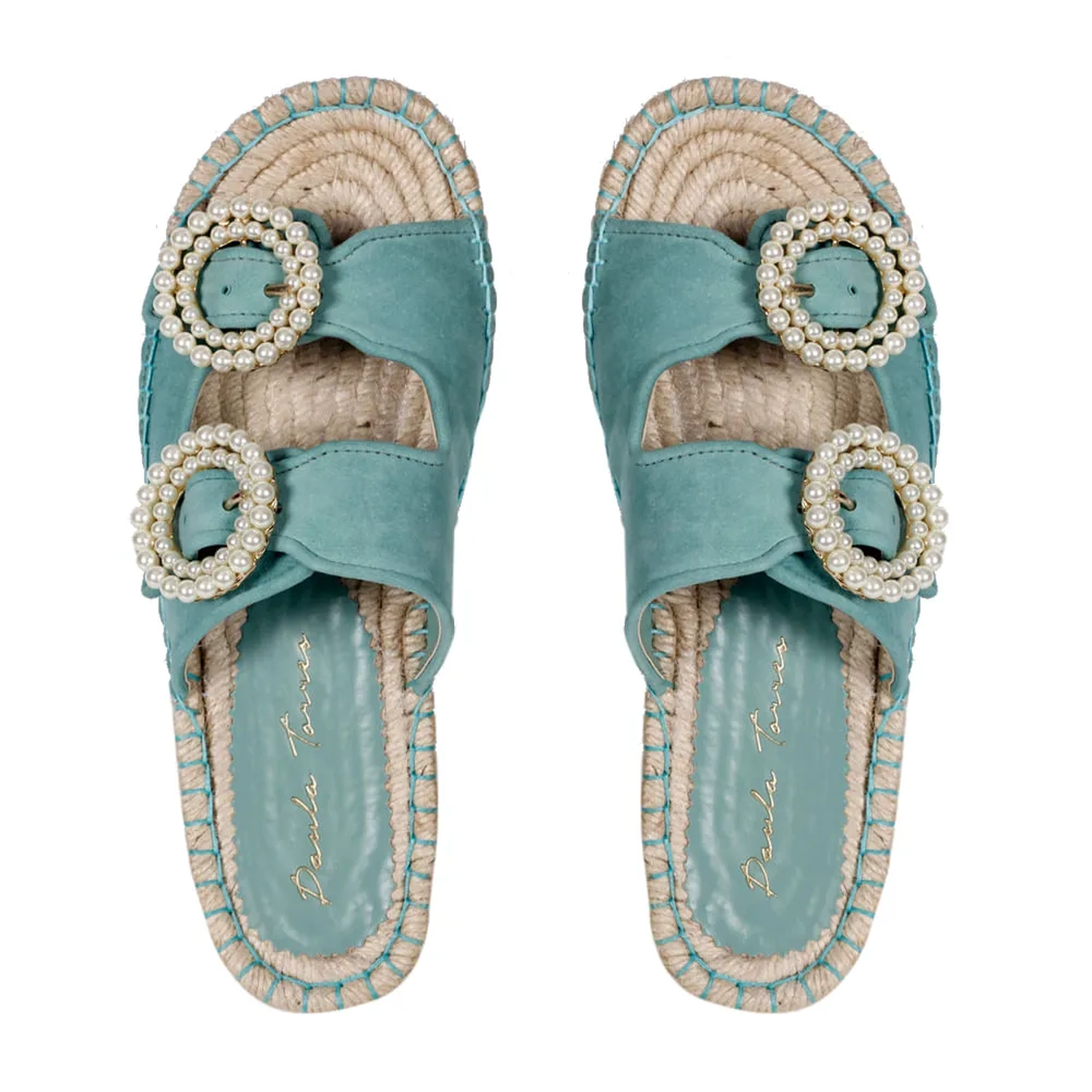 A Slider Zoe é confeccionada em camurça. Modelagem em bico redondo com o solado de borracha revestido por corda. As duas tiras grossas no cabedal trazem um toque suave, que contrasta com a aplicação de pérolas sobre a fivela ajustável de formato circular. O mix de texturas cria uma estética confortável e elegante, totalmente Paula Torres.