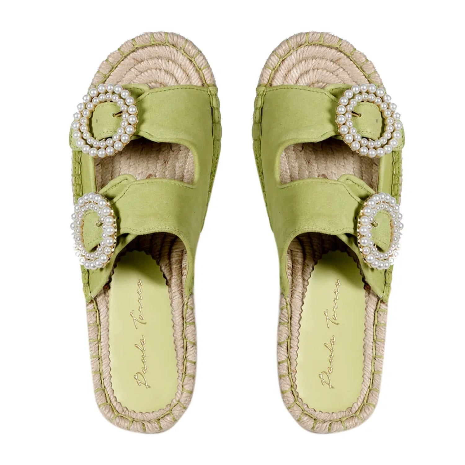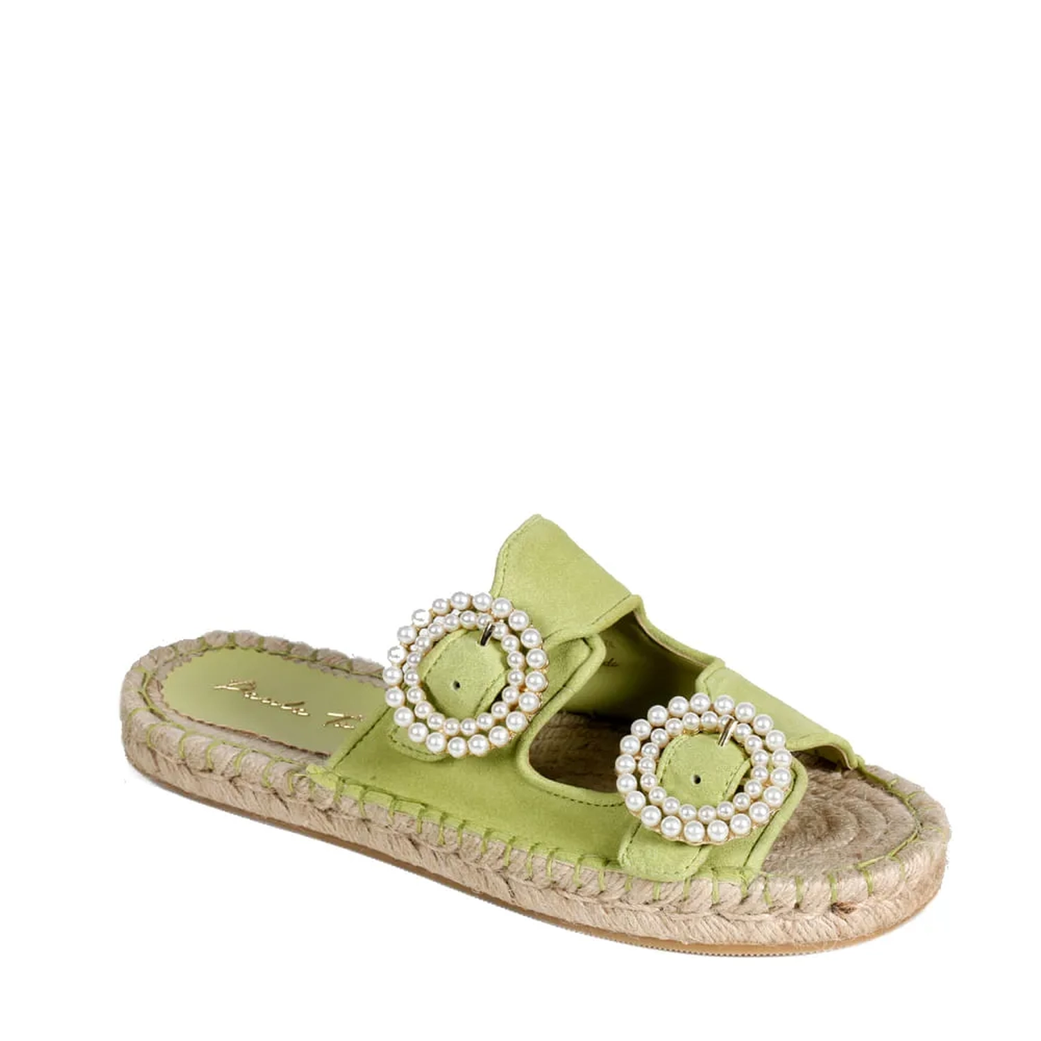 A Slider Zoe é confeccionada em camurça. Modelagem em bico redondo com o solado de borracha revestido por corda. As duas tiras grossas no cabedal trazem um toque suave, que contrasta com a aplicação de pérolas sobre a fivela ajustável de formato circular. O mix de texturas cria uma estética confortável e elegante, totalmente Paula Torres.