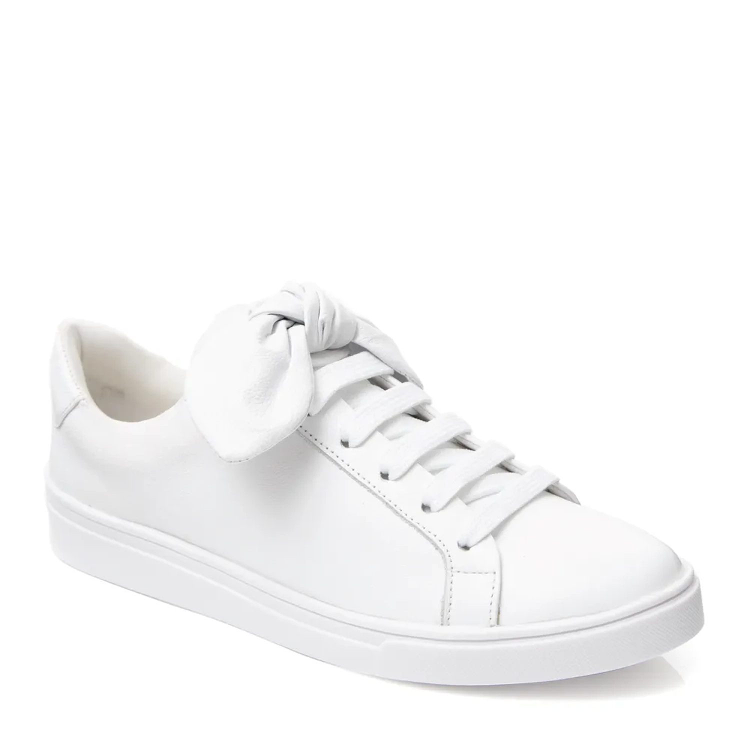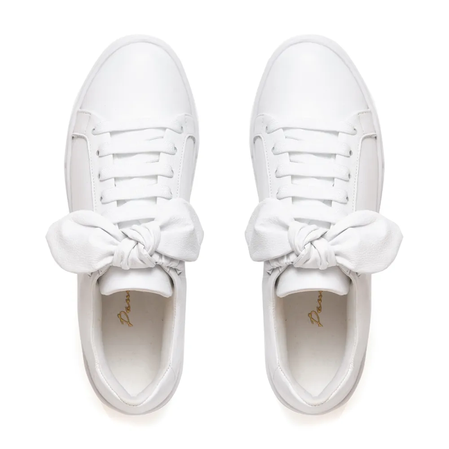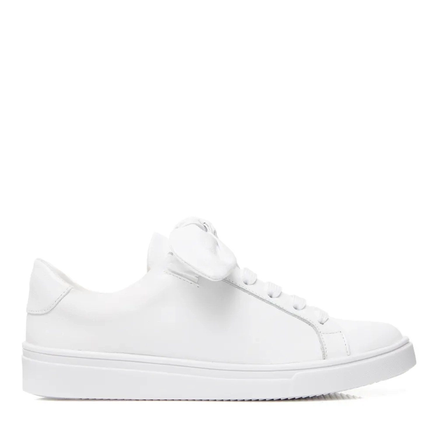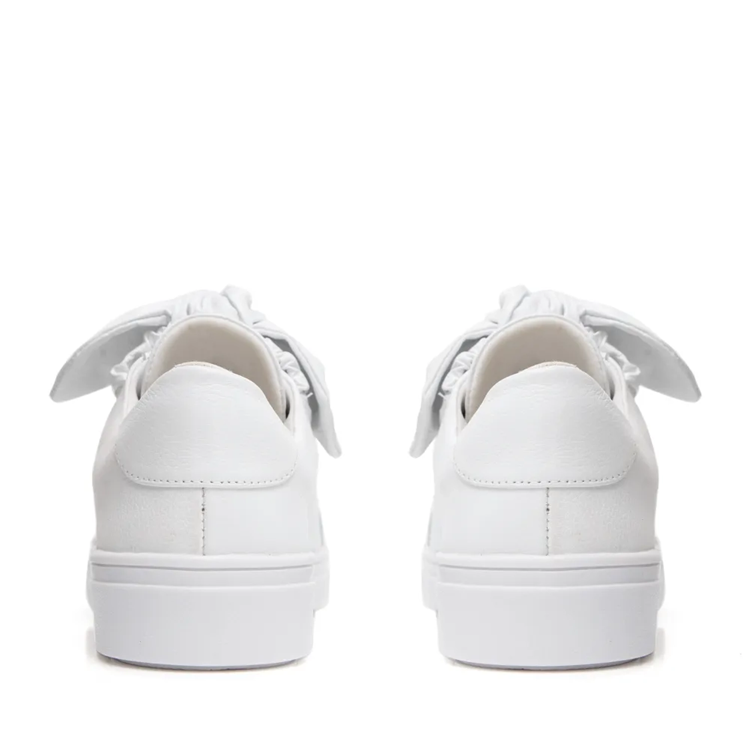 Tênis Lola em couro branco. A peça no modelo flatfom possui bico arredondado, solado emborrachado e fechamento por cadarço. O detalhe do laço frontal é moderno e traz estilo para um produção monocromática. Cor: Branco